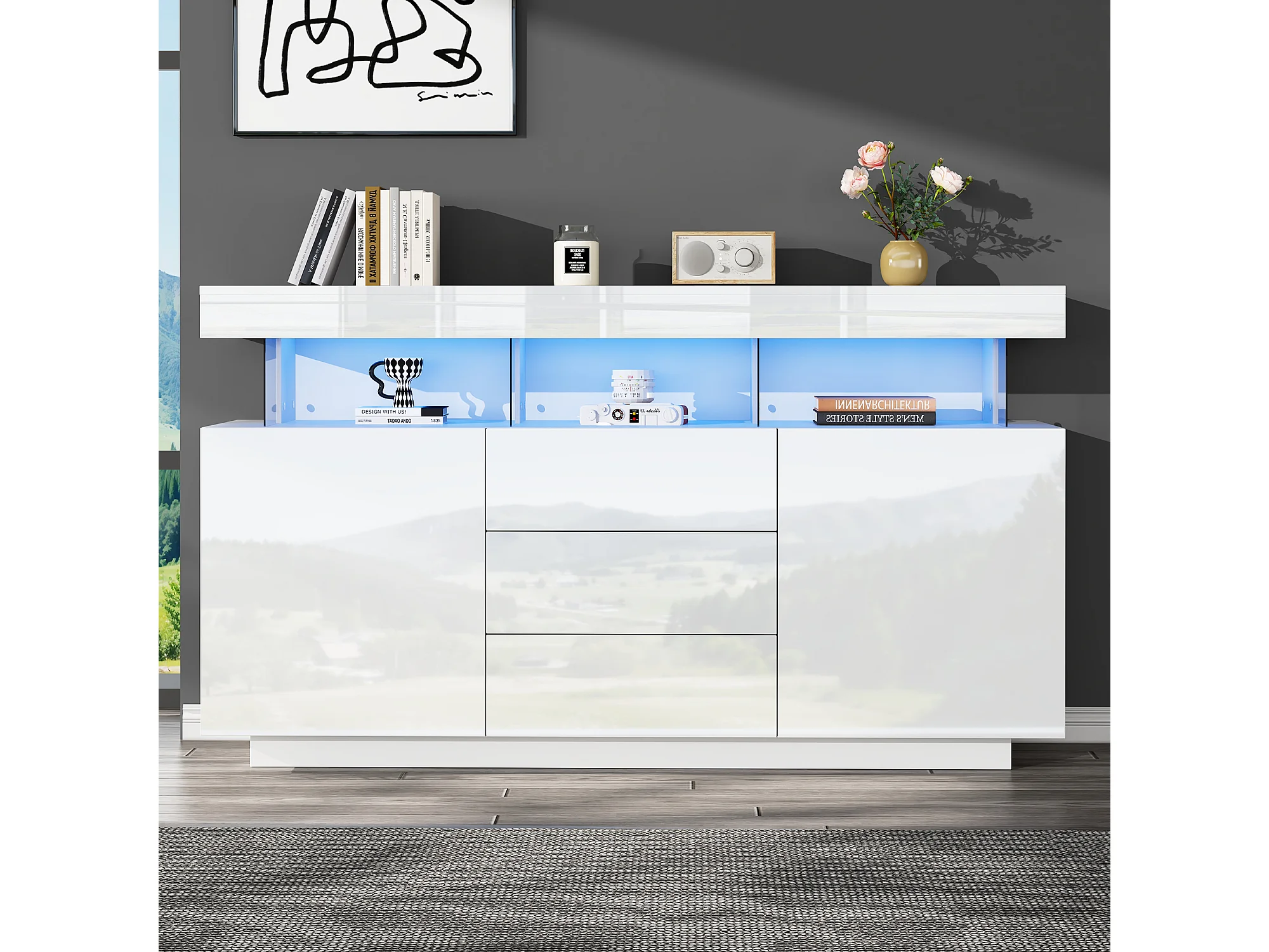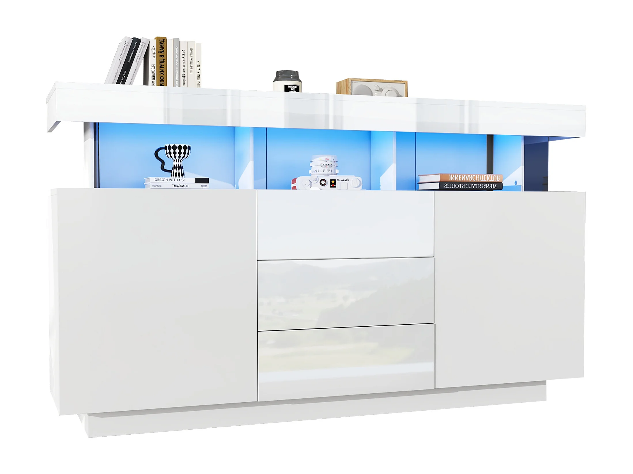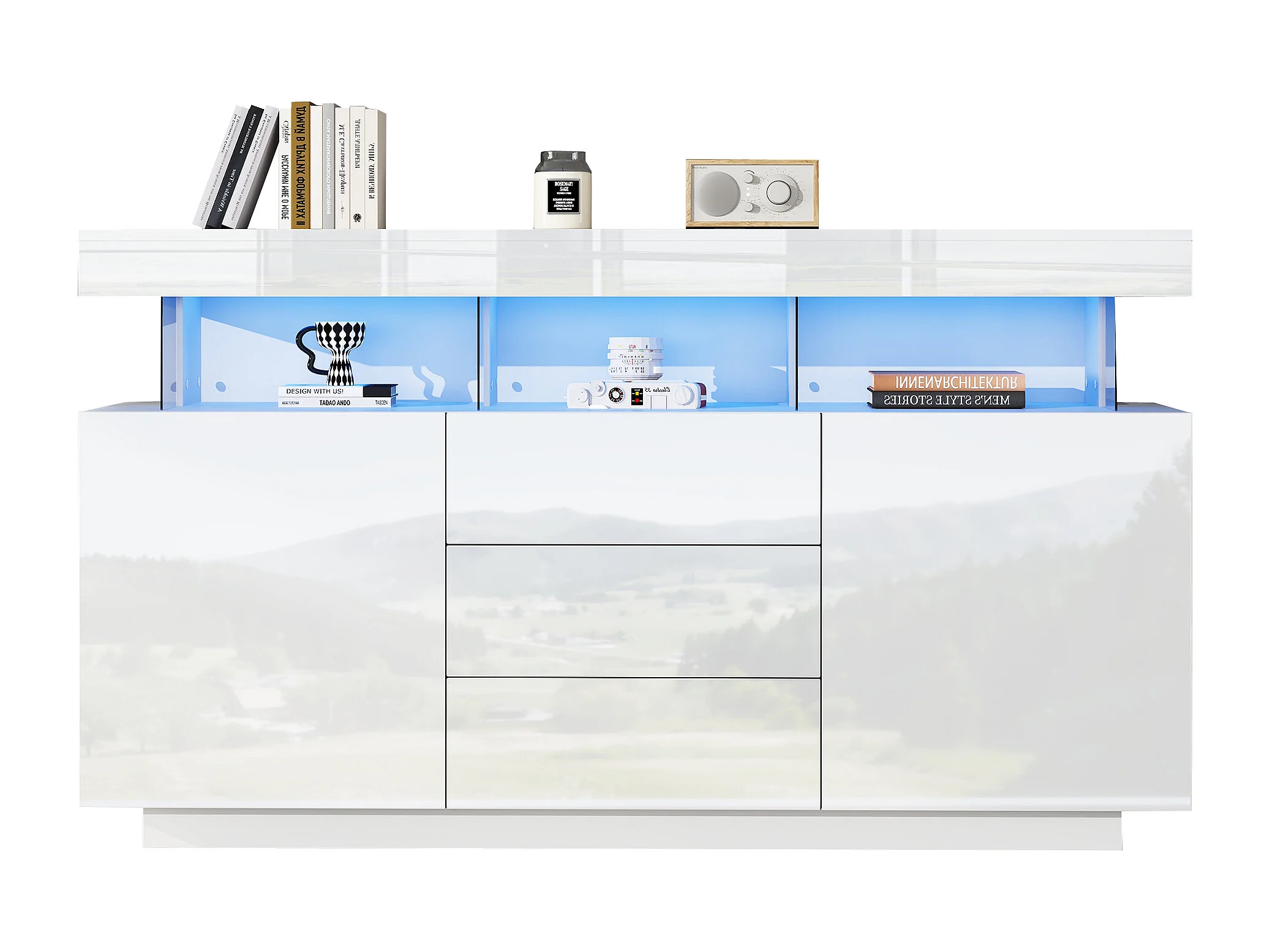 Aparador LED con 2 puertas y 3 cajones, MDF, Blanco, (150x35x80 cm)