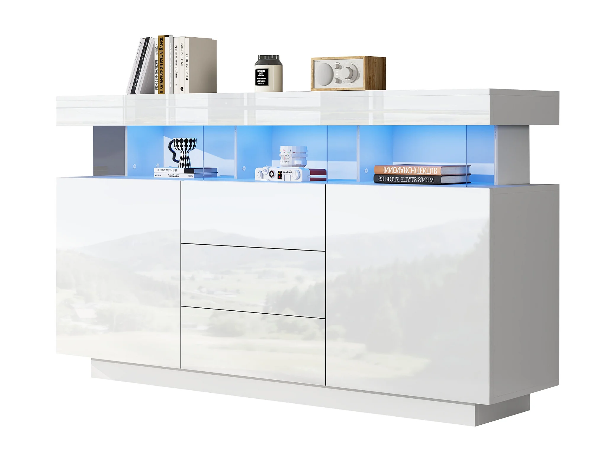 Aparador moderno con LED, 3 cajones, 2 puertas, 2 estantes abiertos, MDF, blanco y madera clara (140x35x80 cm)