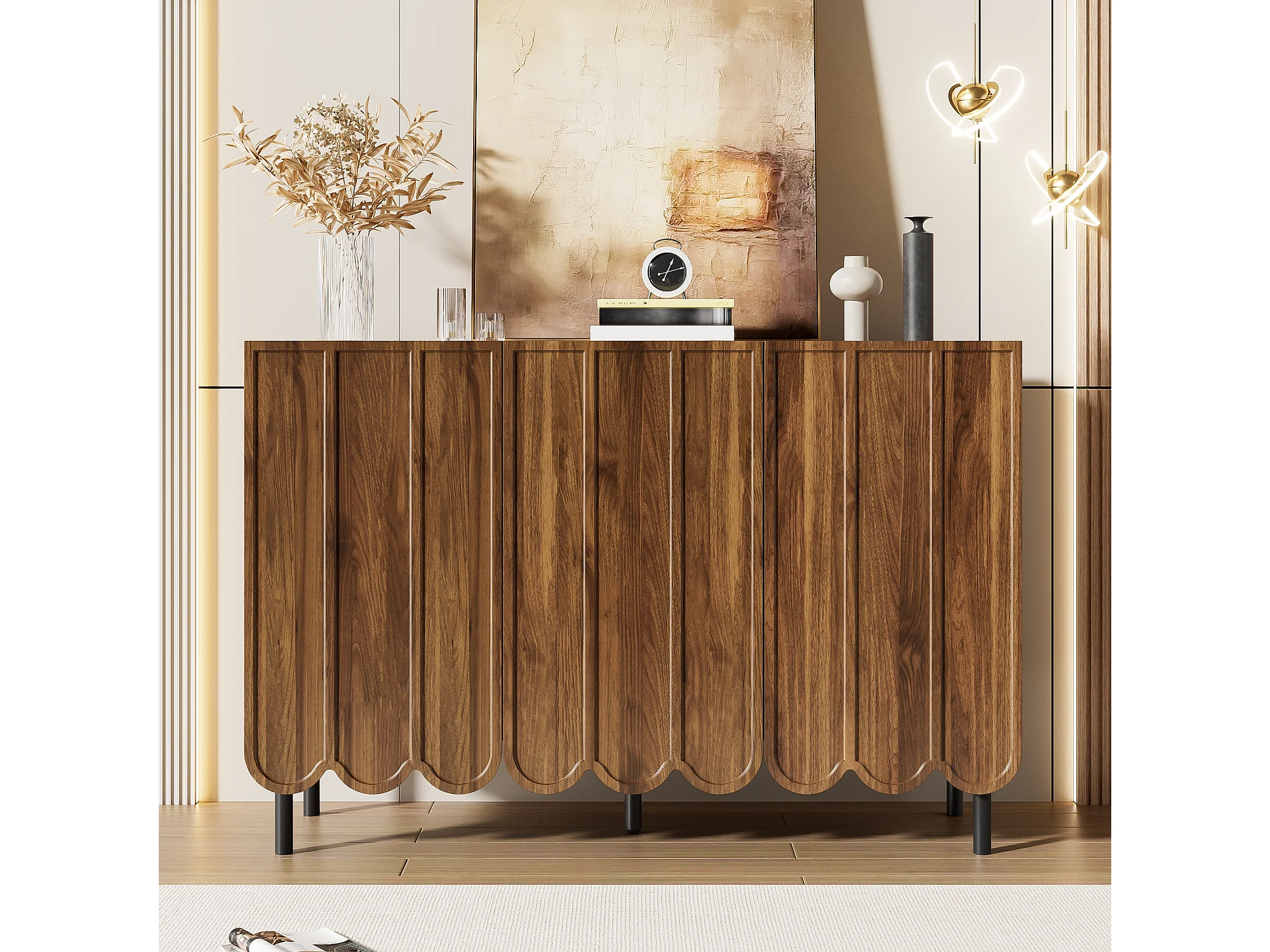Aparador moderno de madera con puertas onduladas, diseño limpio, MDF, color nogal (120x35x80 cm)