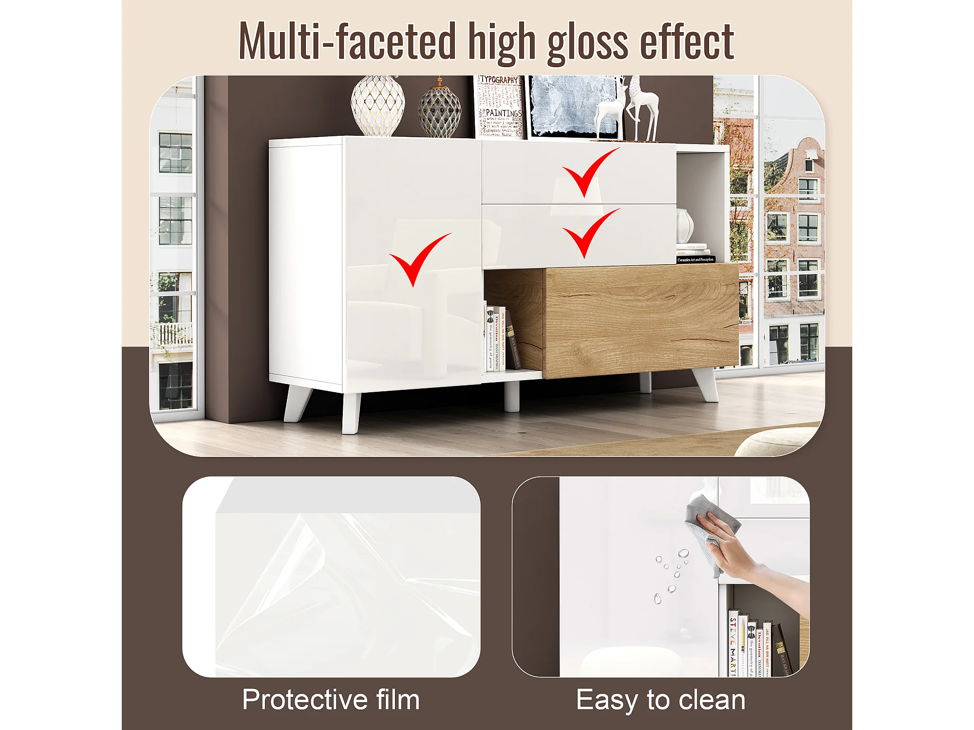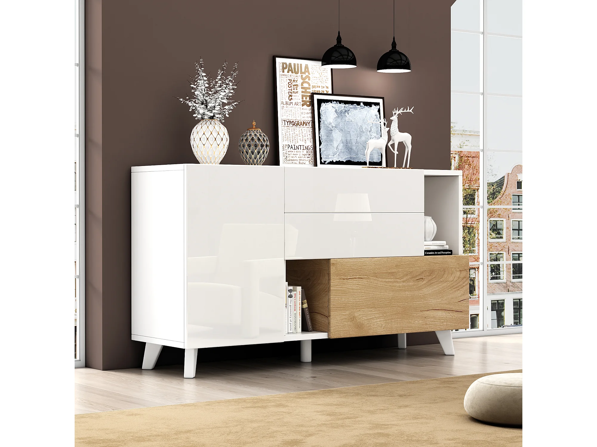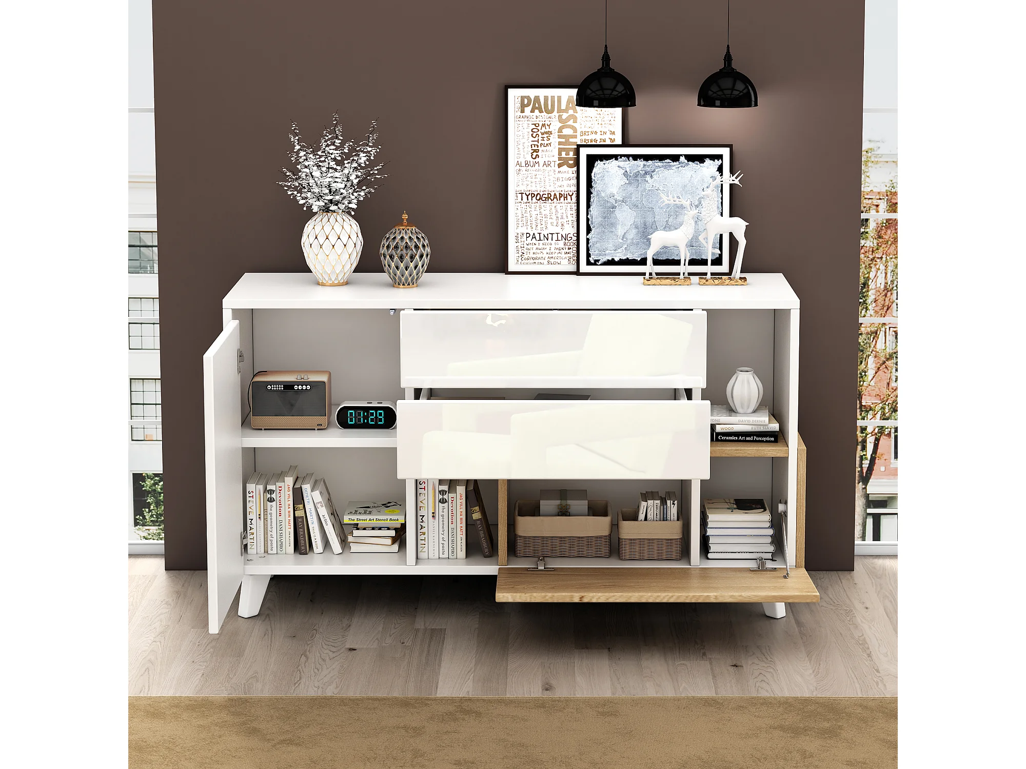 Aparador moderno madera MDF blanco brillo almacenaje salón comedor 130cm