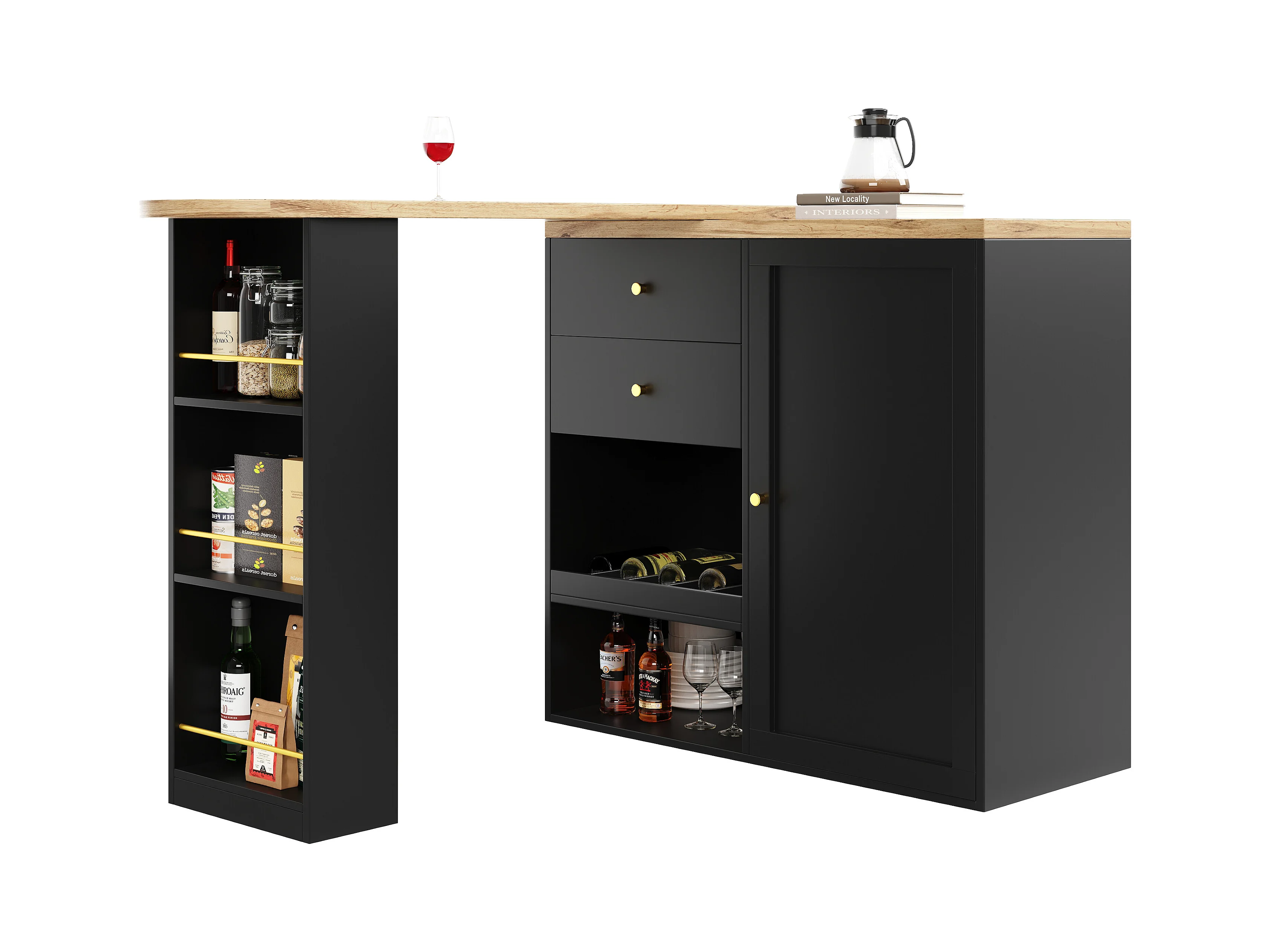 Mueble de bar giratorio 360° y plegable - con 4 cajones y 1 puerta - estantes abiertos - negro + natural