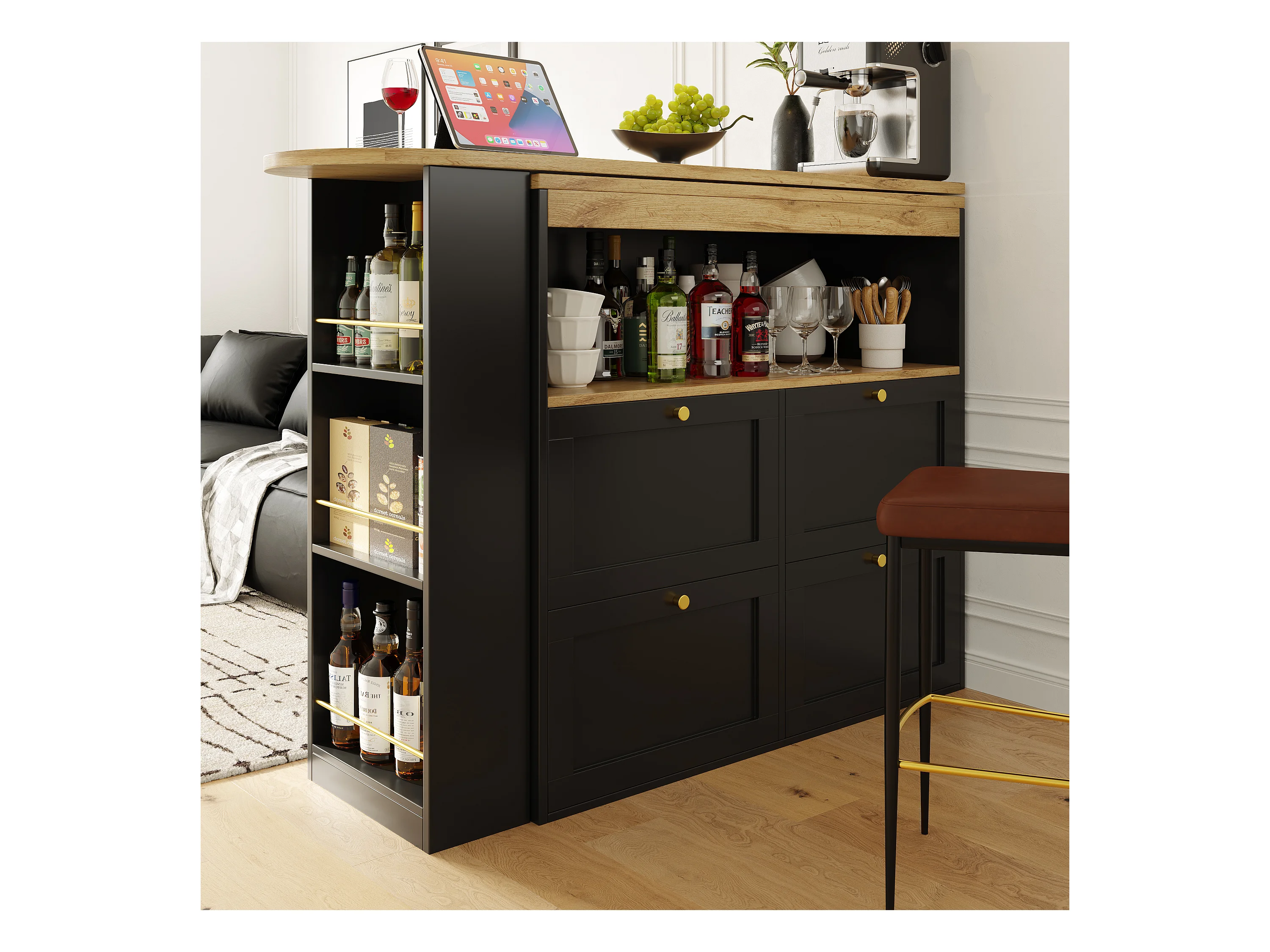 Mueble de bar giratorio 360° y plegable - con 4 cajones y 1 puerta - estantes abiertos - negro + natural