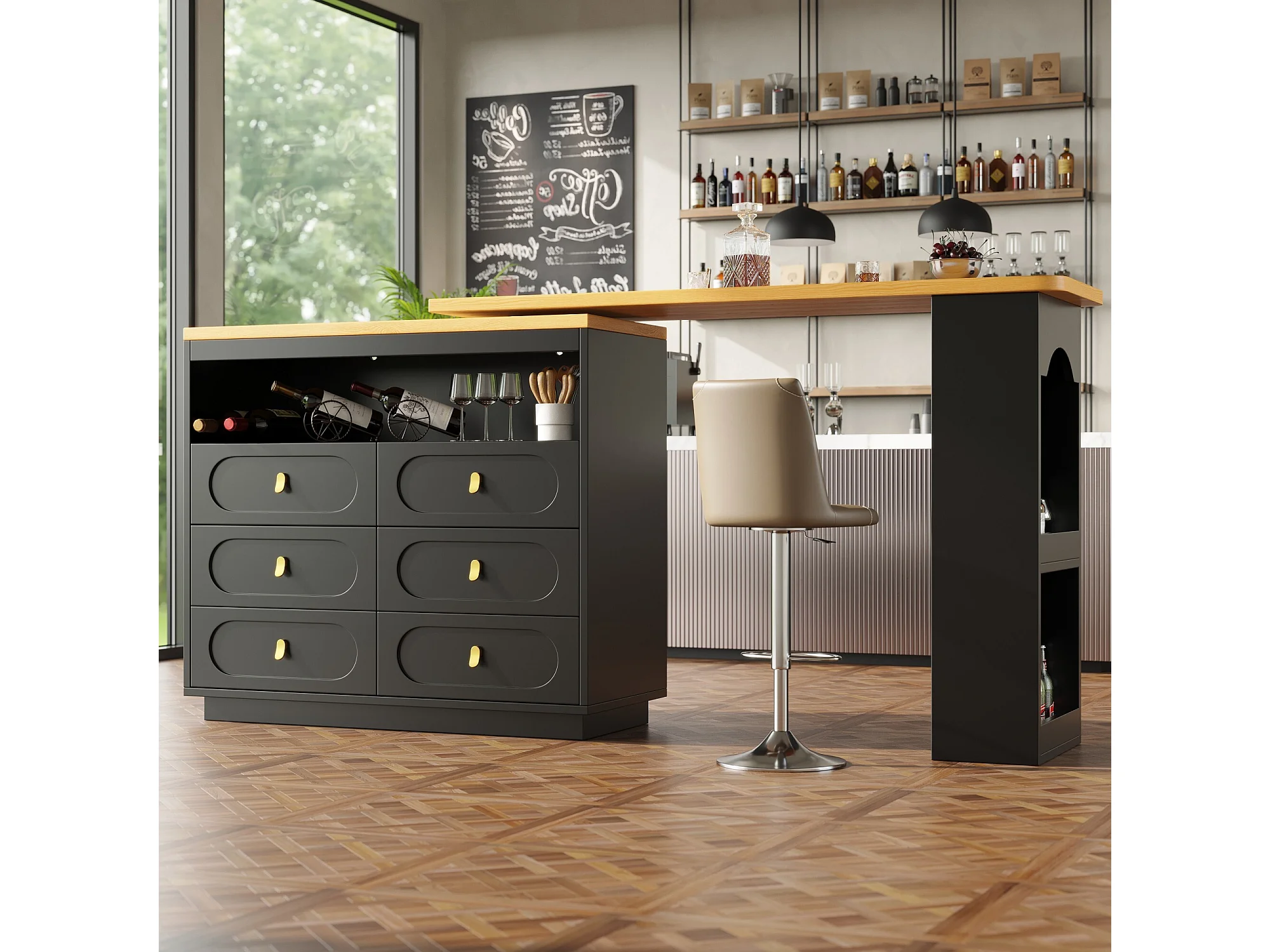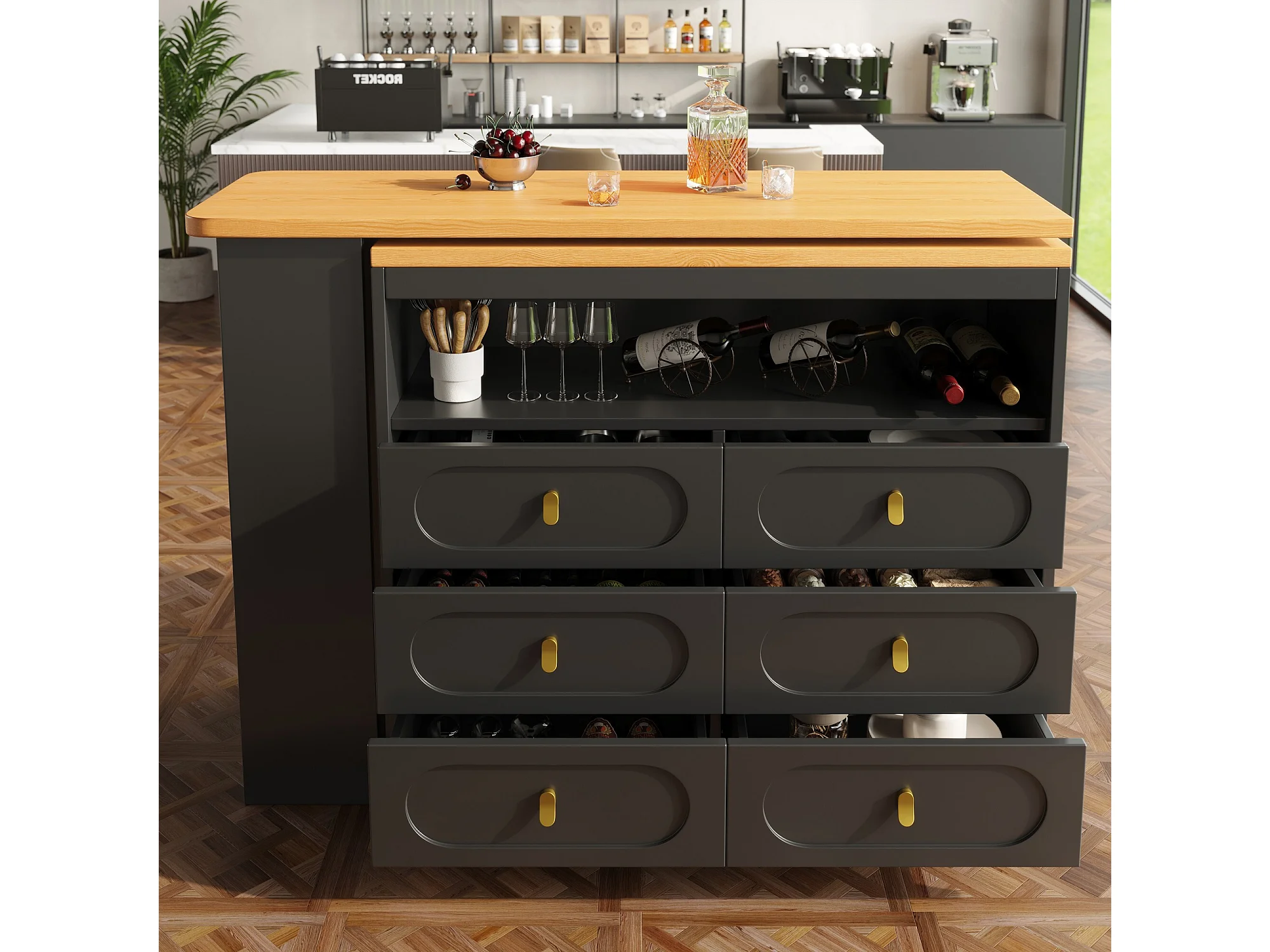 Aparador negro, aparador de cocina con encimera extensible, 6 cajones y espacio de almacenamiento abierto - MDF