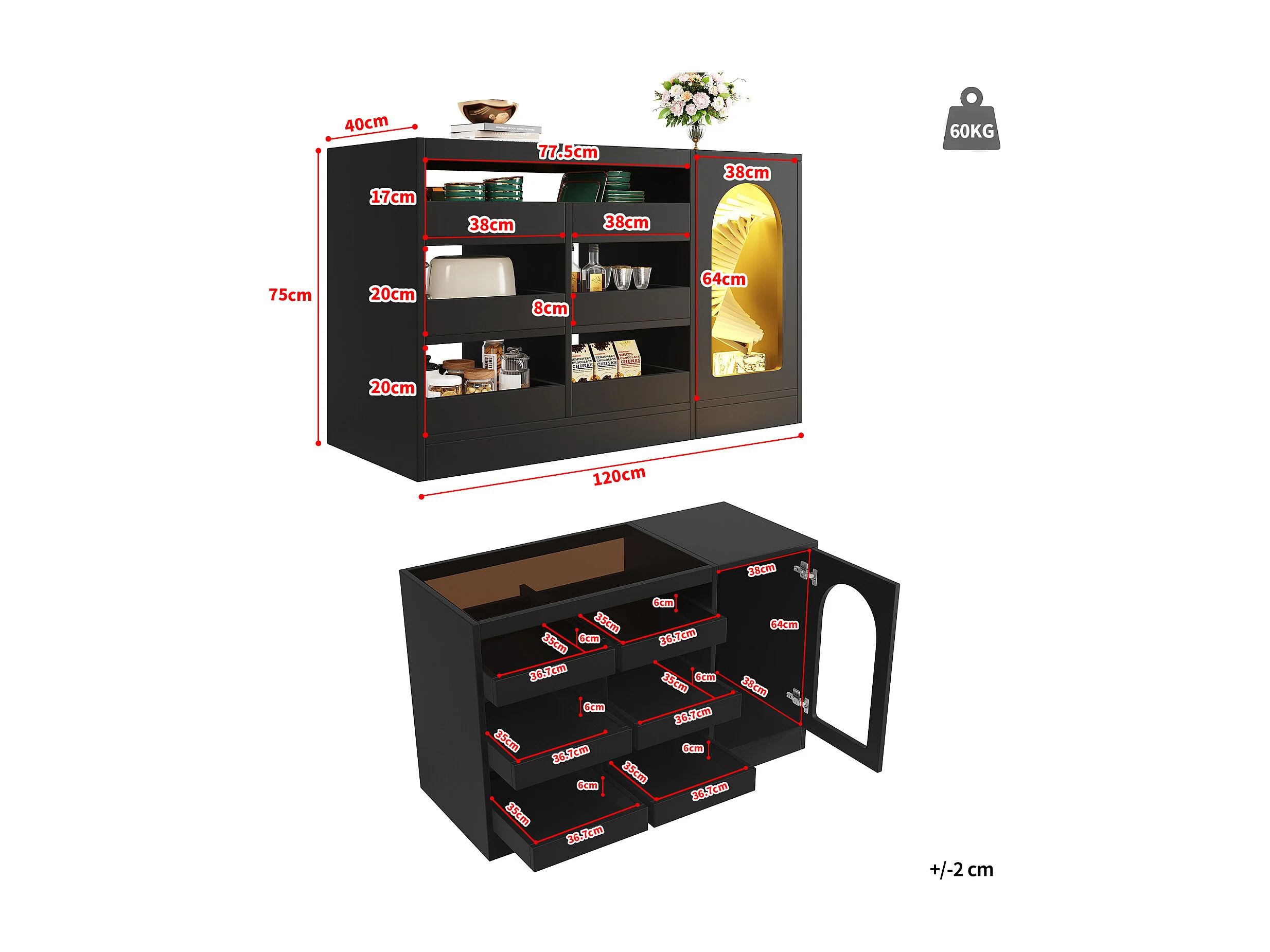 Aparador negro con cristal, 6 estantes correderos, puerta calada, para cocina, comedor, salón