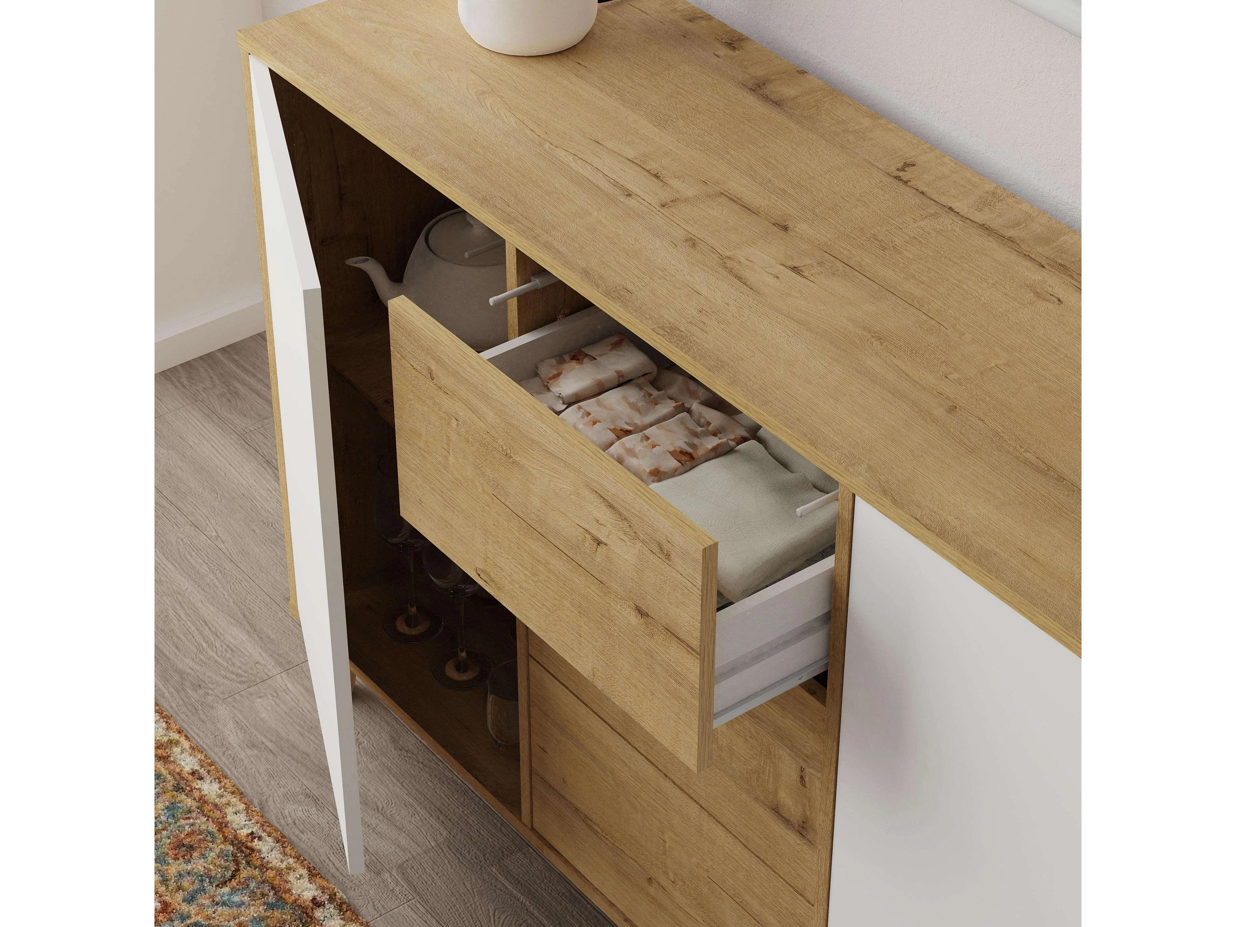 Aparador Oslo 3 cajones y 2 puertas roble gold y blanco mate 89x140x40 cm