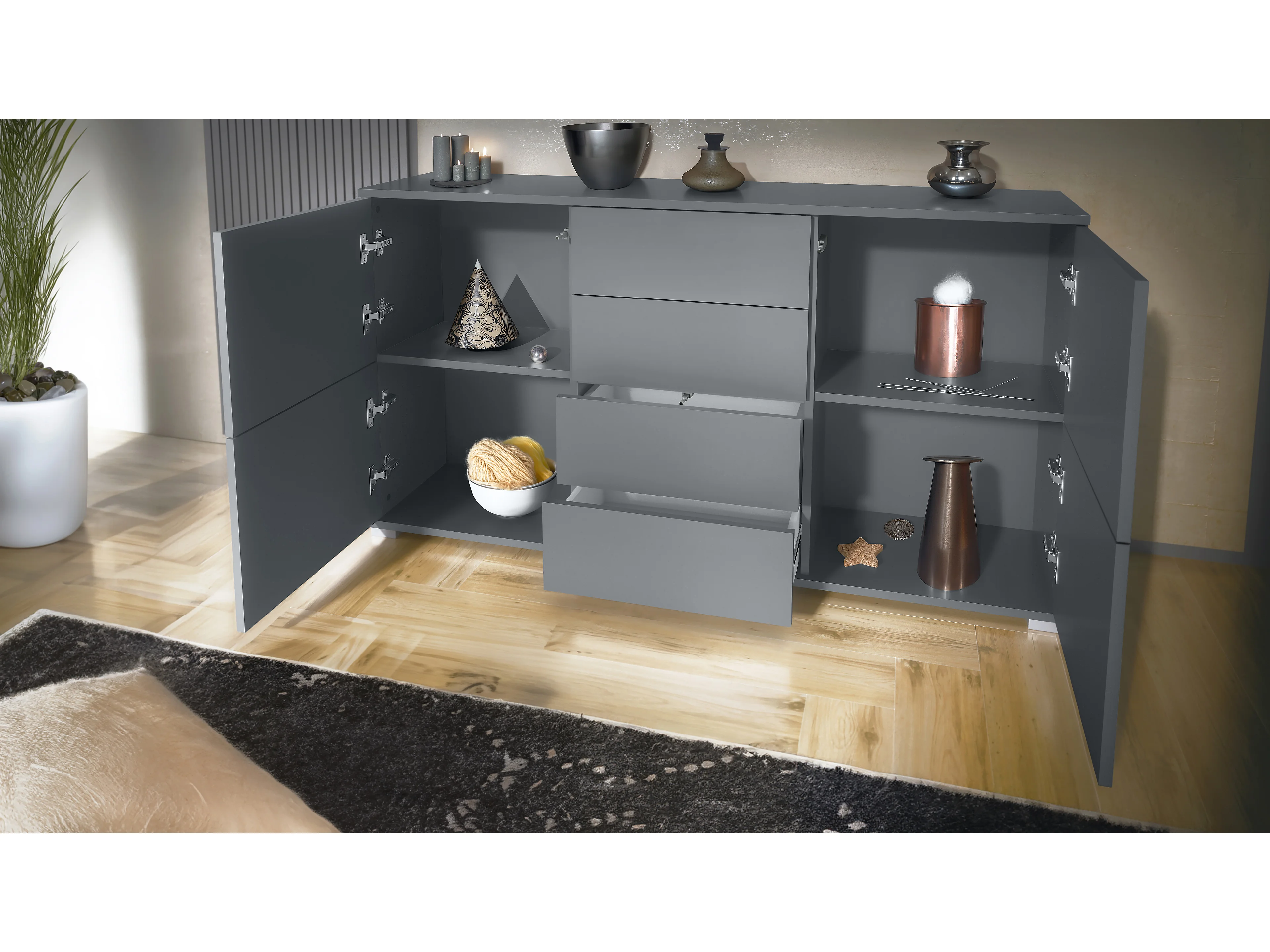 Aparador Rova V1 – Mueble con 4 Puertas y 4 Cajones, antracita mate/blanco mate (138,5 x 75,5 x 35)