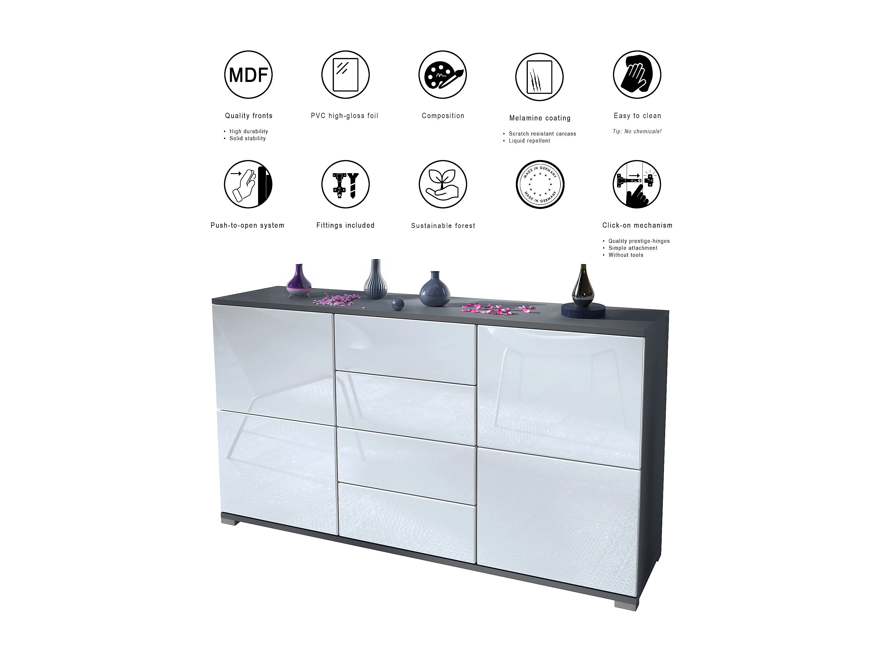 Aparador Linio V1, Mueble con 2 puertas y 4 cajones, antracita mate / blanco de alto brillo (138,5 x 75,5 x 35 cm)