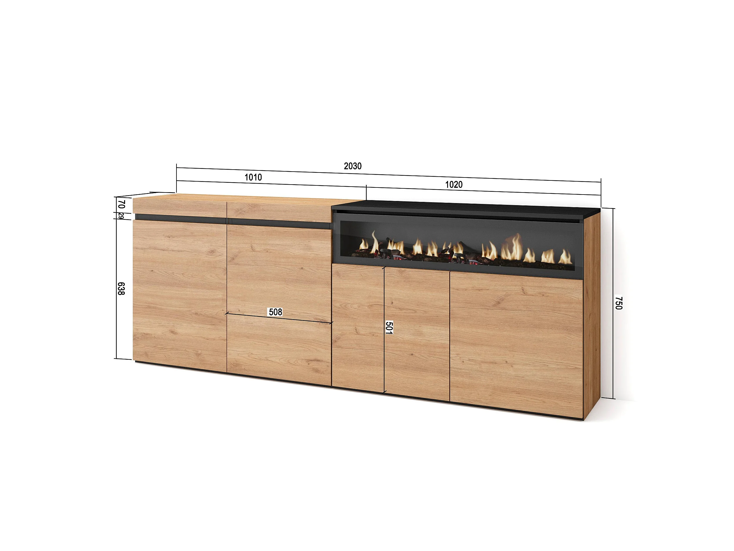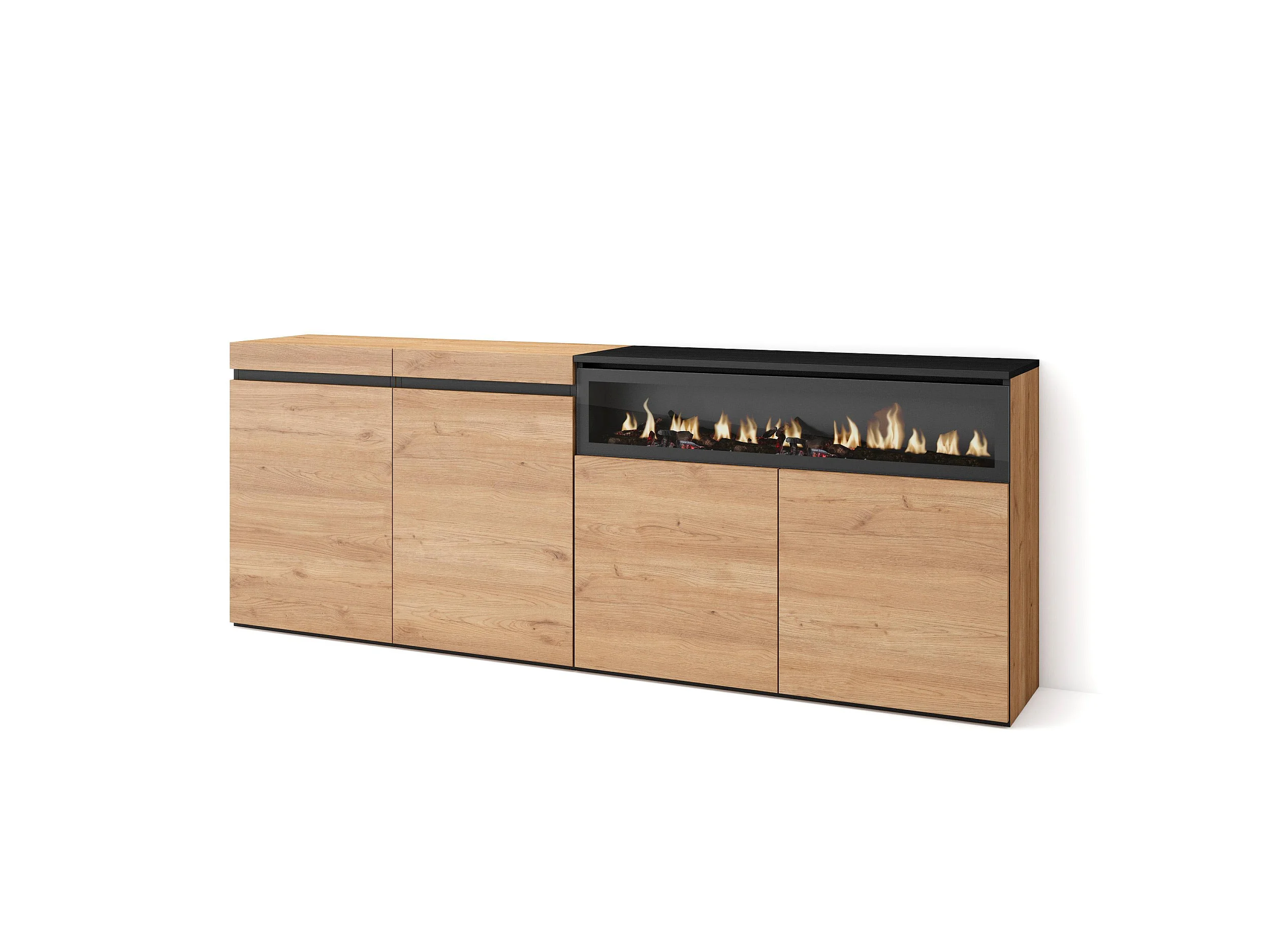 Aparadores para salón, 200x35x75cm, 4 Puertas, Chimenea eléctrica, Roble y negro