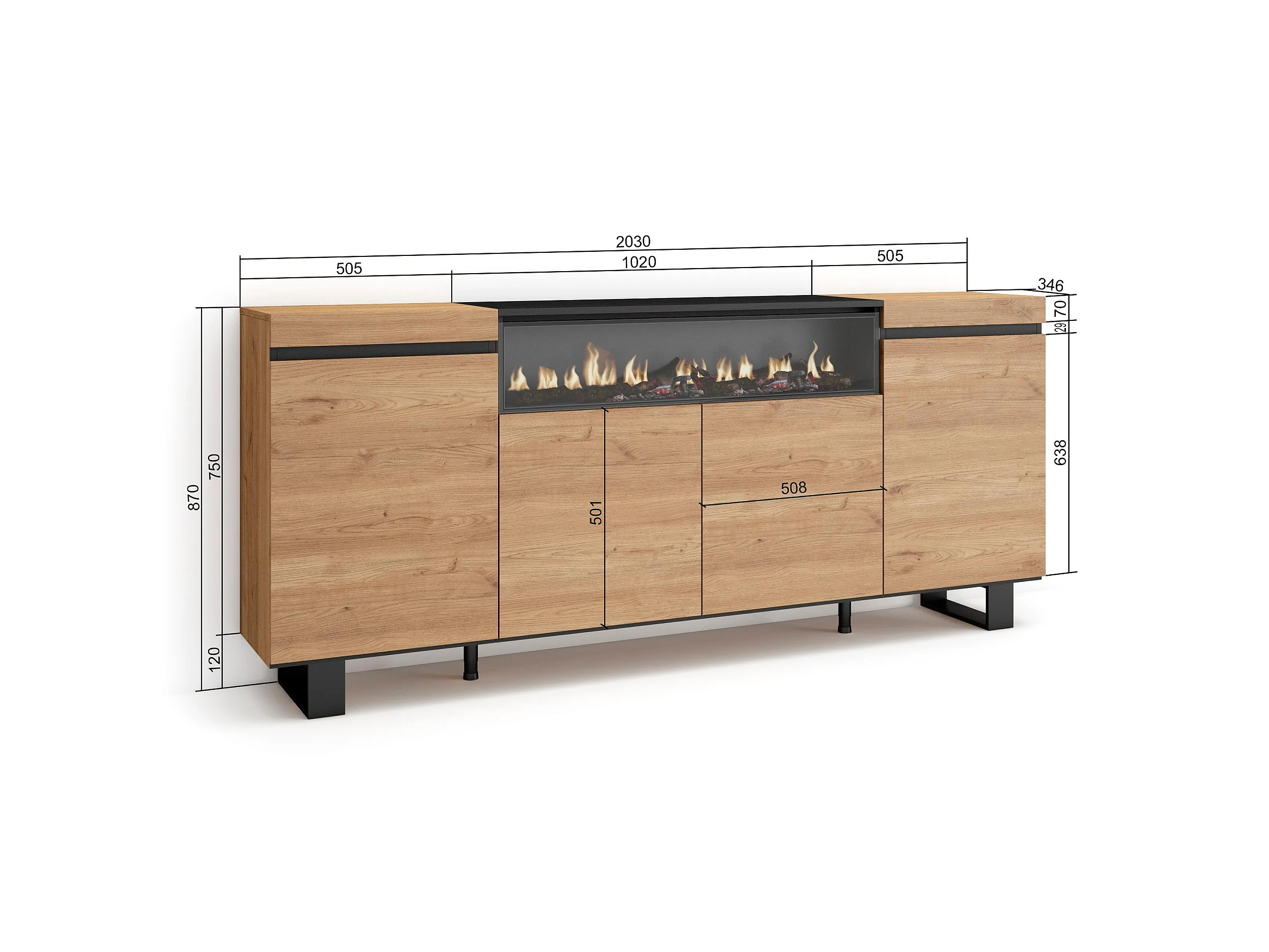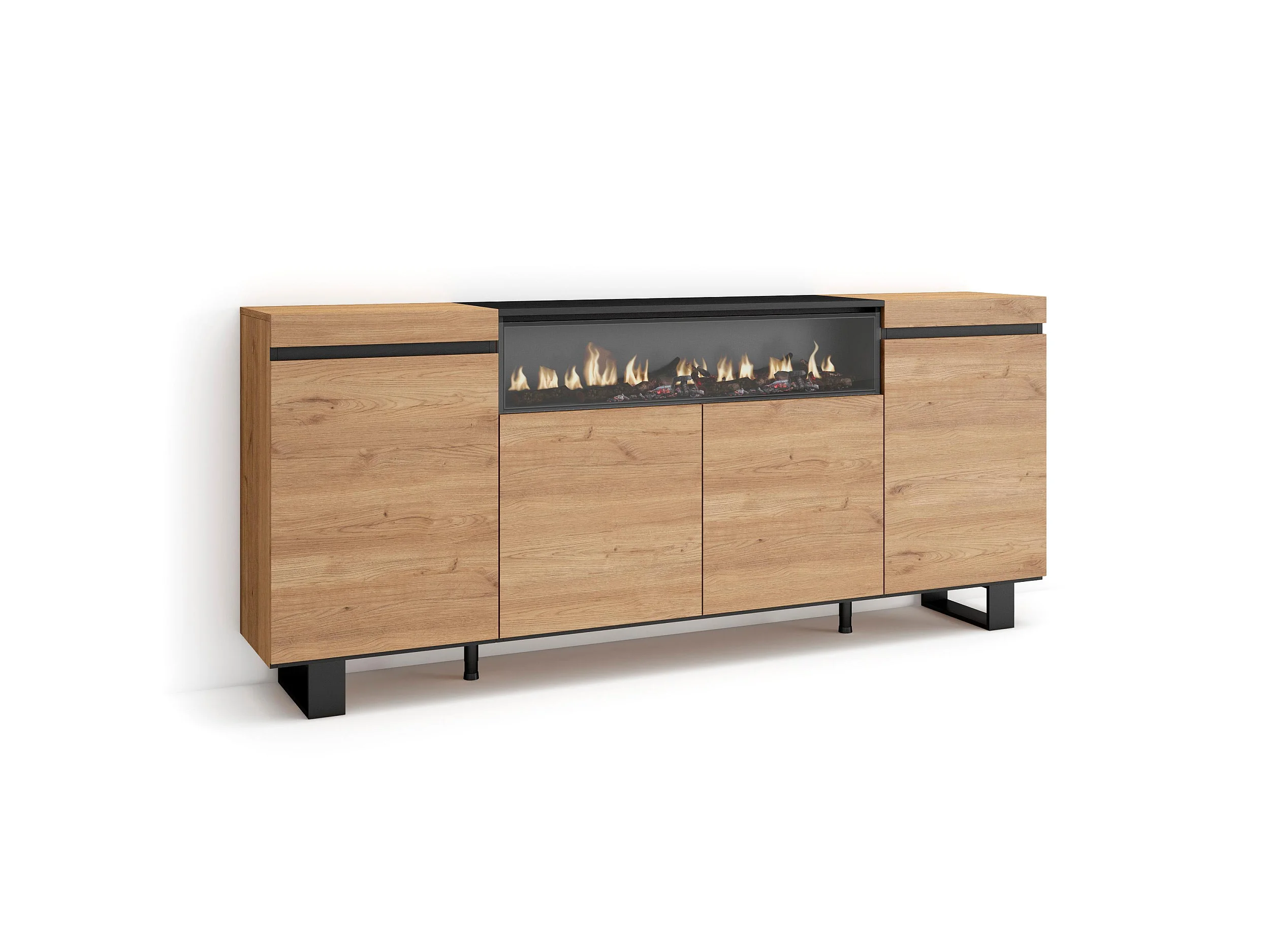 Aparadores para salón, 200x35x87cm, 4 Puertas, Chimenea eléctrica, Diseño industrial, Roble y negro