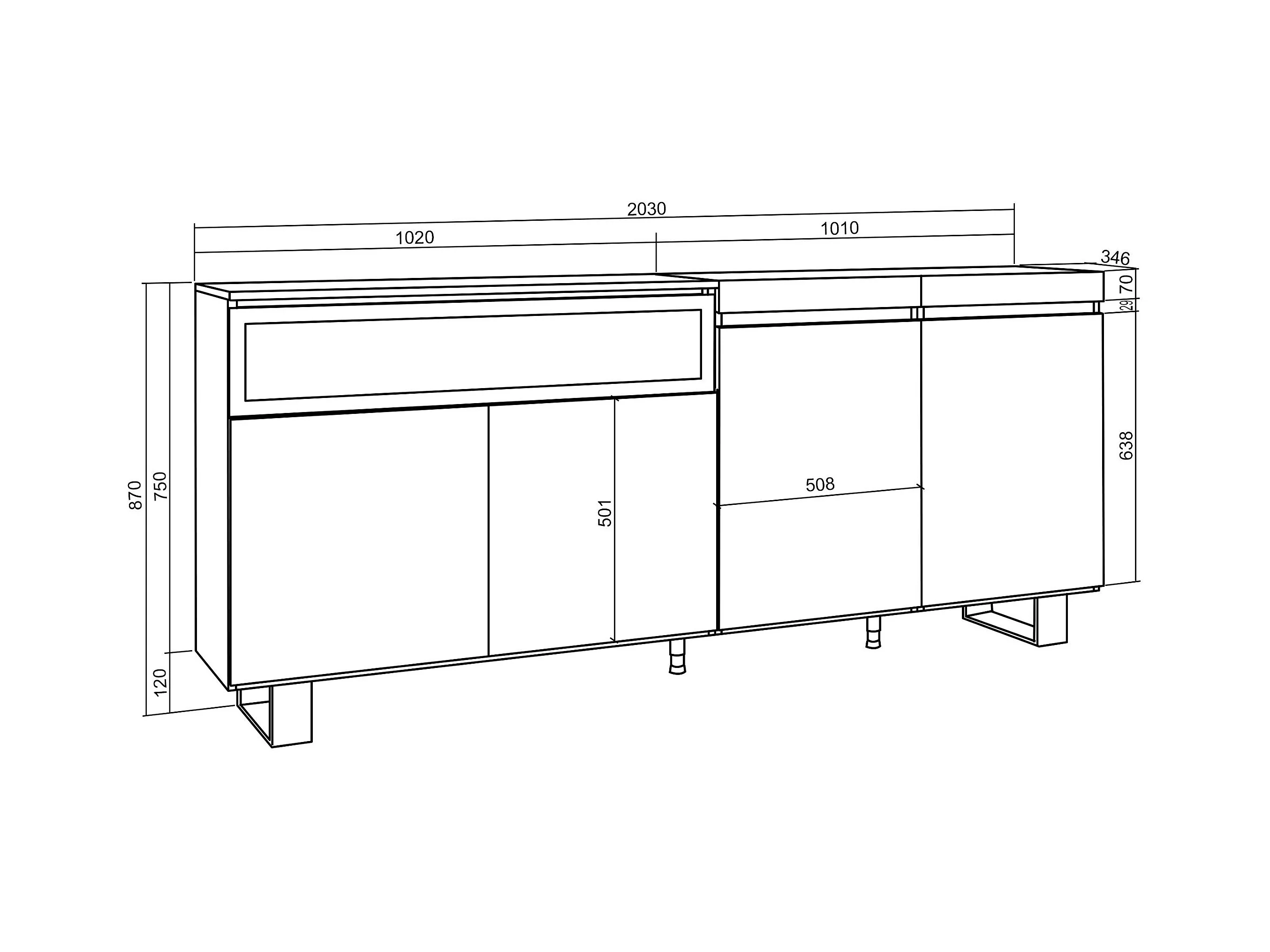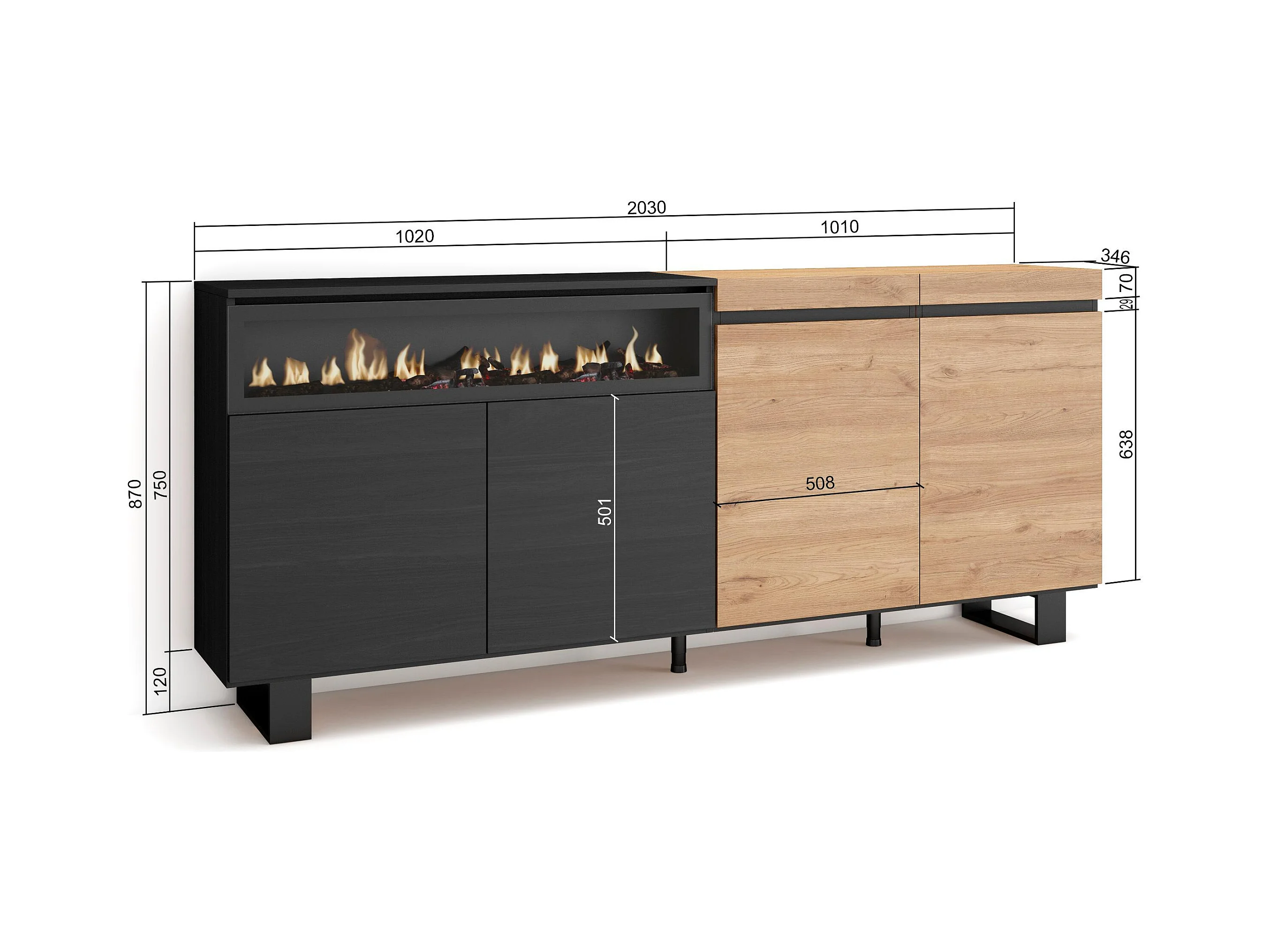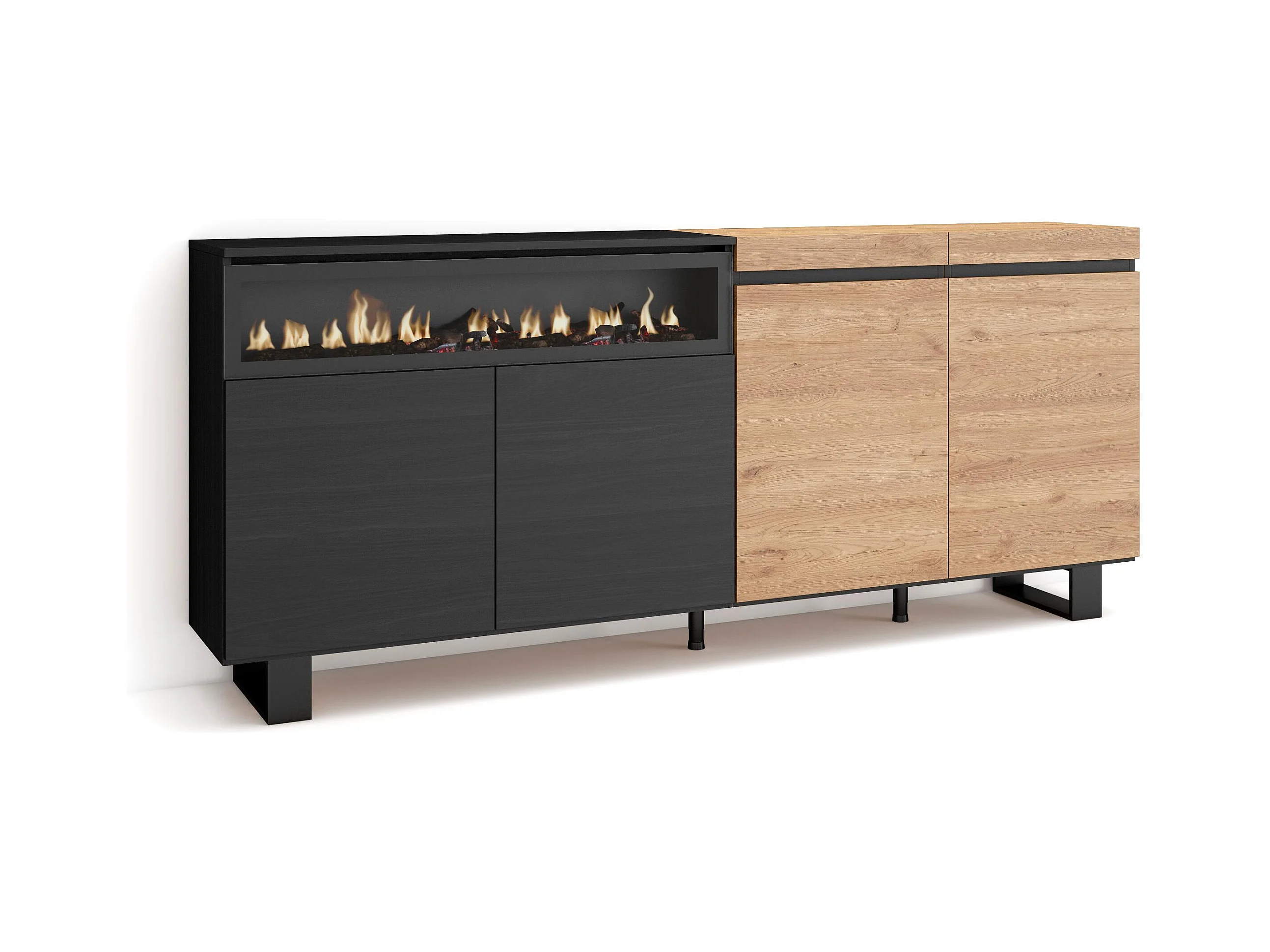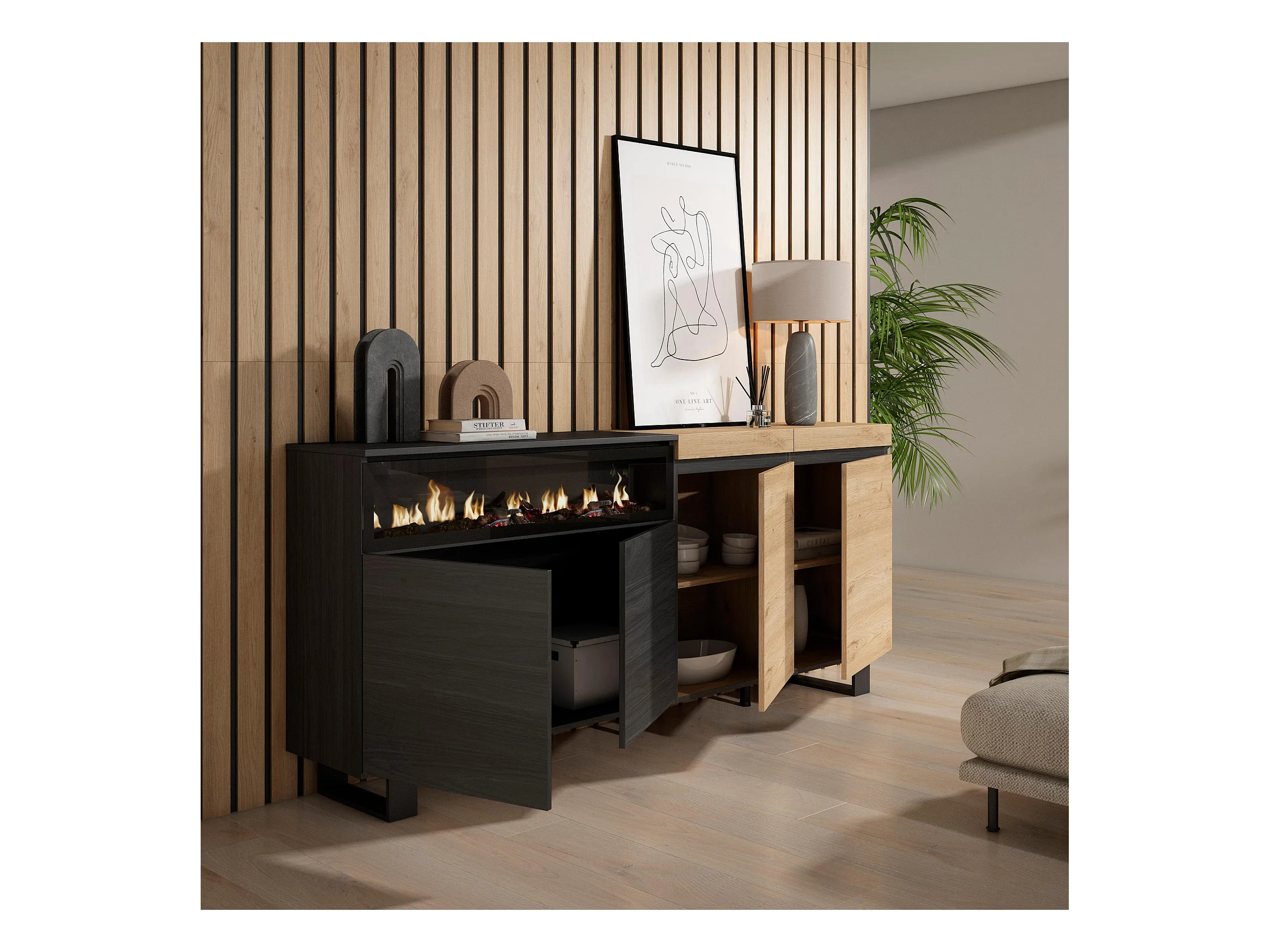 Aparadores para salón, 200x35x87cm, 4 Puertas, Chimenea eléctrica, Diseño industrial, Roble y negro