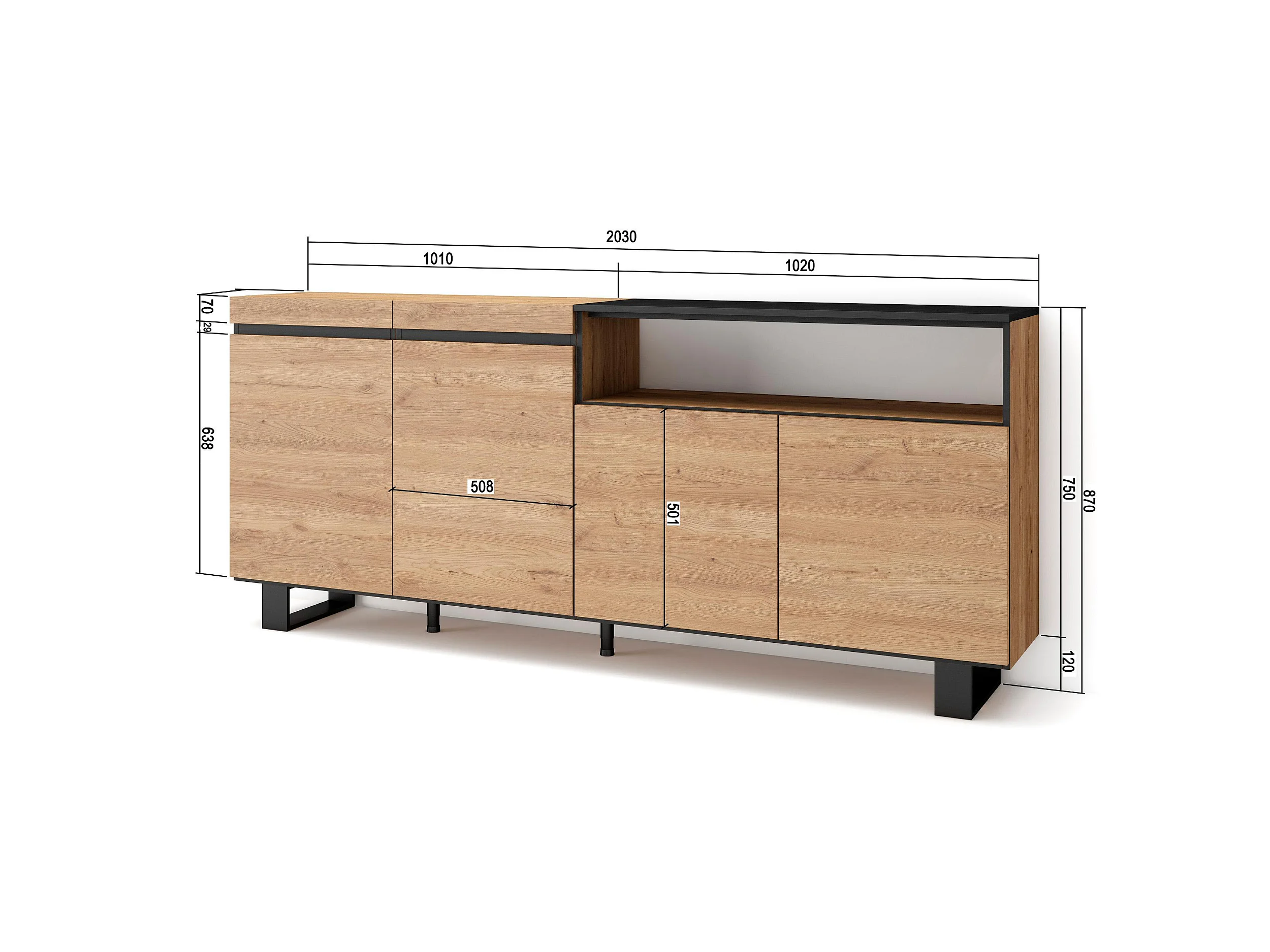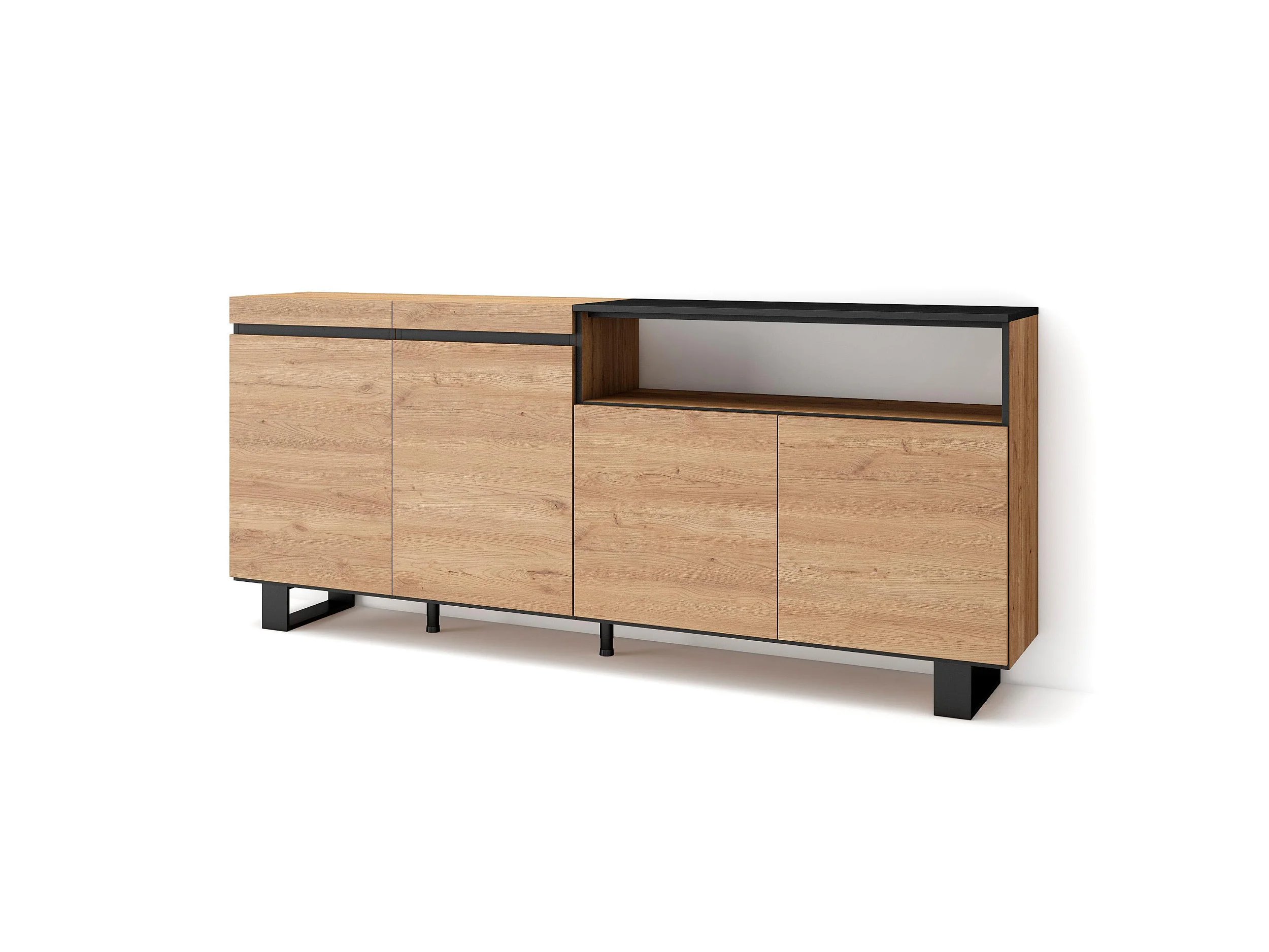 Aparadores para salón, 200x35x87cm, 4 Puertas, Diseño industrial, Roble y negro