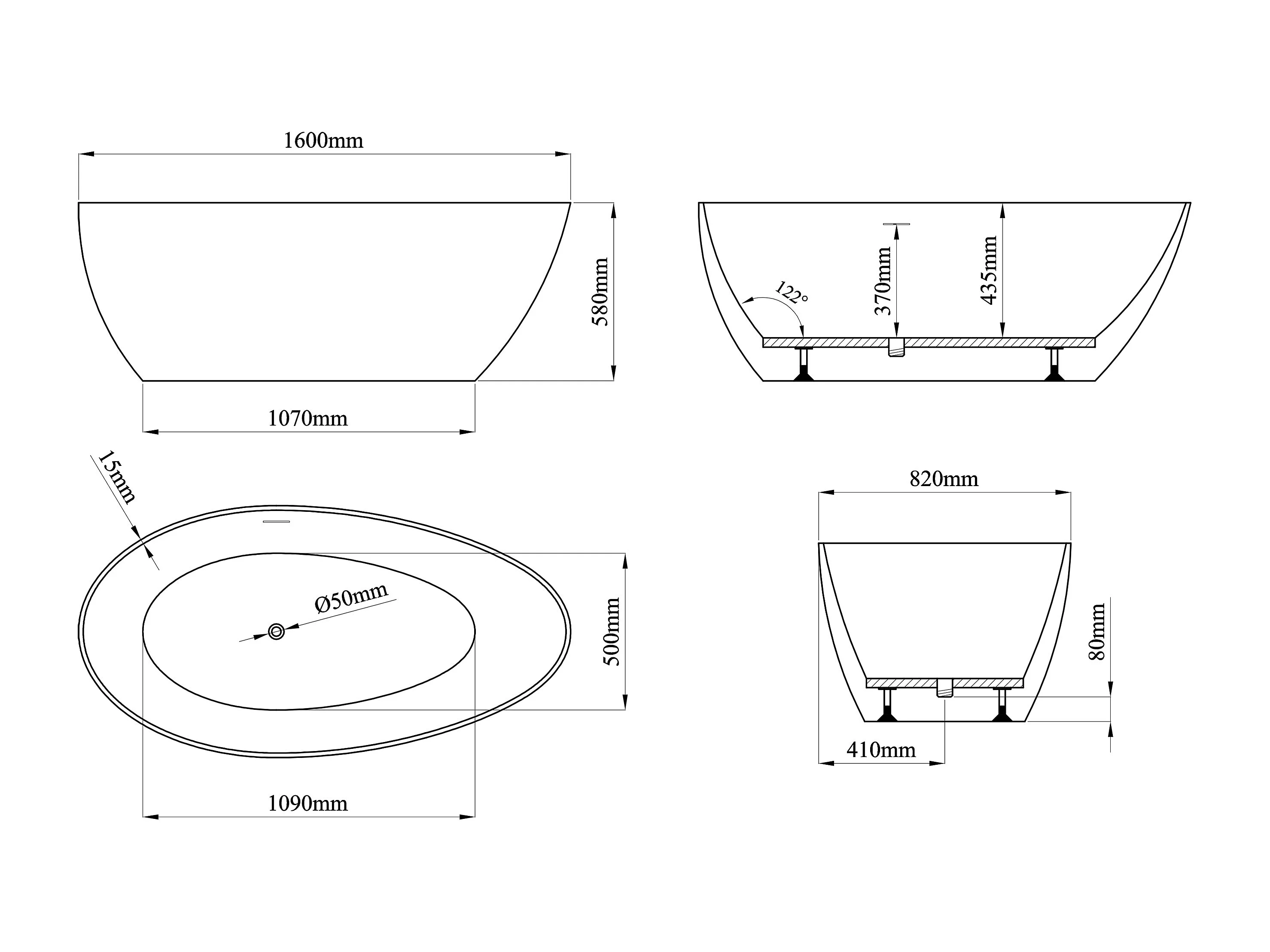 Bañera exenta asimétrica - 245 L - 160 x 82 x 58 cm - Blanco mate - Acrílico - APULIA