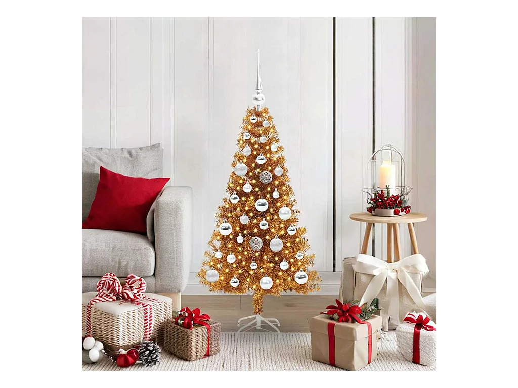 Árbol de Navidad preiluminado con luces y bolas dorado 120 cm