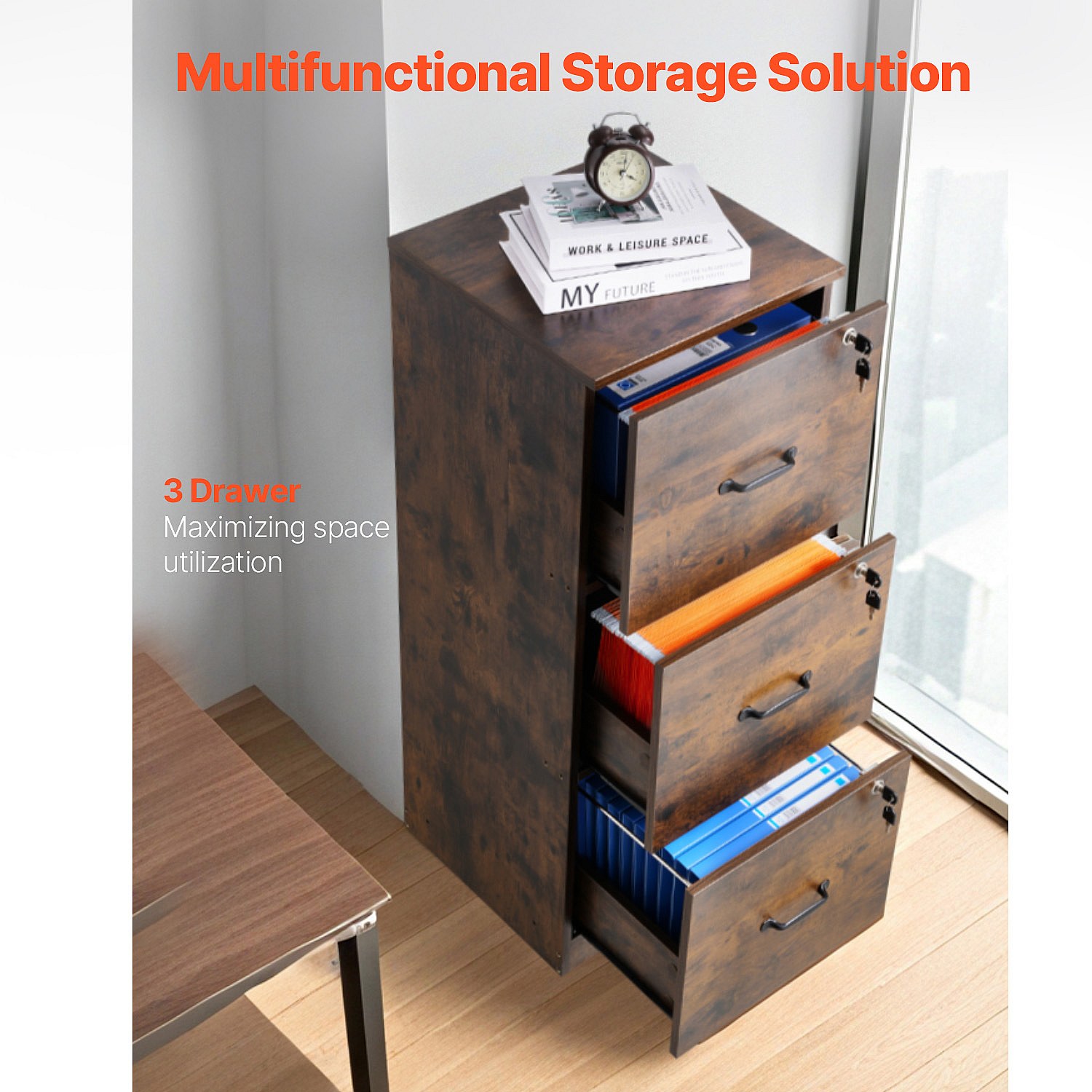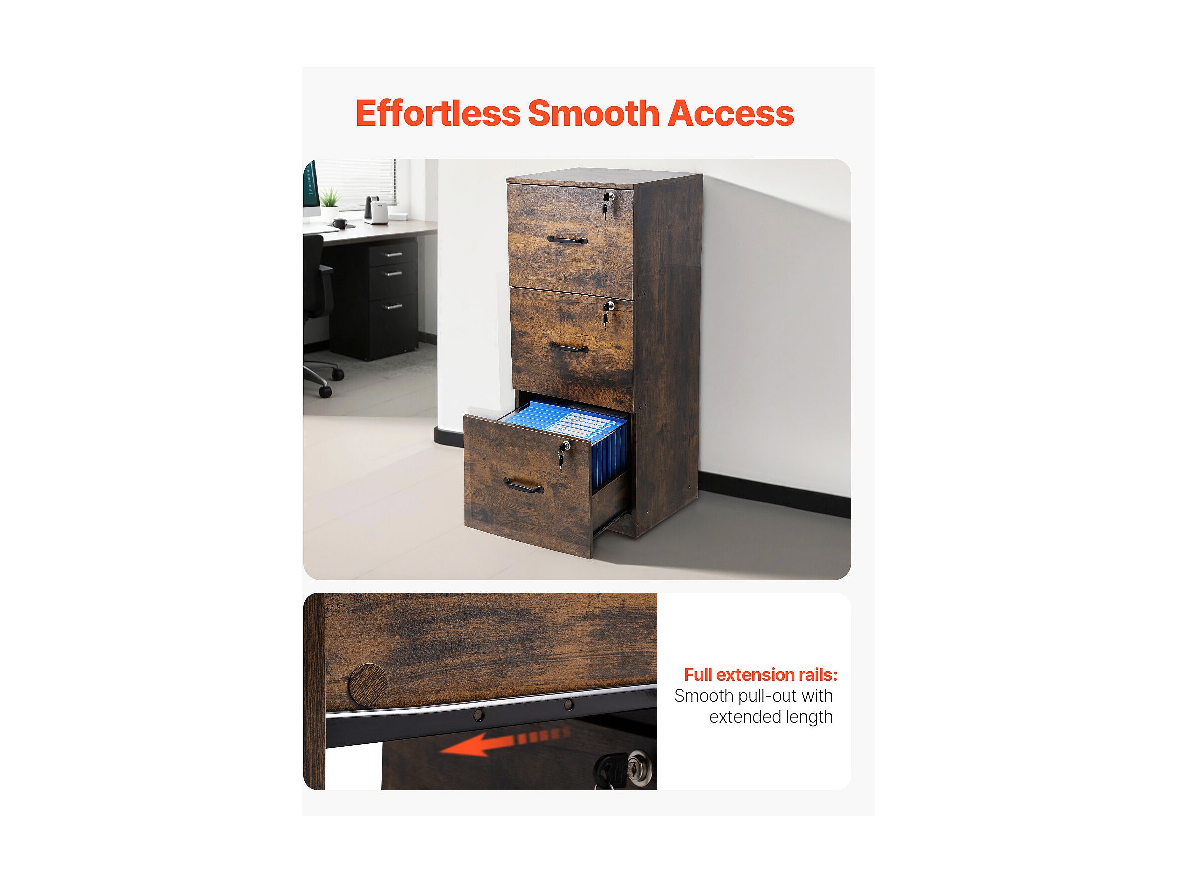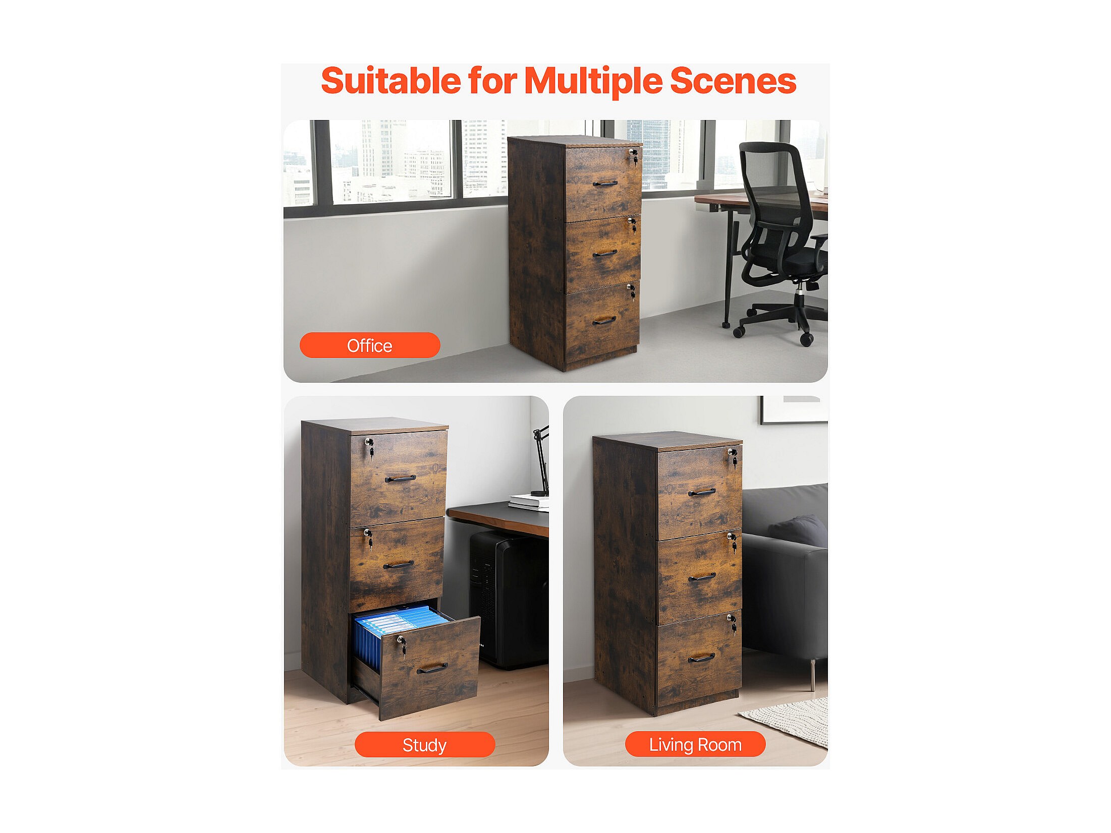 Archivador Vertical de 3 Cajones SucceBuy con Cerradura, Robusto, Barra Ajustable (2 Niveles), Archivo para Documentos A4/Carta/Legal, Fácil Montaje, Negro+Marrón