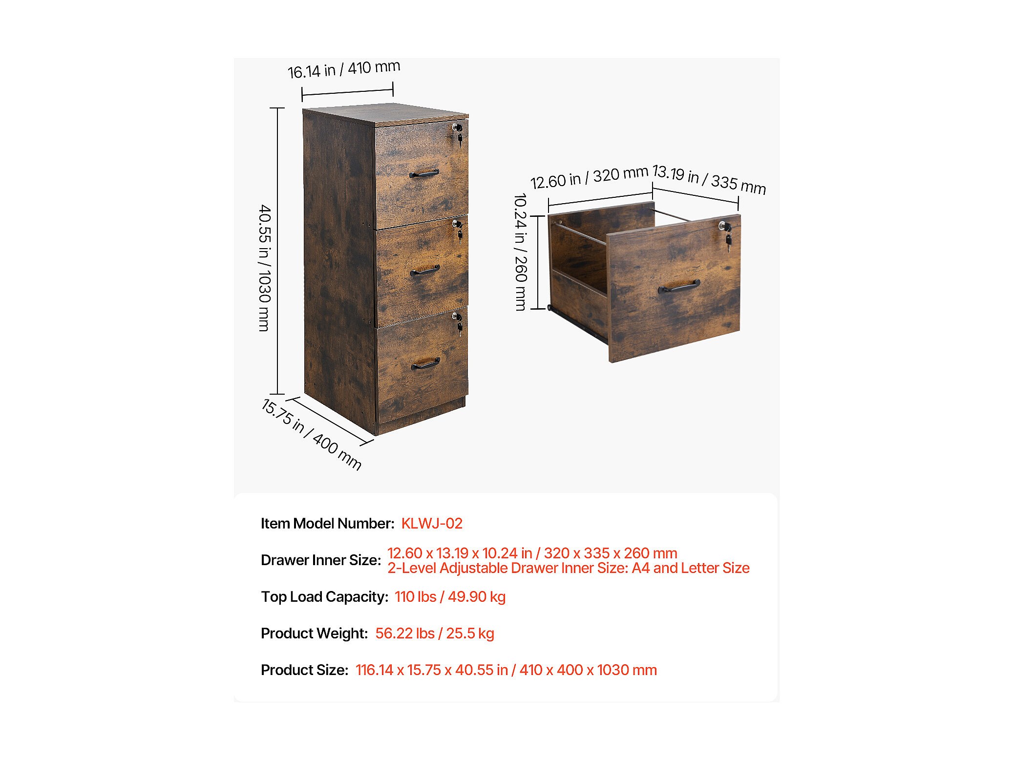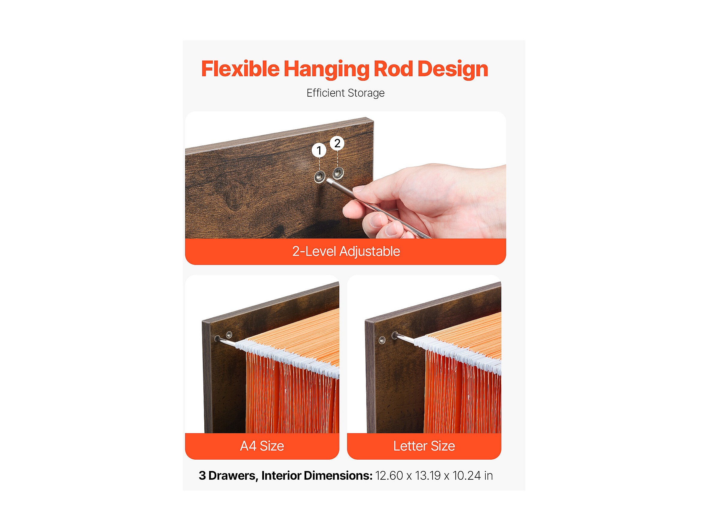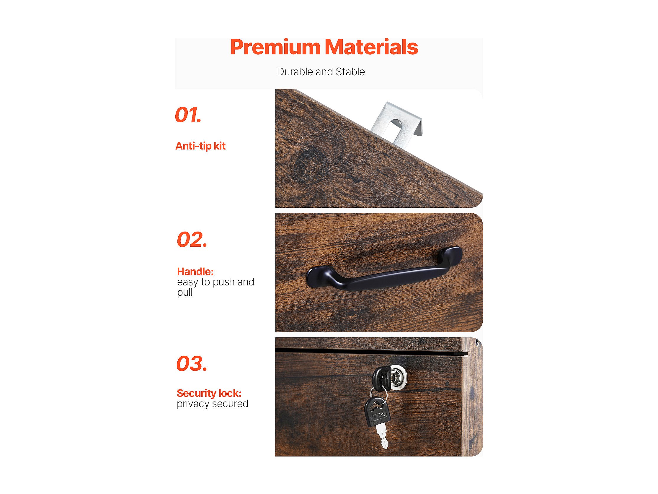 Archivador Vertical de 3 Cajones SucceBuy con Cerradura, Robusto, Barra Ajustable (2 Niveles), Archivo para Documentos A4/Carta/Legal, Fácil Montaje, Negro+Marrón