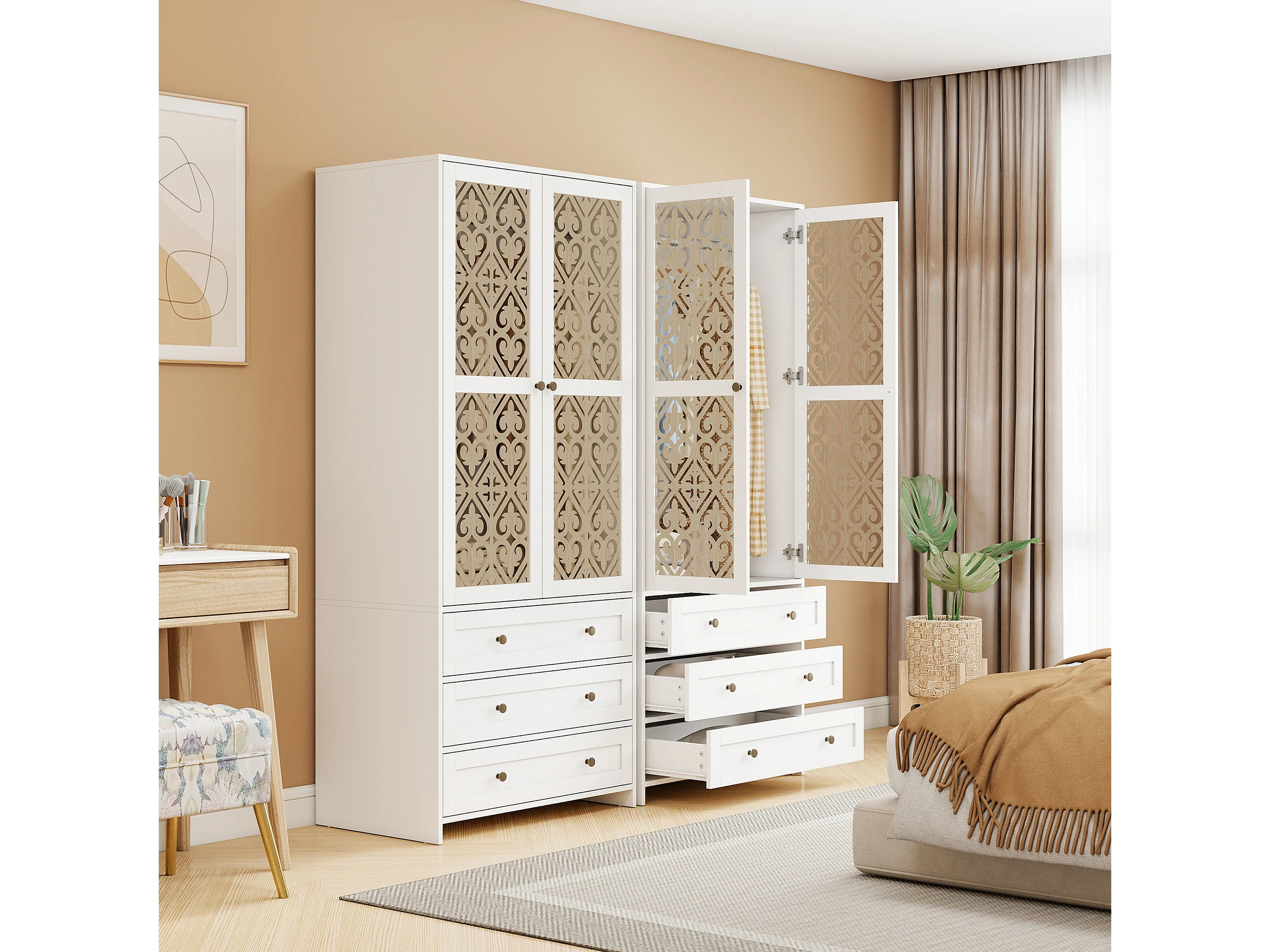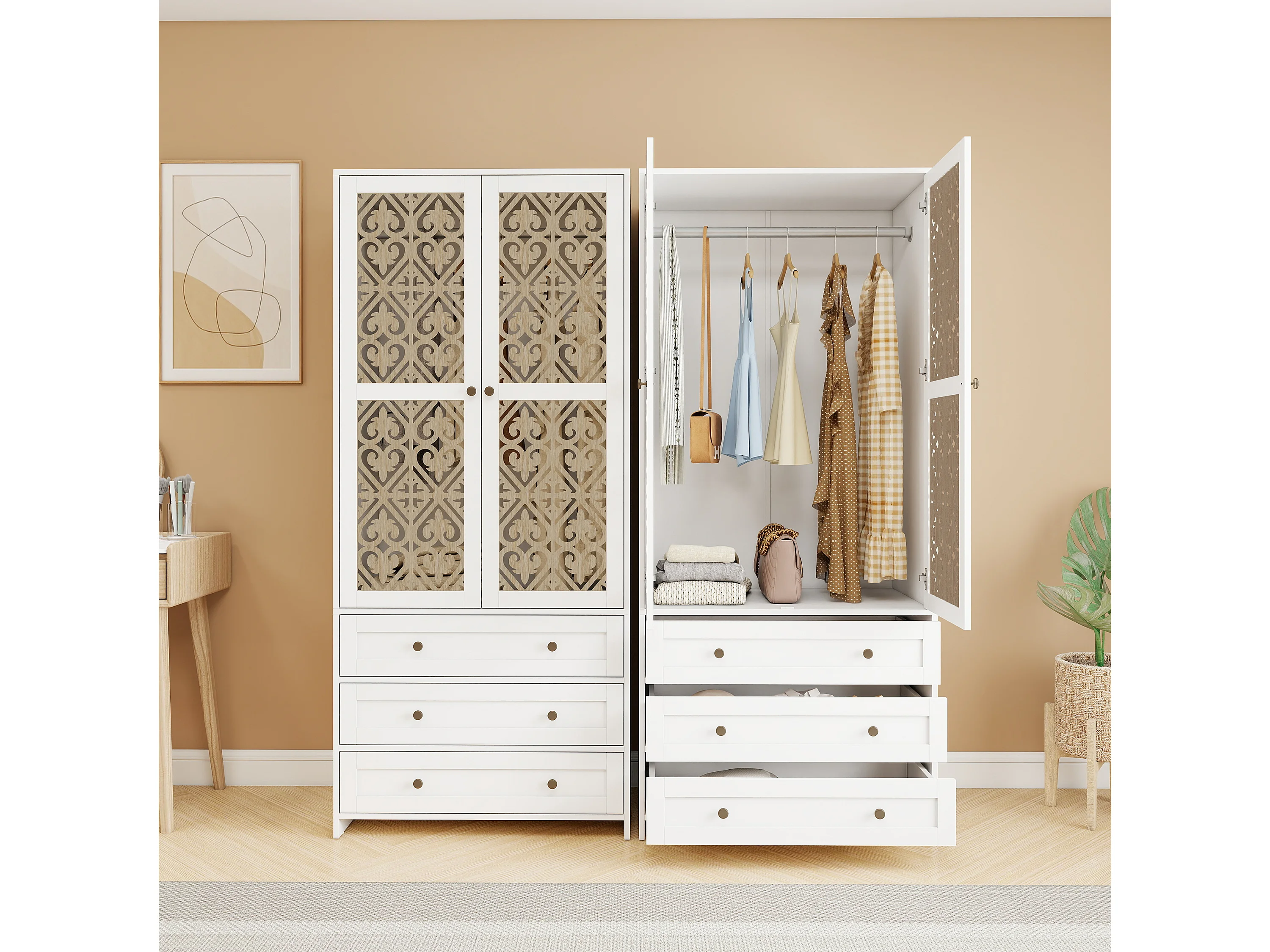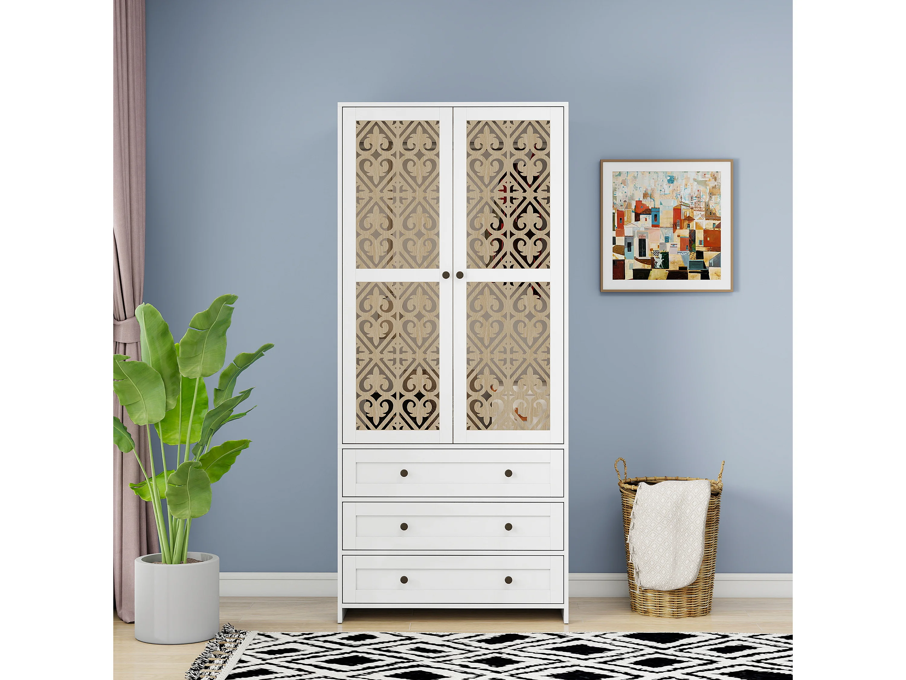 Armario bohemio blanco con motivos tallados, de aglomerado, con 3 cajones y barra de aluminio (80 x 48 x 180 cm)