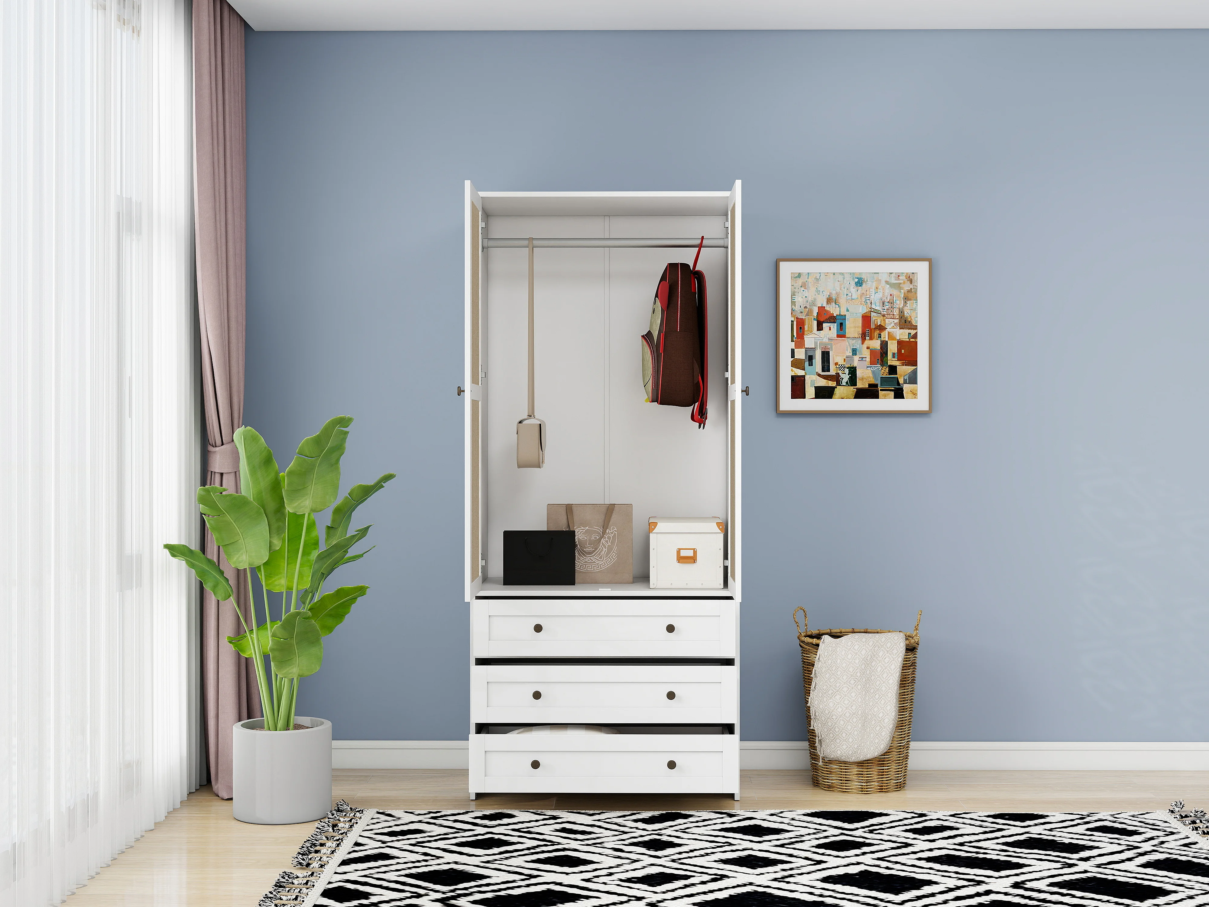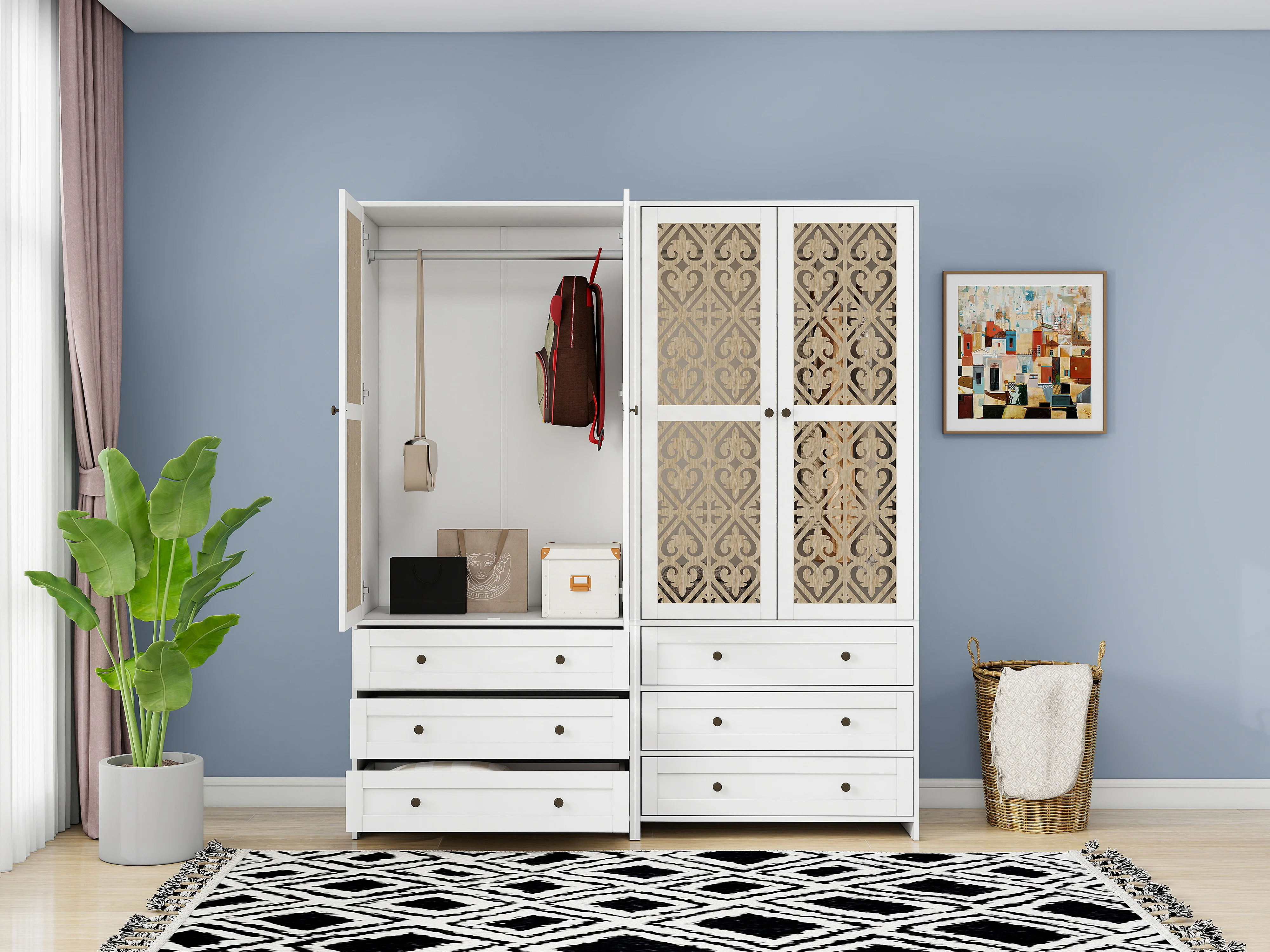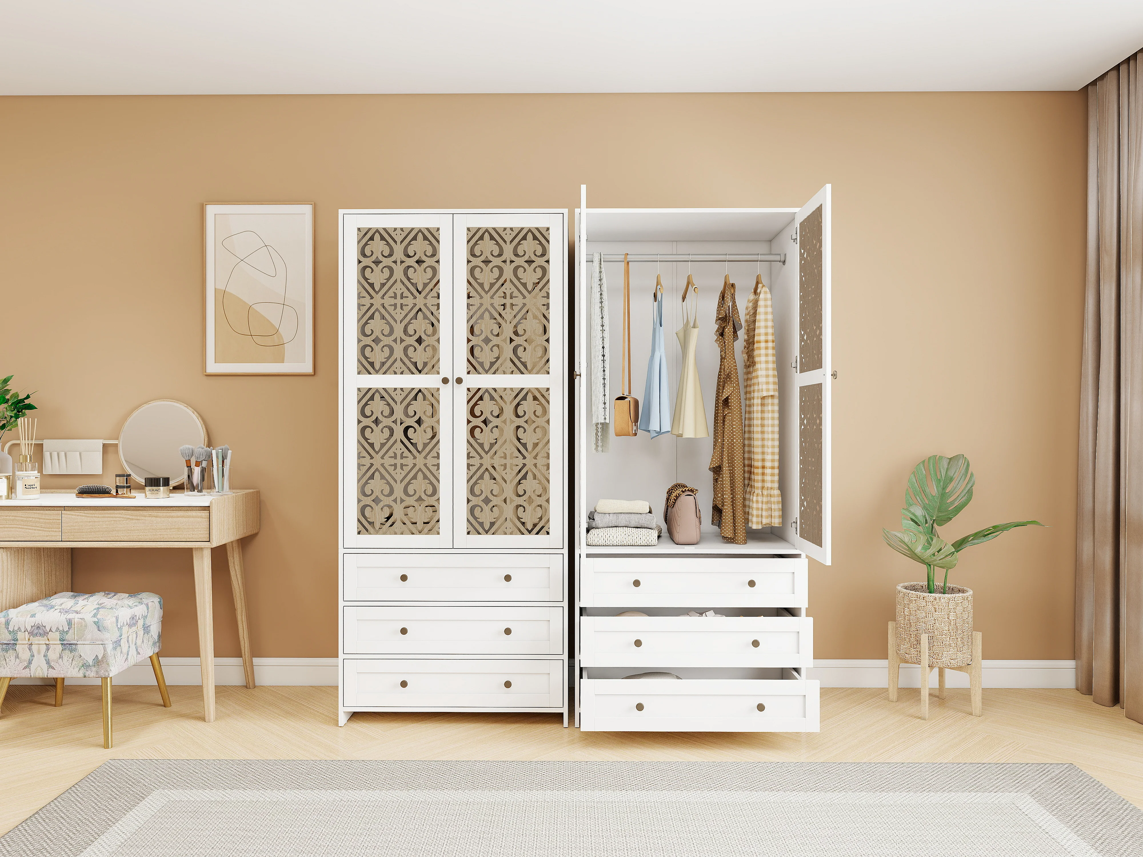 Armario bohemio blanco con motivos tallados, de aglomerado, con 3 cajones y barra de aluminio (80 x 48 x 180 cm)