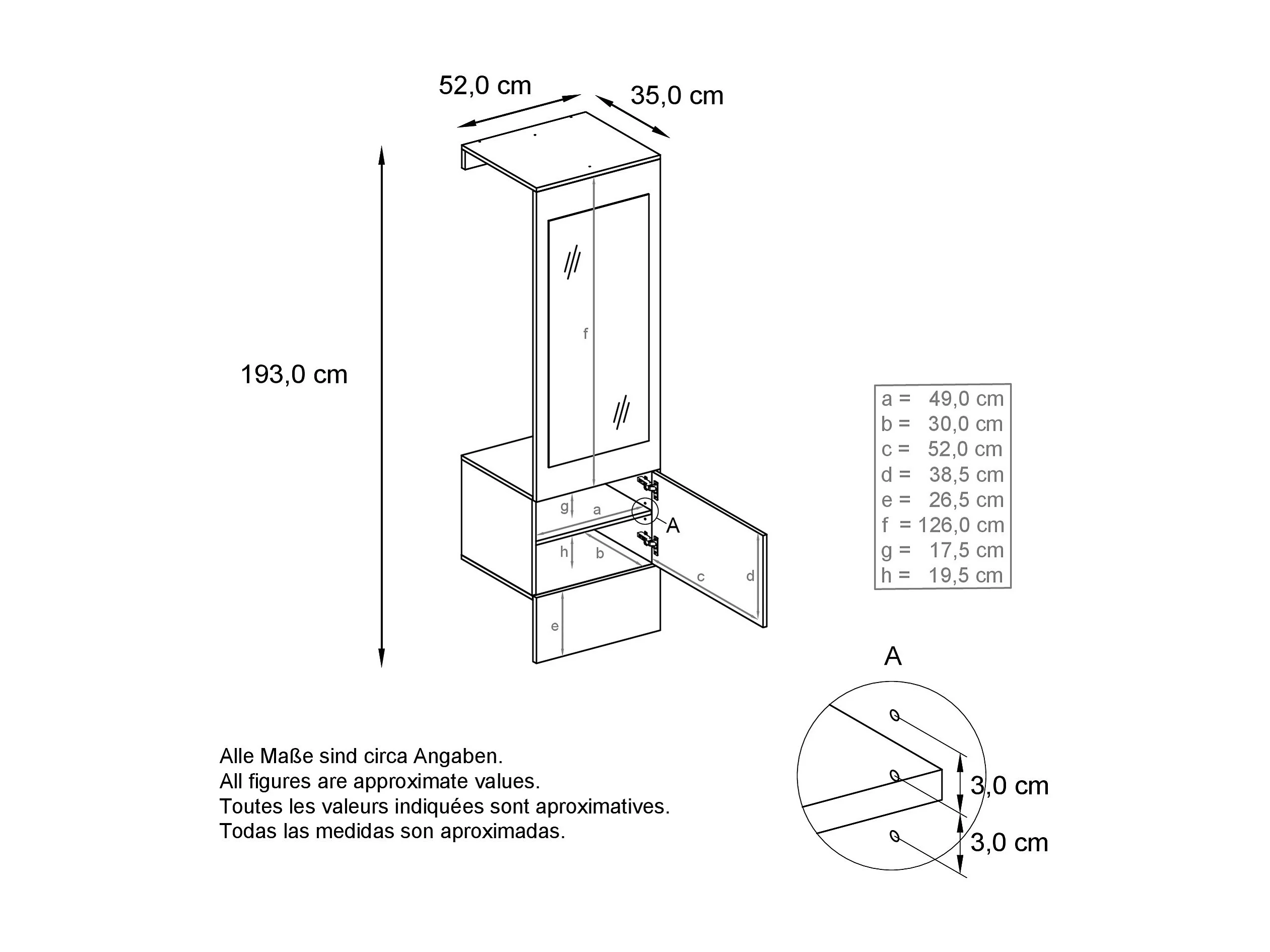 Armario Carlton Neo, Perchero de pared con panel de vestíbulo, espejo, barra para ropa y armario de pared, Azul real (52 x 193 x 35 cm)