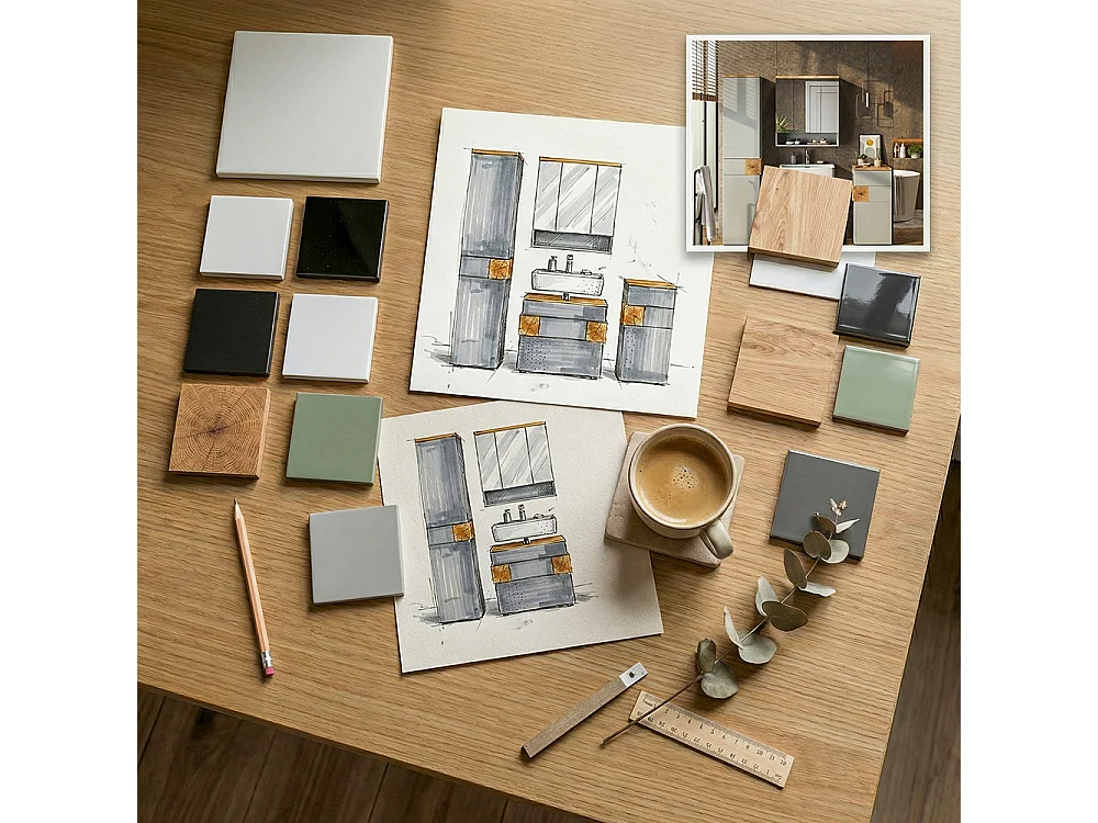 Conjunto de lavabo de esquina suspendido SKINO con mueble con espejo