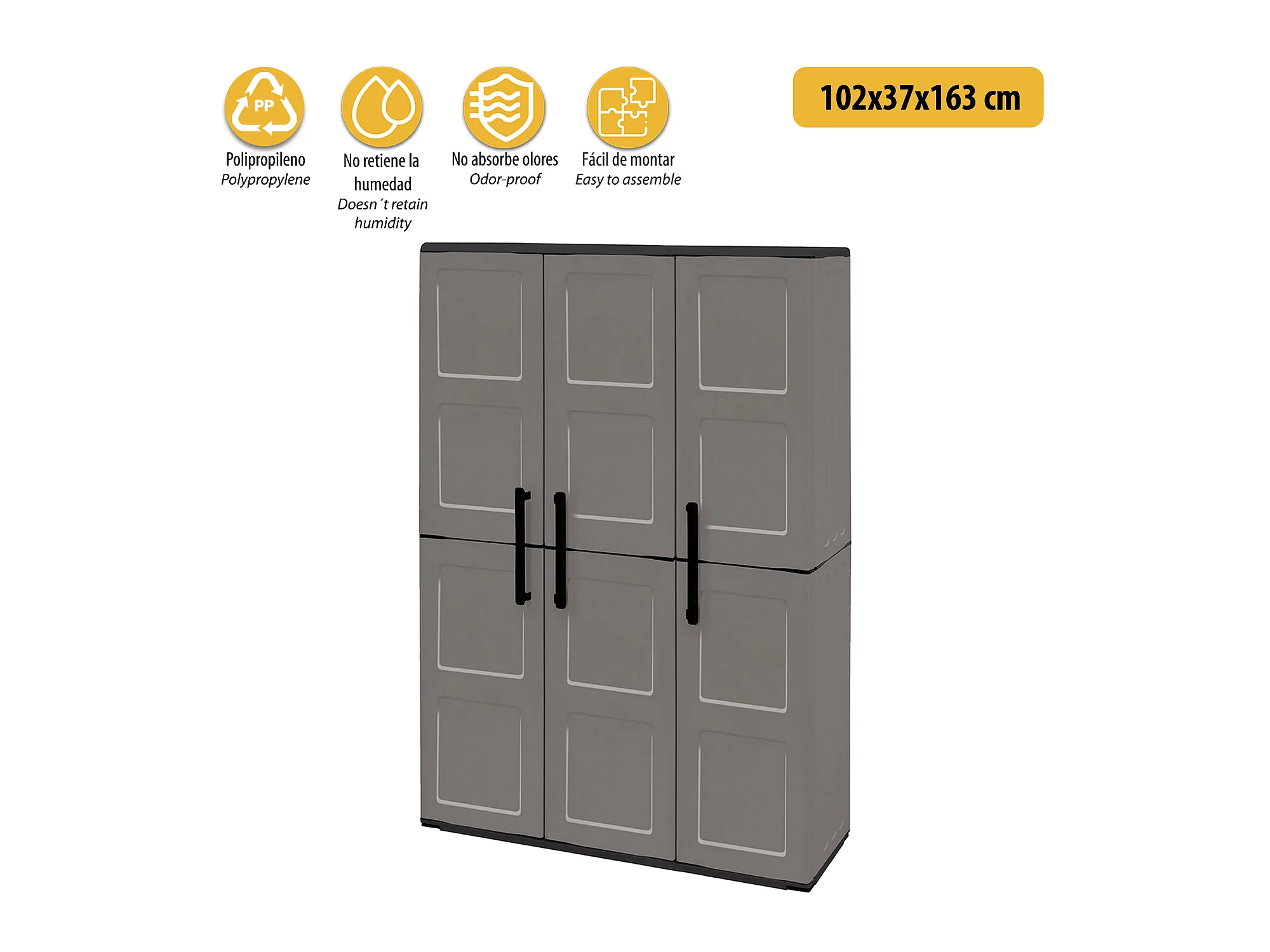 Armario porta escobas en polipropileno, con bisagras de acero y estantes regulables