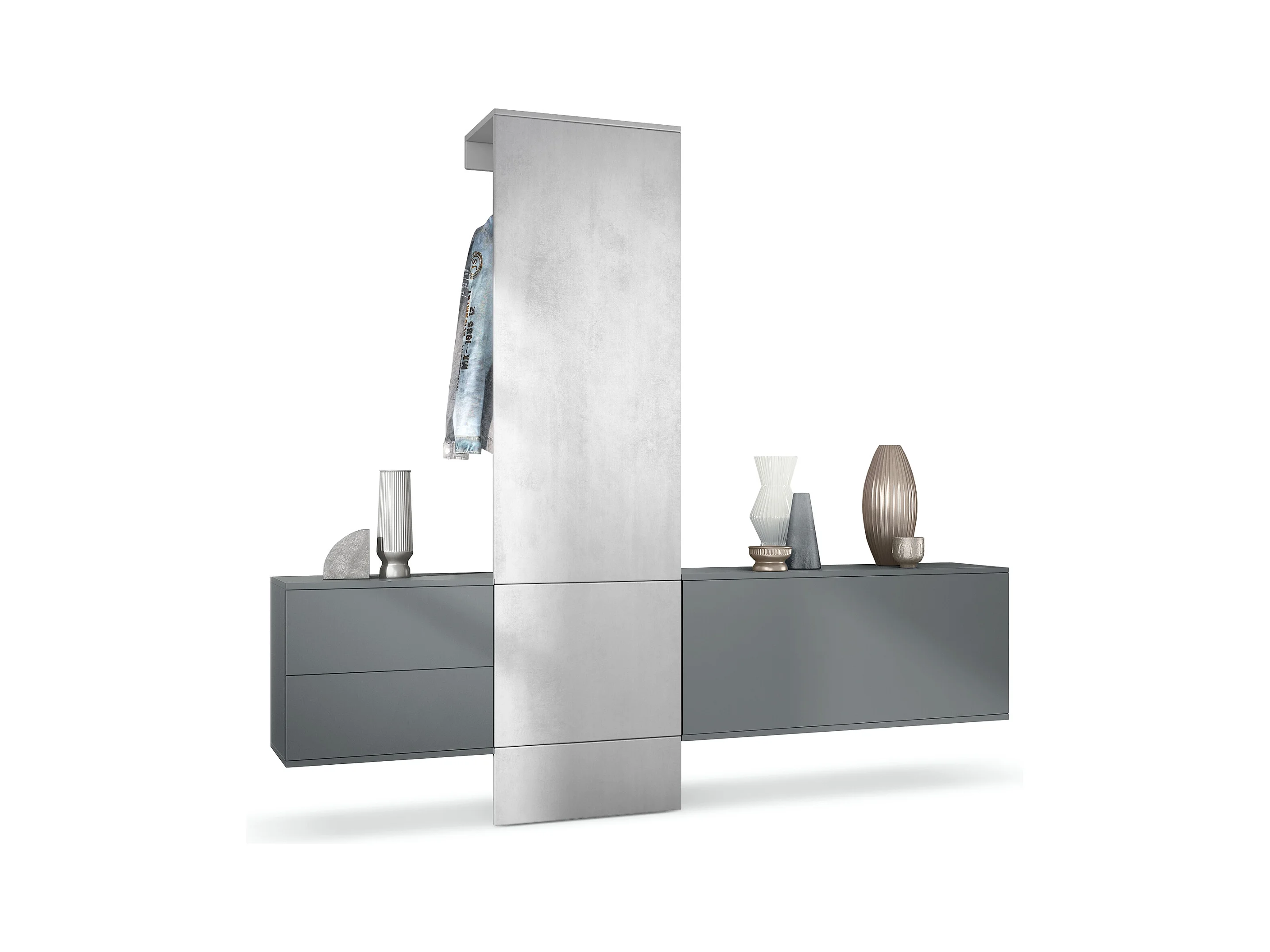 Conjunto de armario Vladon DualVista, compuesto por 1 panel para abrigos, 1 armario con cajones, 1 módulo de armario y 2 espejos, antracita mate/hormigón oxidado