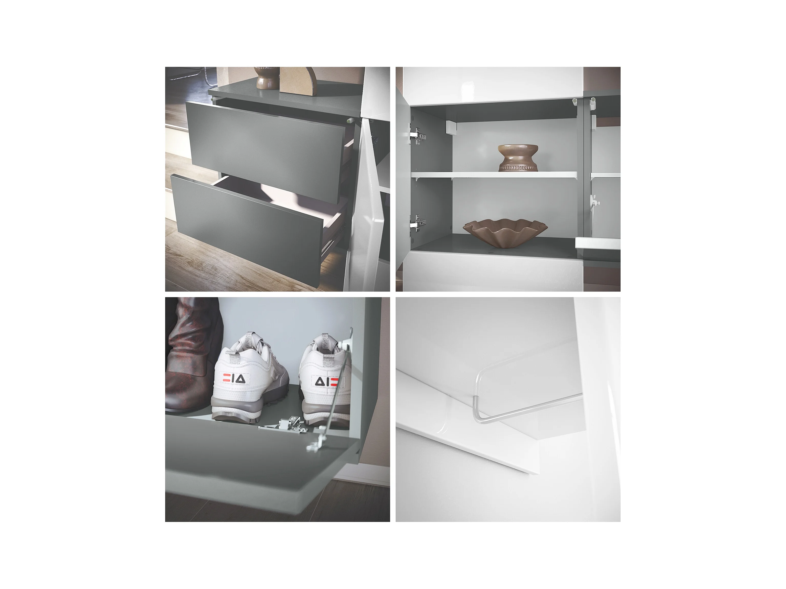 Conjunto de guardarropa Florence con zapatero y 2 espejos de pared, Hecho en ALEMANIA, blanco mate/hormigón oxidado