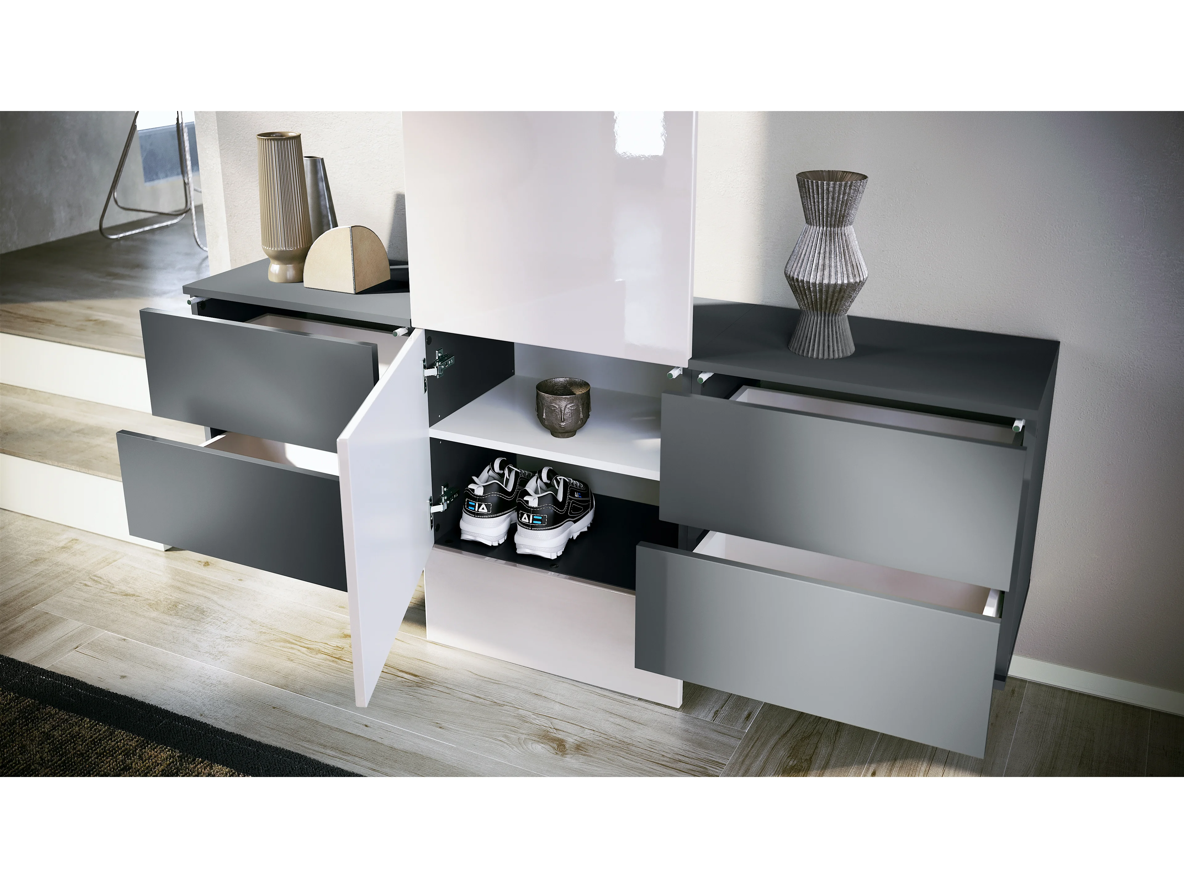 Vladon Mueble recibidor Carlton Set 4, Mueble de entrada compuesto por 1 Perchero, 1 Zapatero, antracita mate/crema de alto brillo (156,5 x 193 x 35 cm)