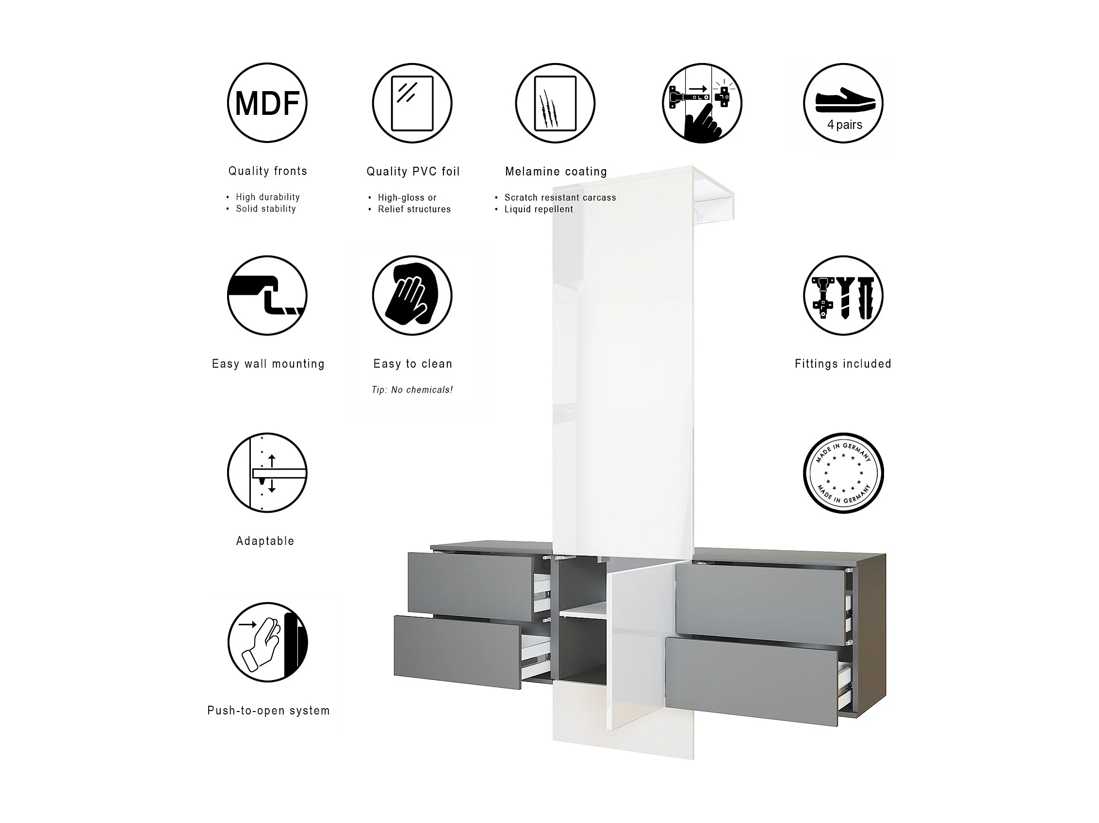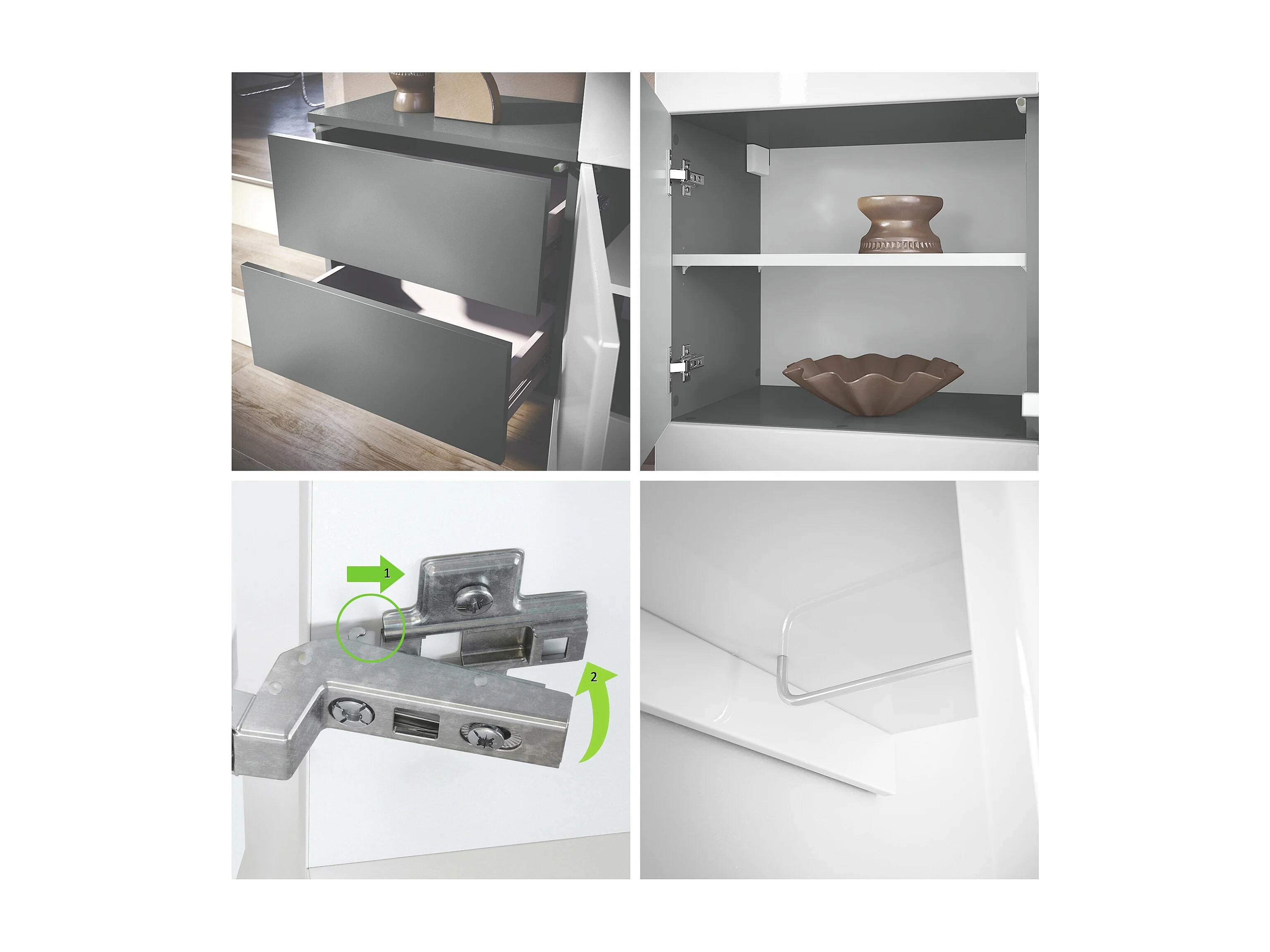 Conjunto de armario Kioto, Carcasa en blanco mate / Frente en gris arena alto brillo