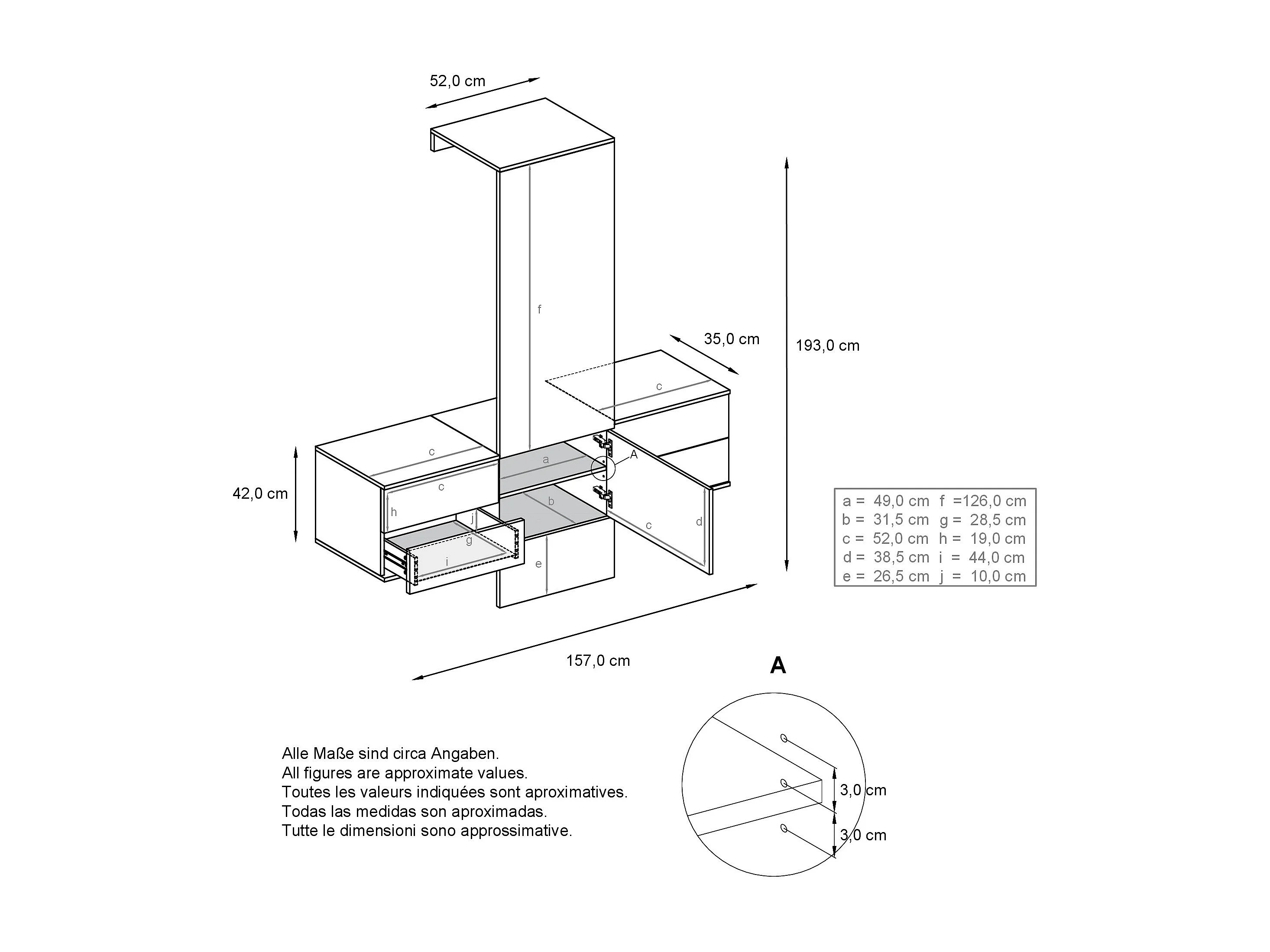 Perchero Kolmio 190 x 185 x 33 cm, cuerpo en blanco mate, frentes en Roble natural | Amplia selección de colores