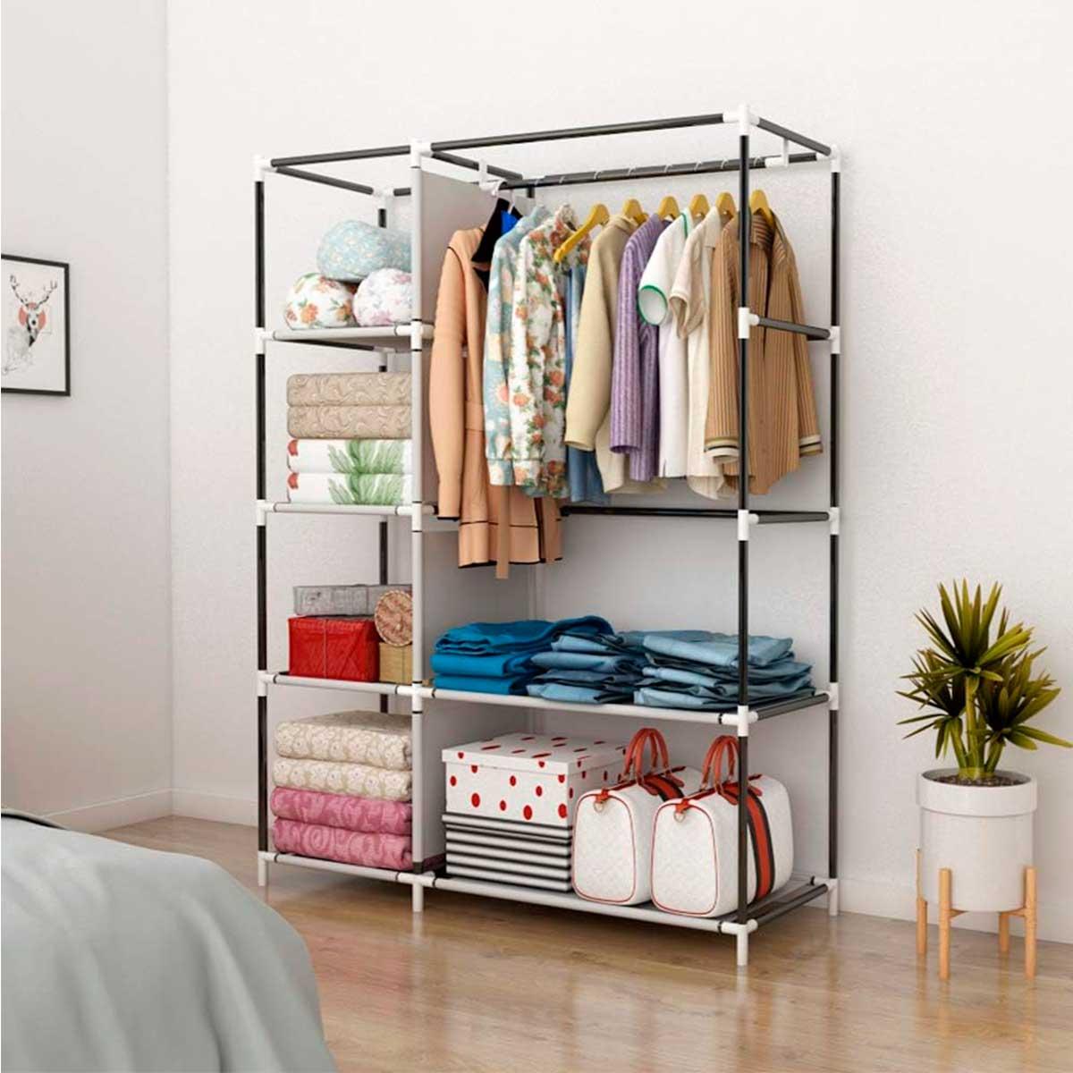 Armario de tela 6 estantes 1 barra para colgar 2 bolsillos gris 170x105x45 cm