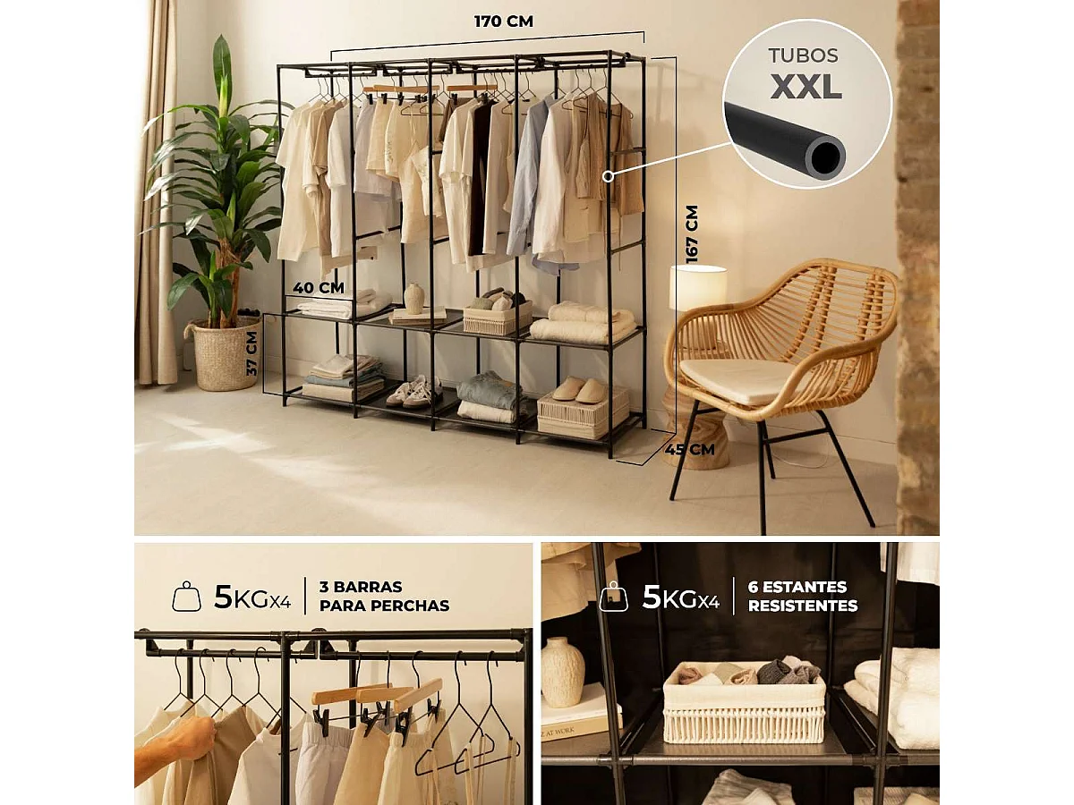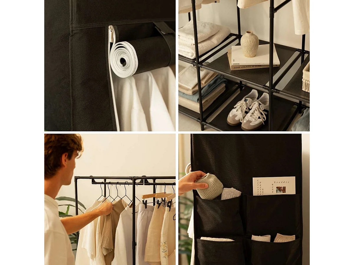 Armario de tela compartimentos y varillas negro 45x150x176 cm ES627368