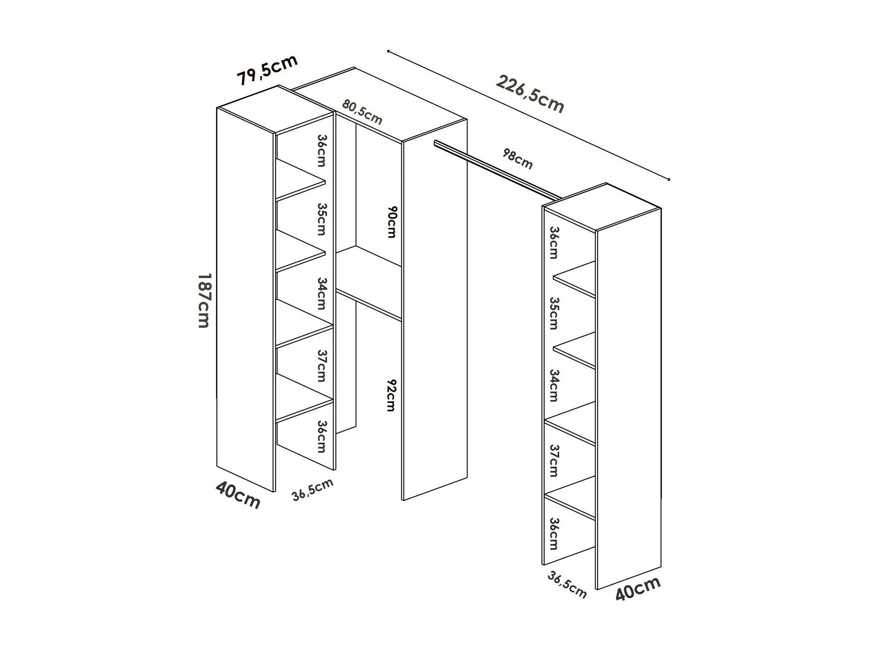 Armario Dluvumb, Estructura para vestidor de esquina, Perchero de esquina abierto, 226x79h186 cm, Blanco