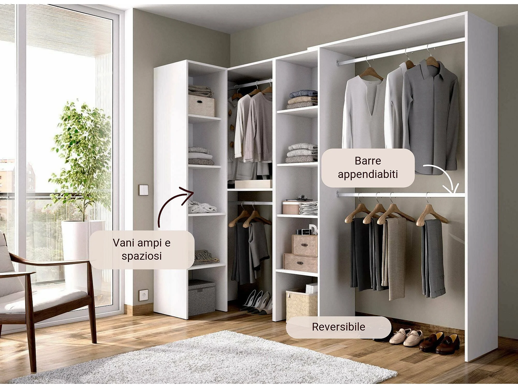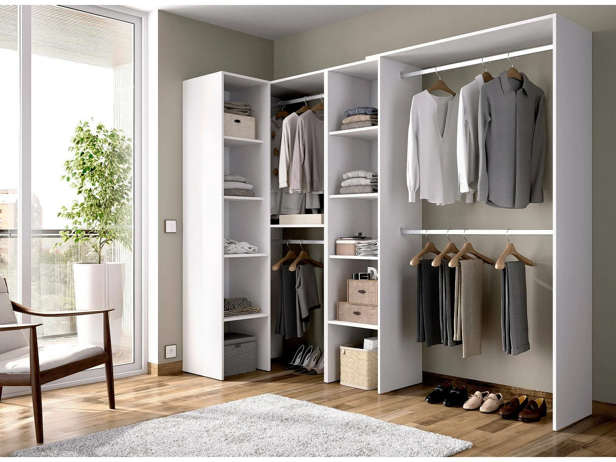 Armario Dmagrin, Estructura para vestidor de esquina, Perchero de esquina abierto, 228x79h187 cm, Blanco
