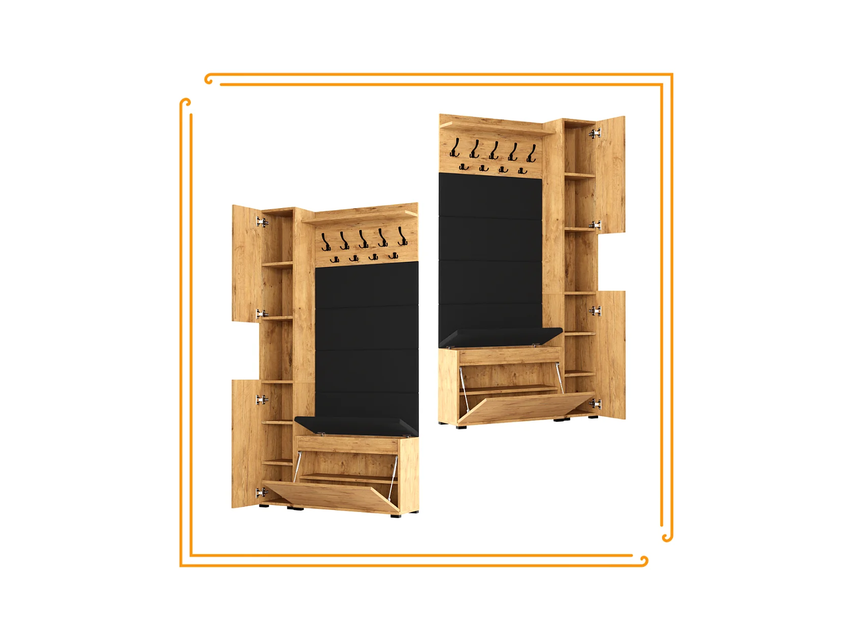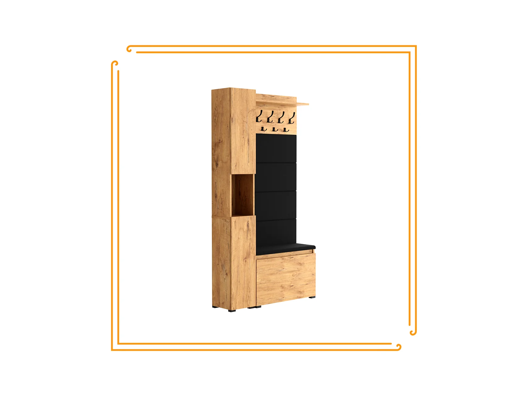 Armario para el recibidor con asiento, perchero, panel tapizado en Dorado Craft y Negro