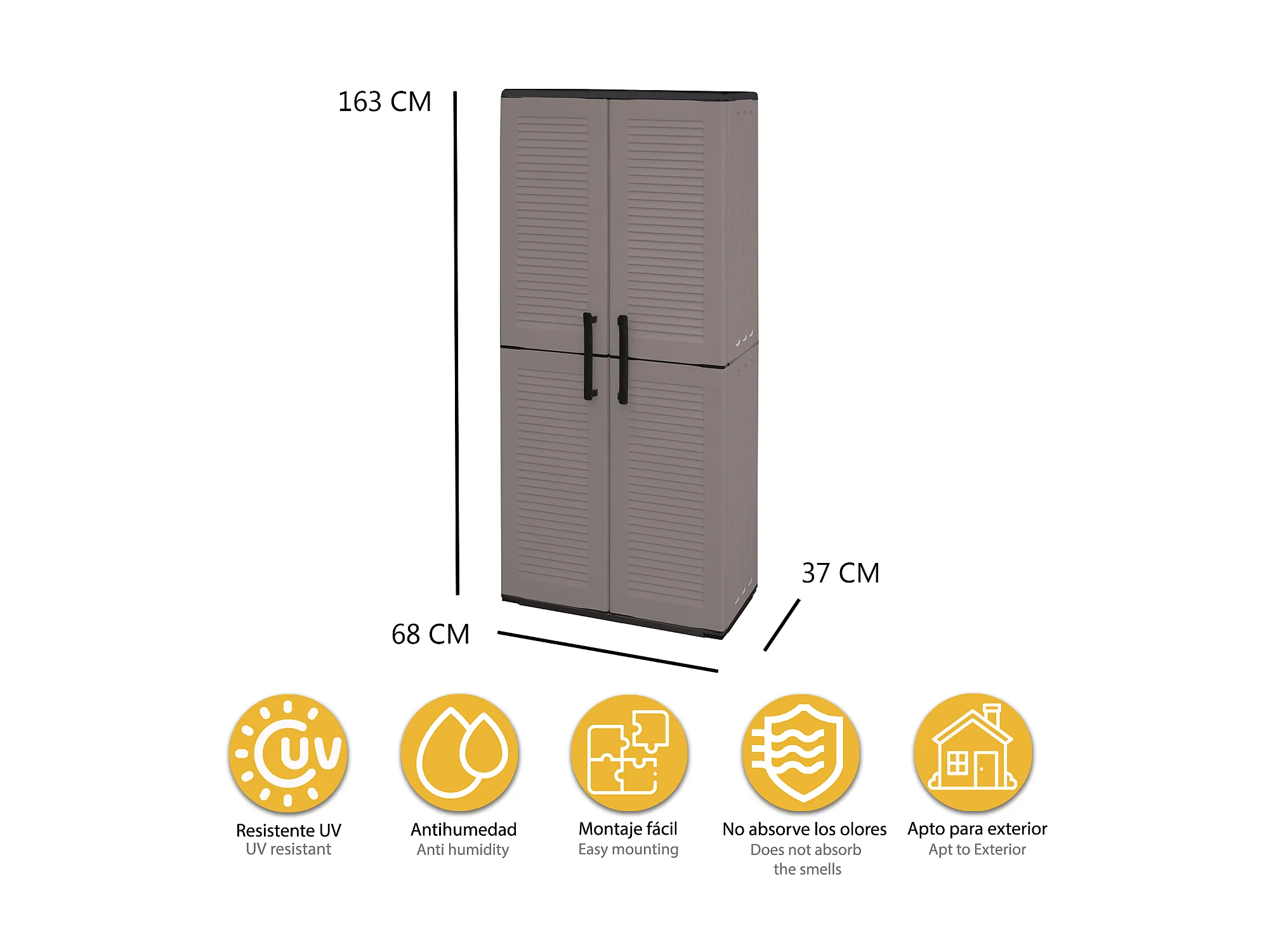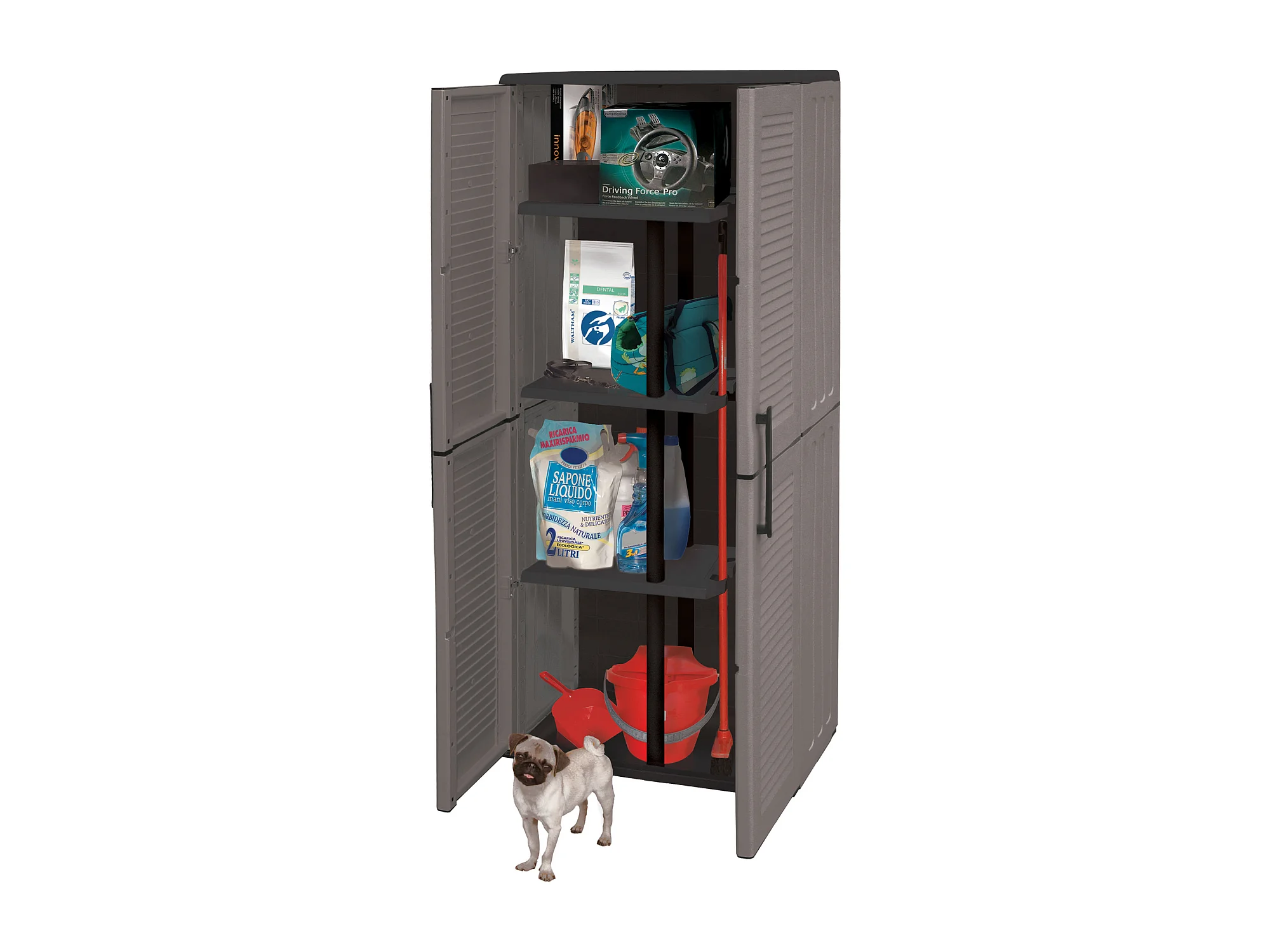 Armario porta escobas en polipropileno, con bisagras de acero y estantes regulables
