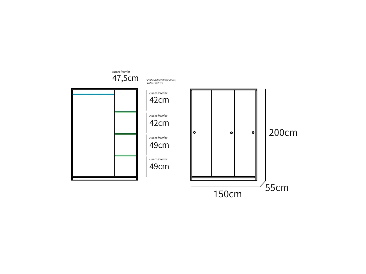 Armario ropero 3 puertas correderas Tibet acabado blanco, 200 cm(alto)150 cm(ancho)55 cm(f