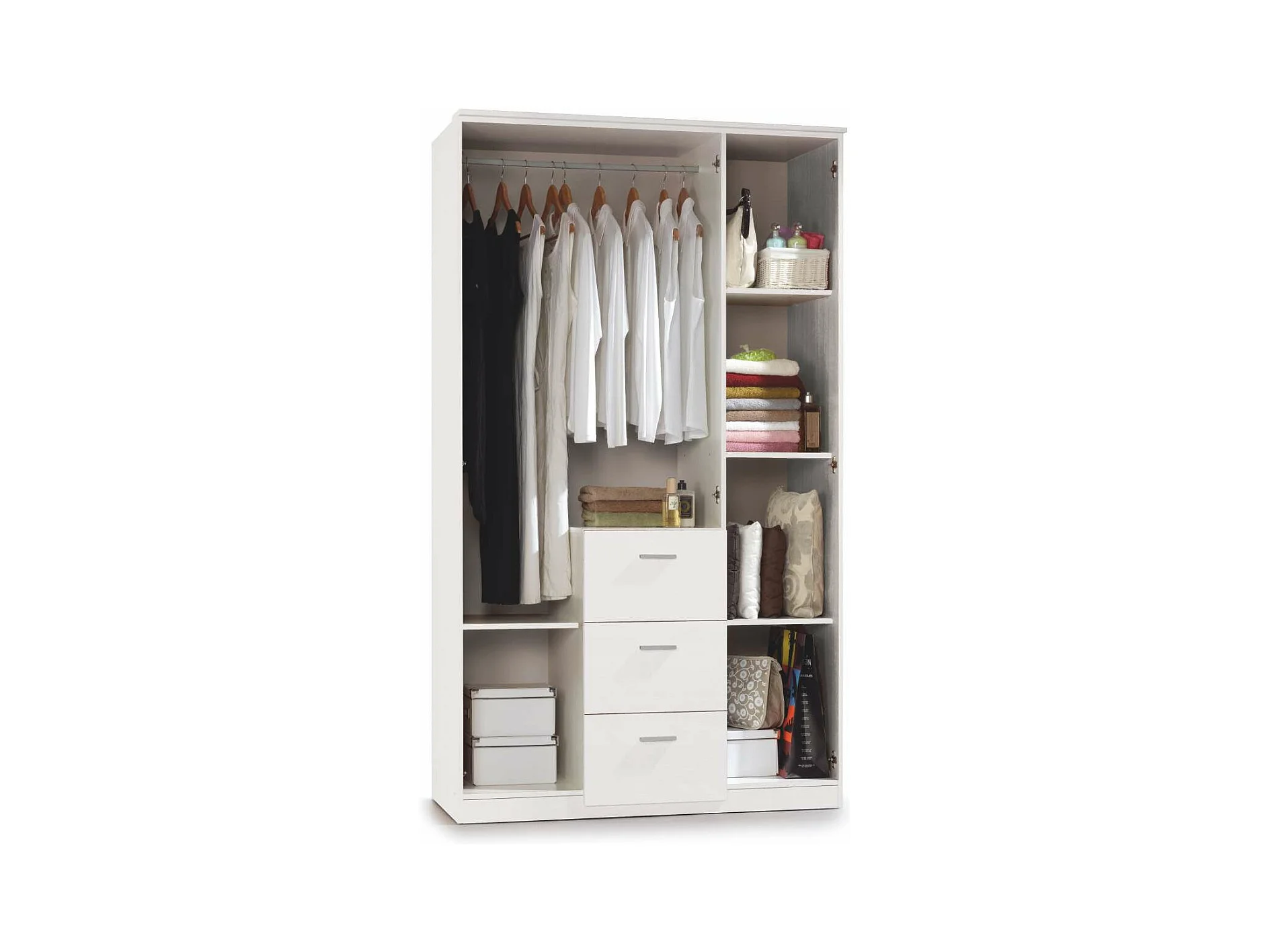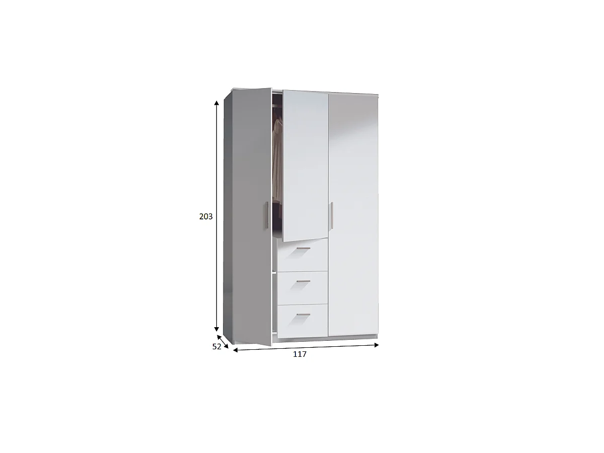 Armario ropero Moleo en acabado blanco de 3 puertas y 3 cajones. 117 cm (ancho), 203 cm (a