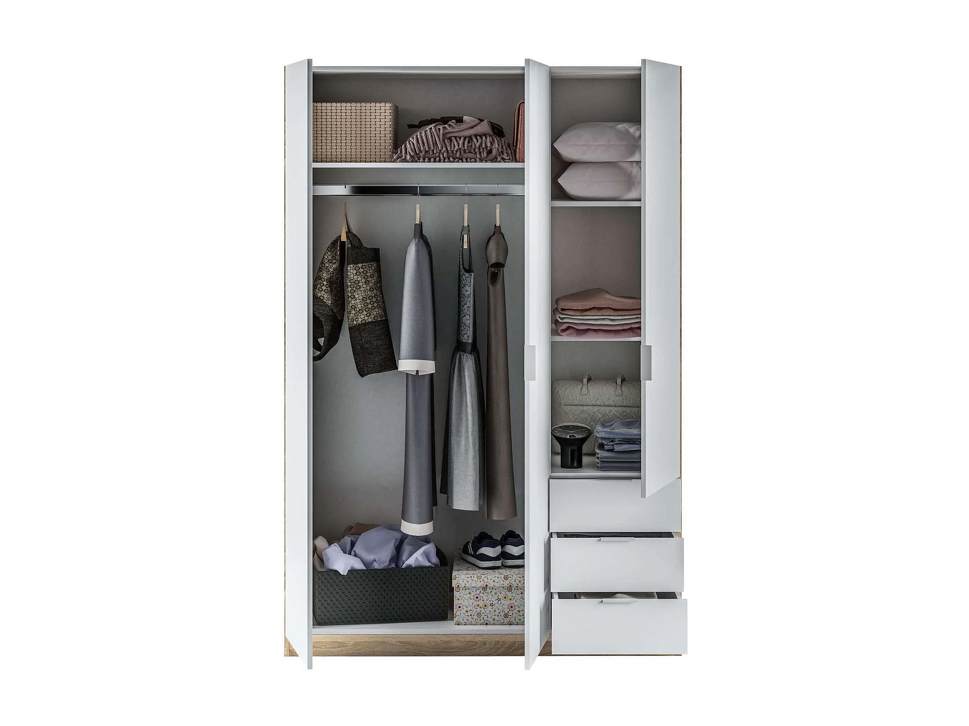 Armario ropero Vanesa 3 puertas abatibles acabado blanco artik y roble canadian. 180 cm (a