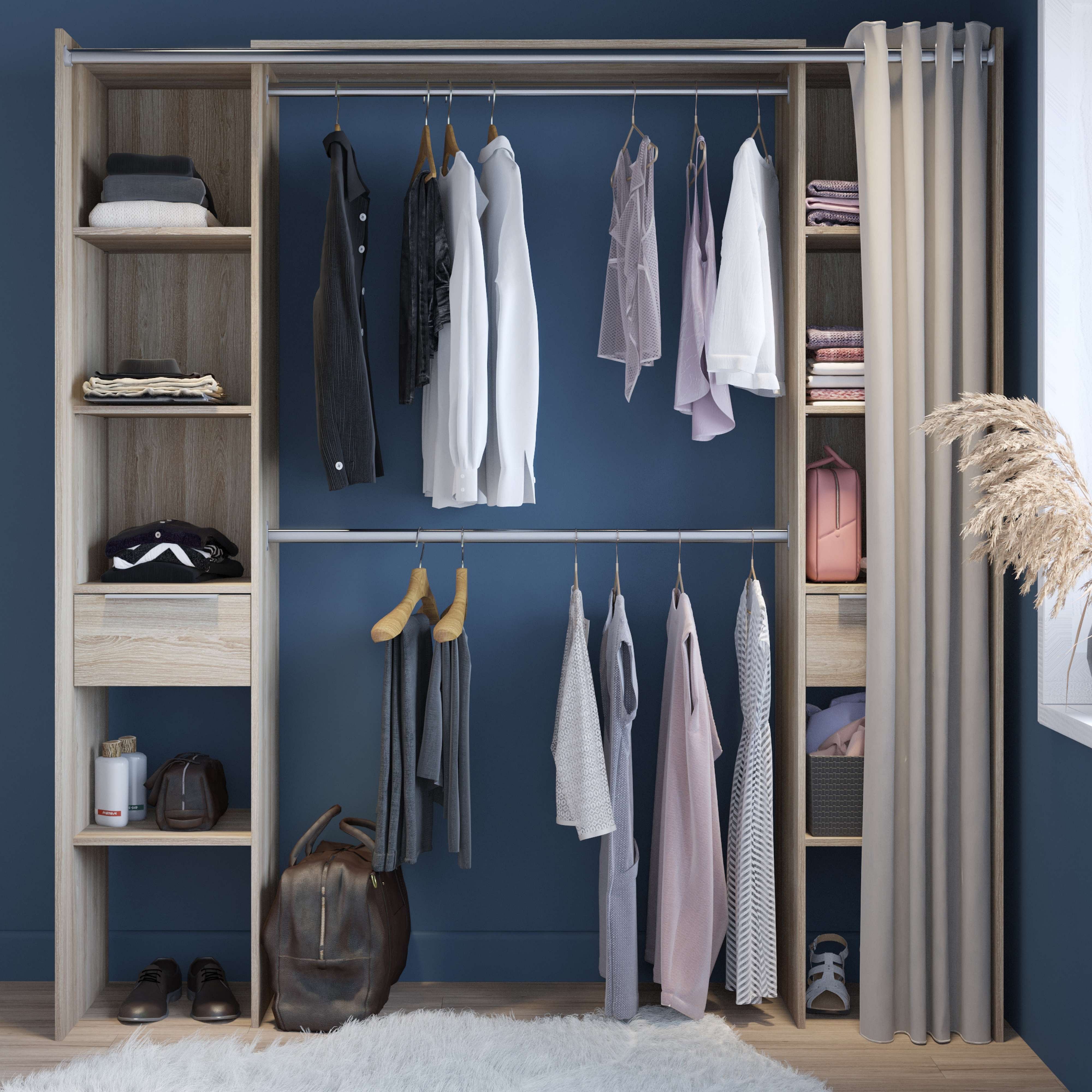 Armario 2 barras colgadoras 4 estantes 2 cajones 205x185x44 cm