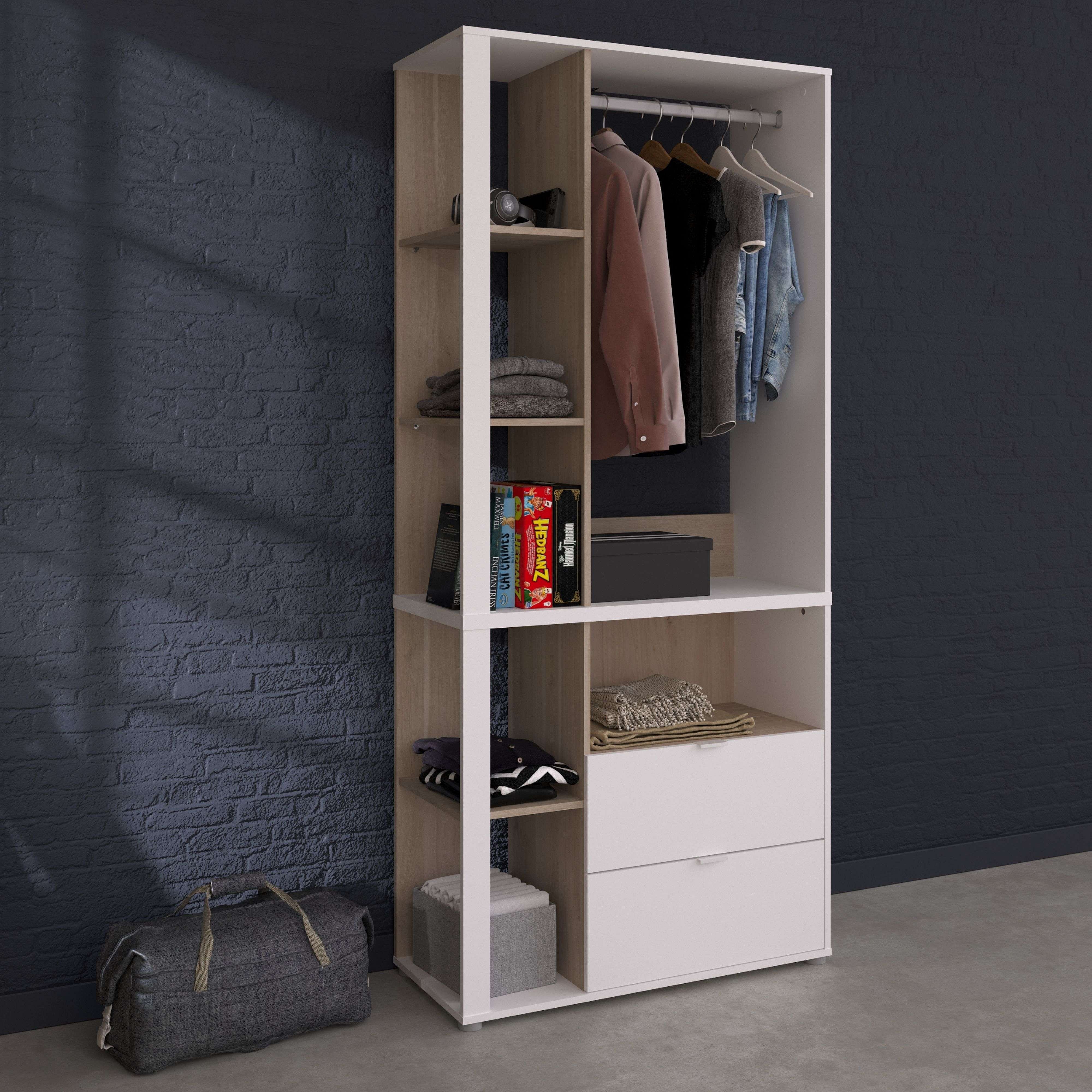 Armario Vestidor Boreal Blanco y Roble Japonés 2 Cajones 4 Estantes 92x206 cm