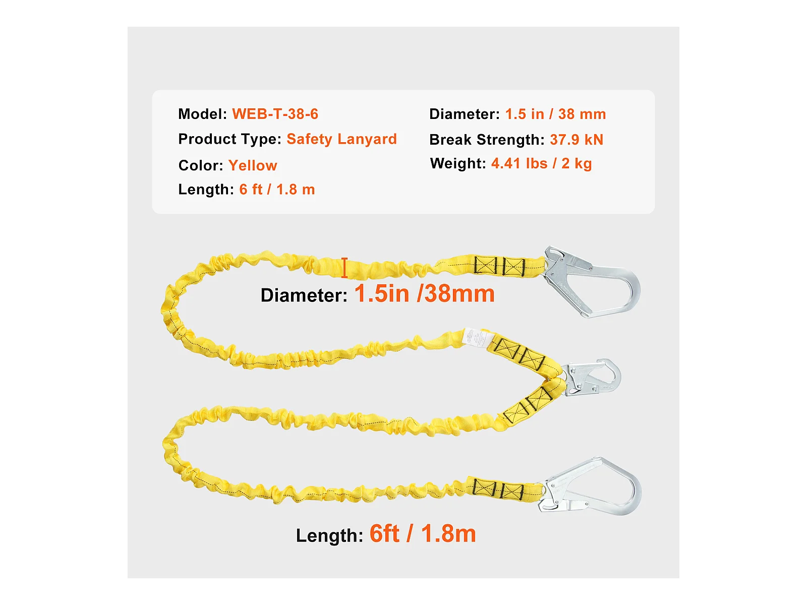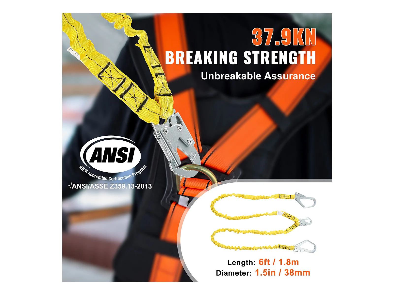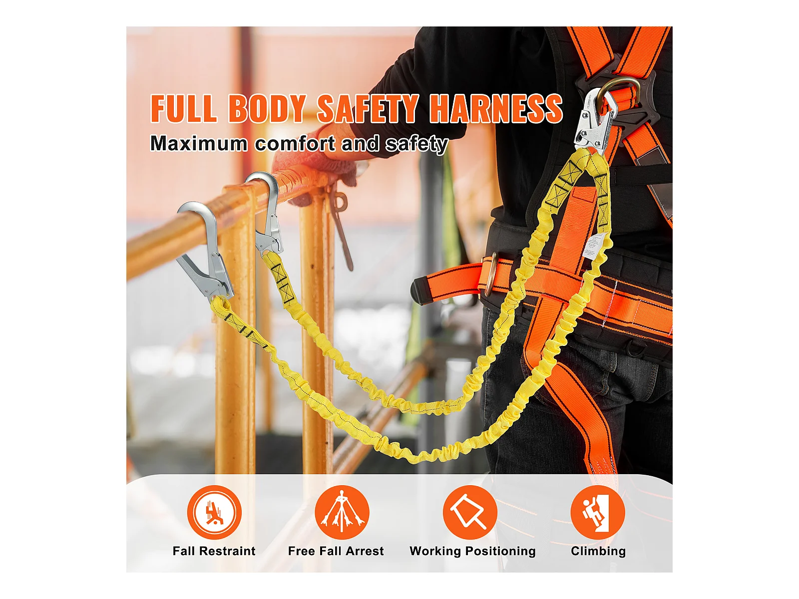 Arnes de Seguridad SucceBuy 3.8 cm 1.83 m Arnes de Protección contra Caídas 2 Ganchos Amarillo, Cinturón de Seguridad Retráctil para Trepar a los Árboles