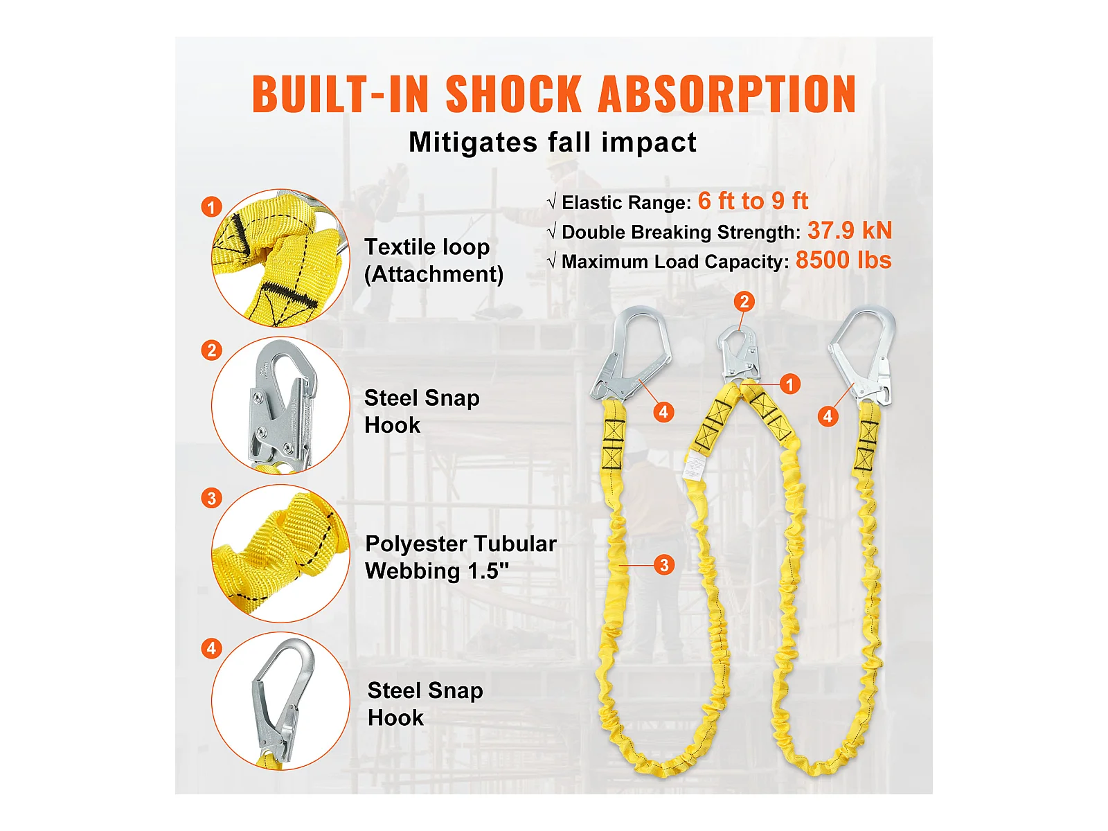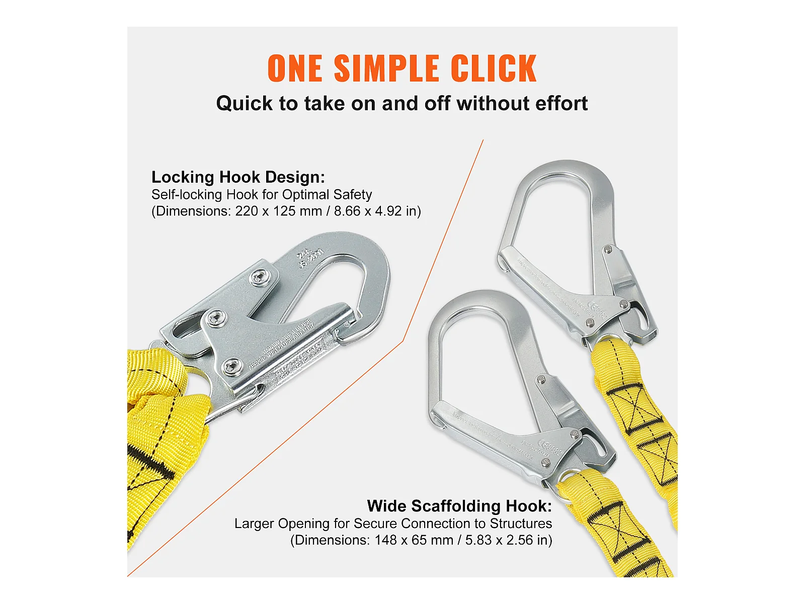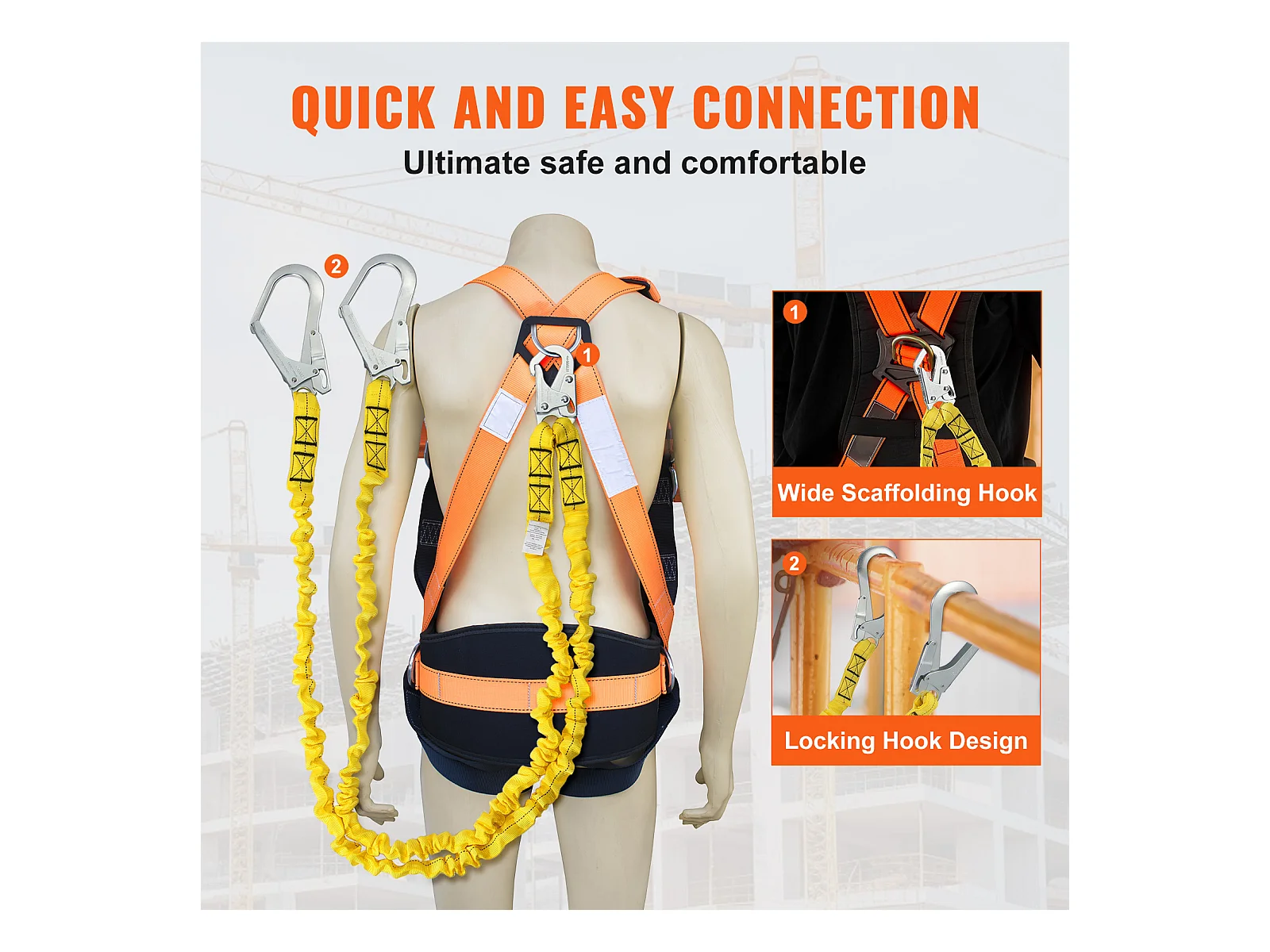 Arnes de Seguridad SucceBuy 3.8 cm 1.83 m Arnes de Protección contra Caídas 2 Ganchos Amarillo, Cinturón de Seguridad Retráctil para Trepar a los Árboles