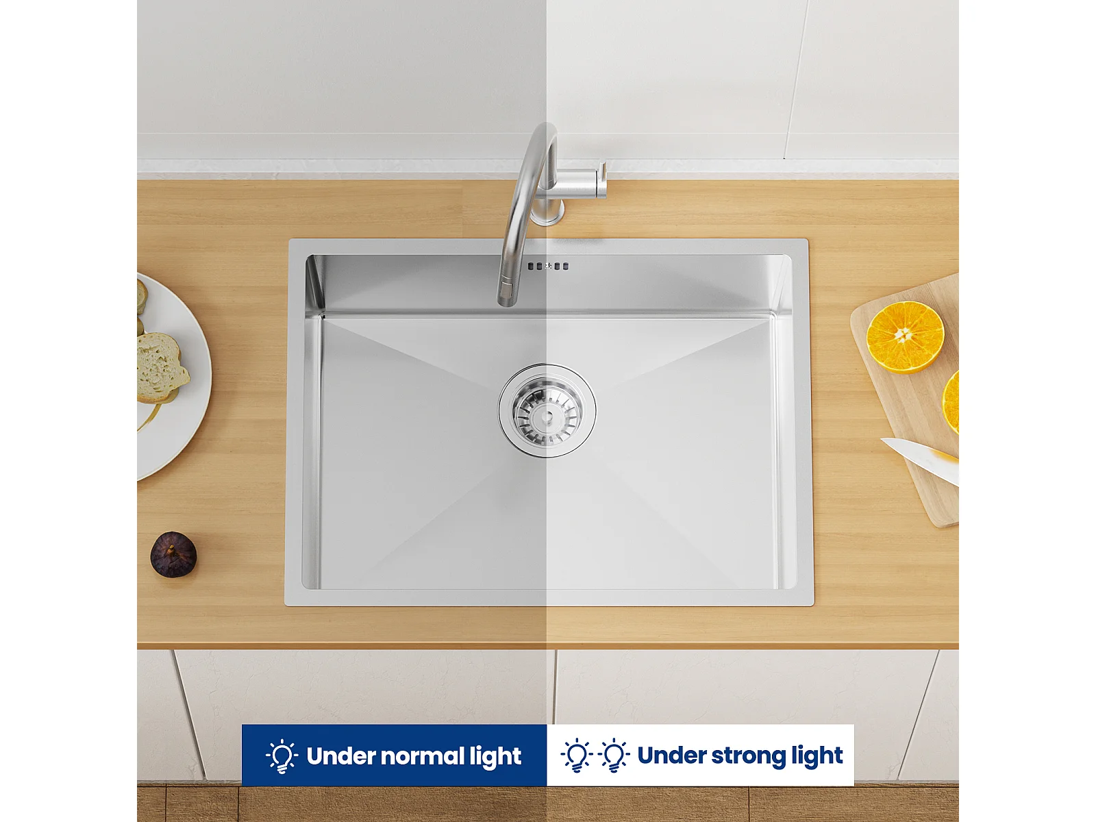 Auralum max Fregadero Cocina 1 Bandeja 60*44*20CM,Fregadero 1 Cubo Acero inoxidable 304,Fregadero empotrado/subplano aveC Cesta drenaje,Nano Silver