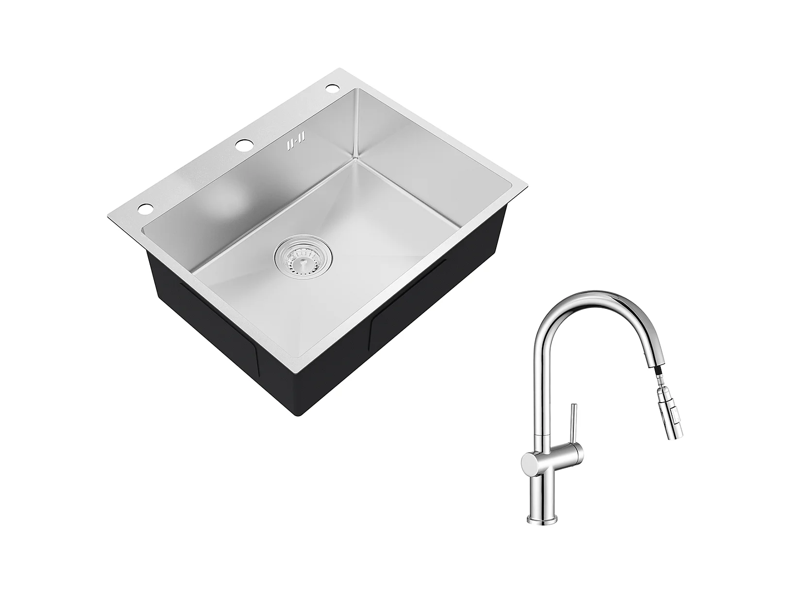 Auralum max Fregadero cocina empotrado,1 Bandeja,60*49*20CM, Fregadero de acero inoxidable 304,Silver+grifo de cocina retráctil dos funciones,cromado