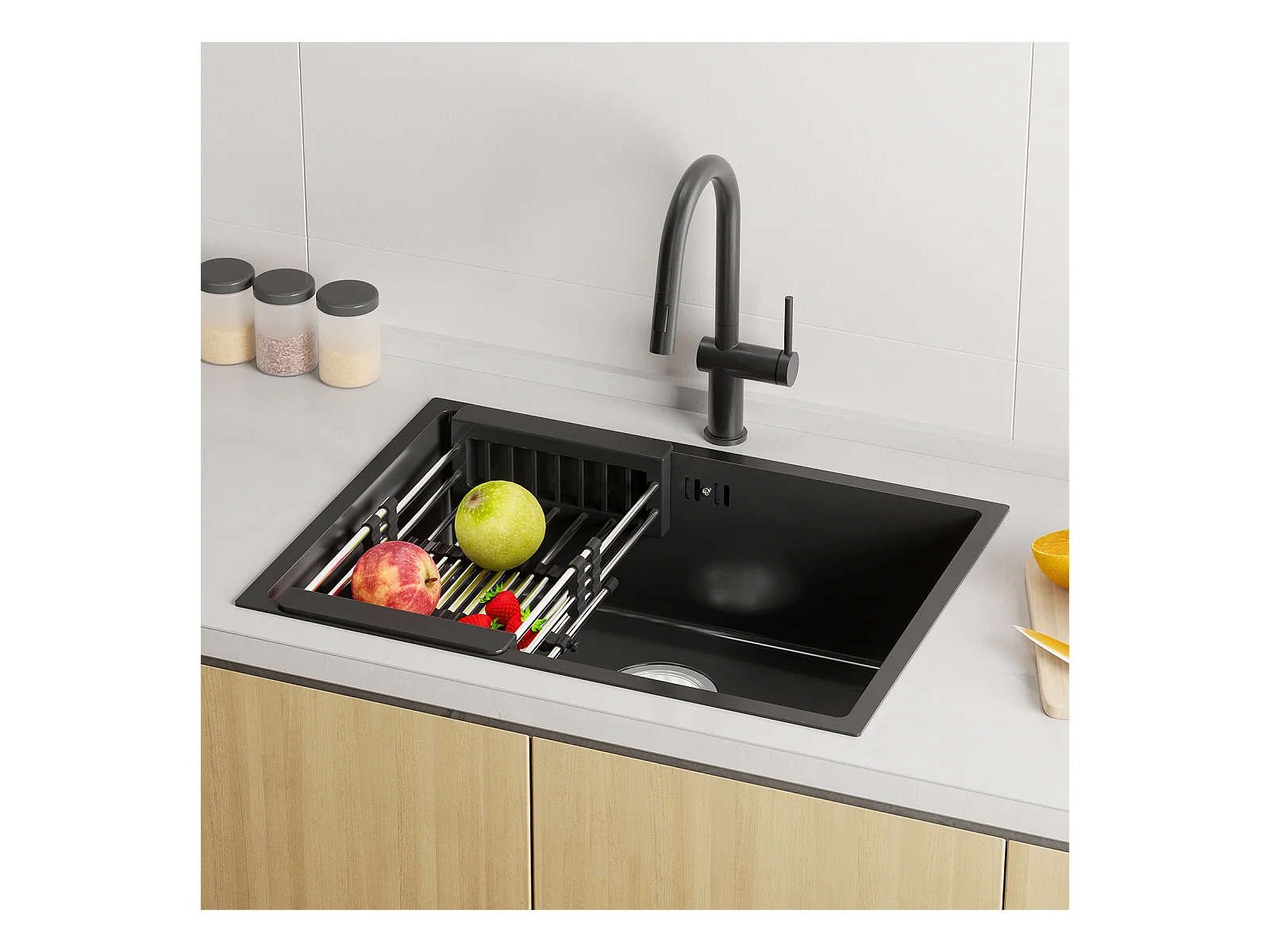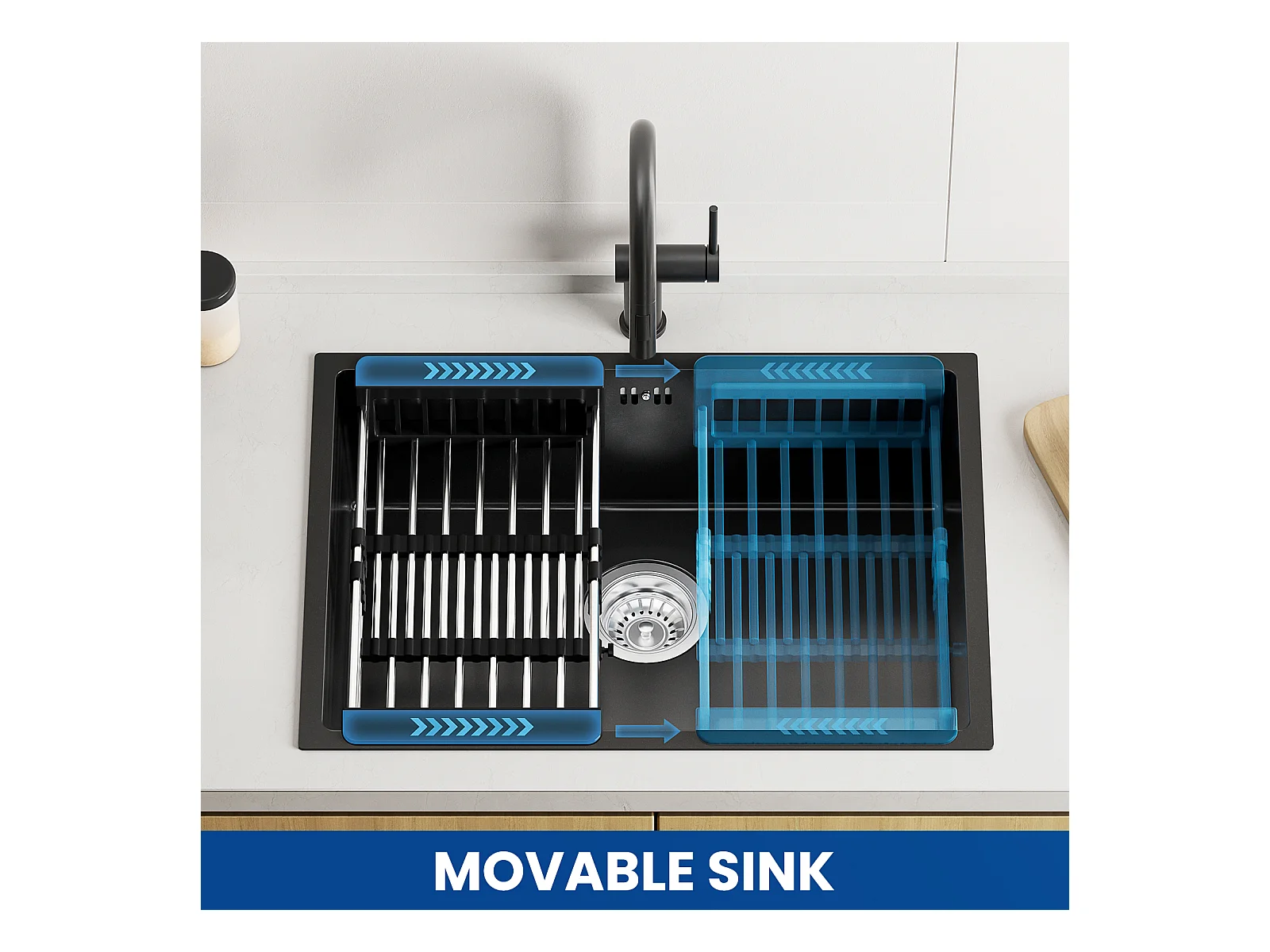 Auralum Max Fregadero Cocina 1Bandeja 60*44*20CM,acero inoxidable 304,subplano con Cesta drenaje,Negro+Grifo cocina retráctil de dos funciones,Negro