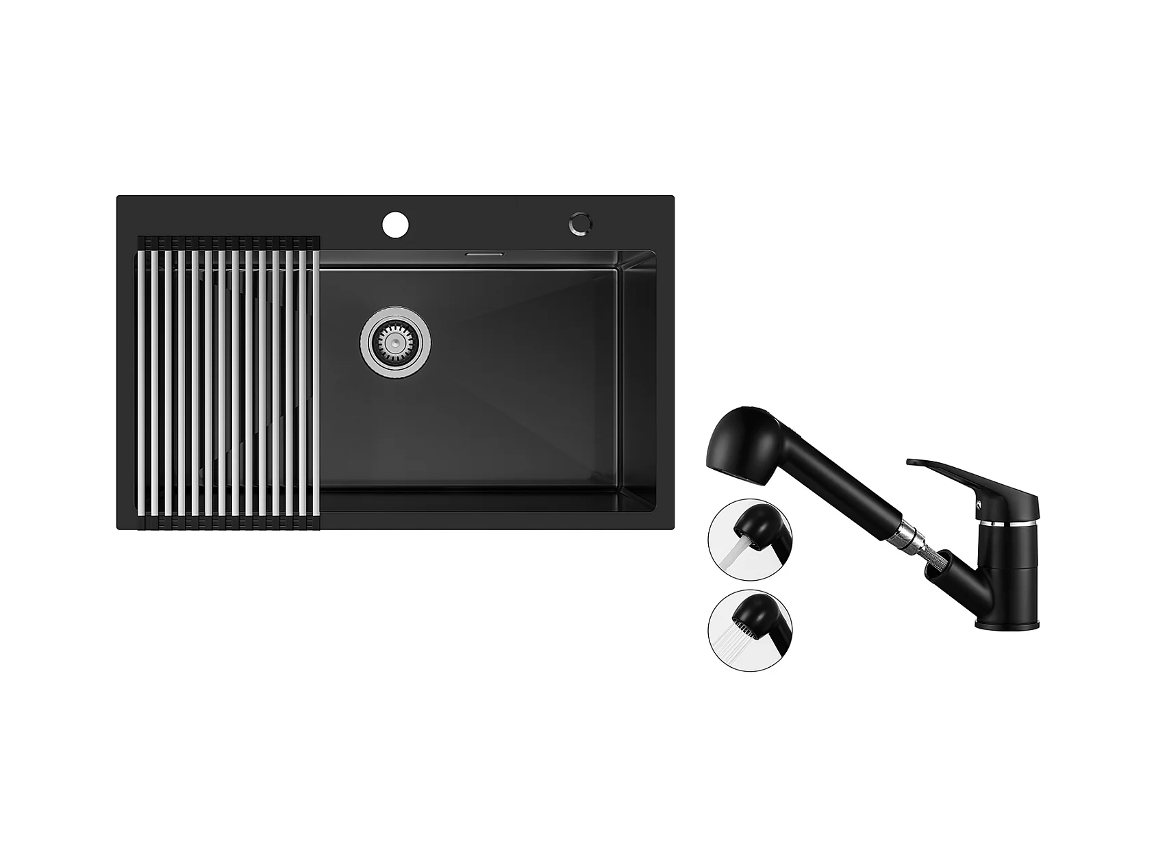 Auralum MAX Fregadero Cocina 1 Bandeja 75 x 45 cm, Fregadero Inox Negro con Escurridor Plegable+Grife Cocina Ducha Extragible Dos Jets ,Negro