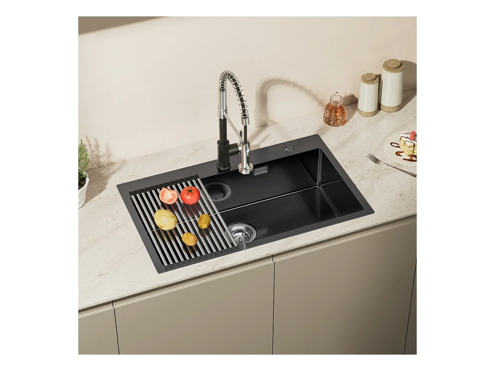 Fregadero Cocina 1Bandeja 75 x 45 cm,Fregadero Inox Negro con Escurridor Plegable+Mestillador Cocina Plegable Giratorio 360° Agua Fría Caliente,Negro