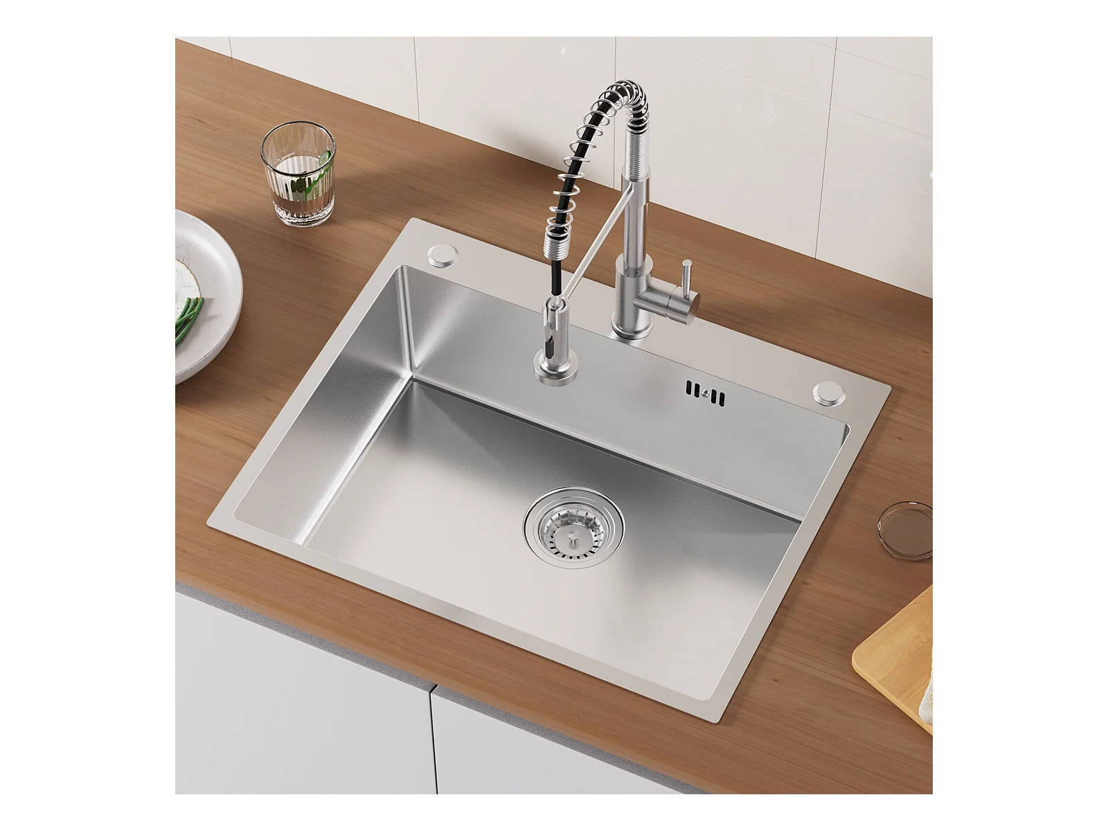 Auralum max Fregadero cocina empotrado,1 Bandeja,60*49*20CM, Fregadero de acero inoxidable 304,Silver+grifo de cocina retráctil dos funciones,cromado