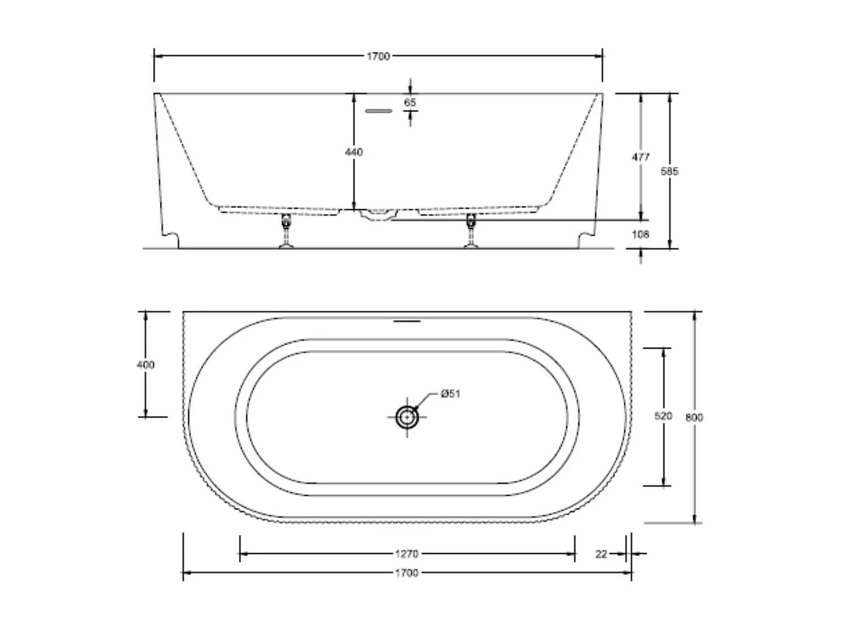 Bañera de pared STRIA de 170 cm con nervaduras acrílicas blancas