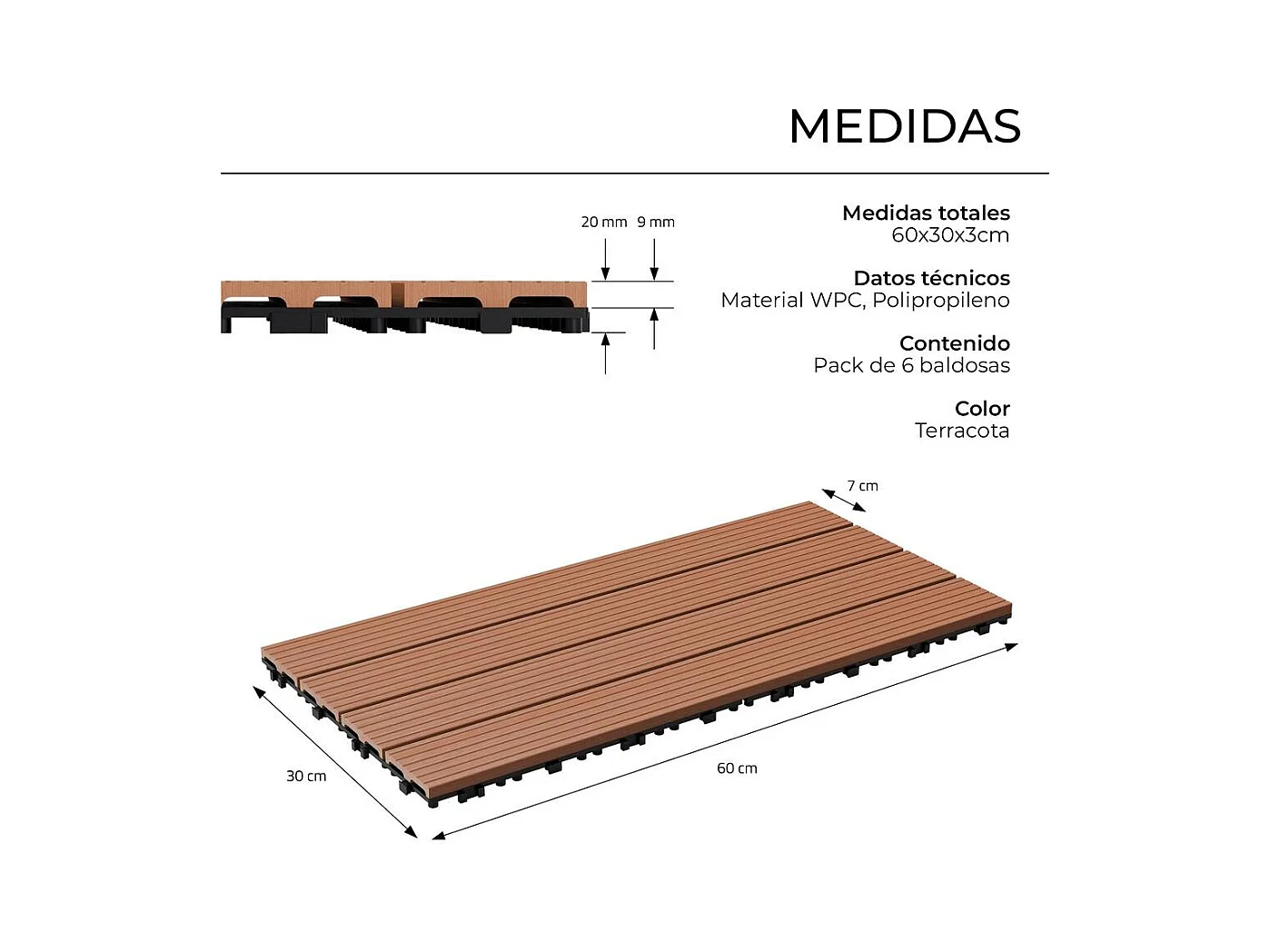 5m² Baldosas WPC 30 azulejos para exterior 60x30cm con sistema clic color teca